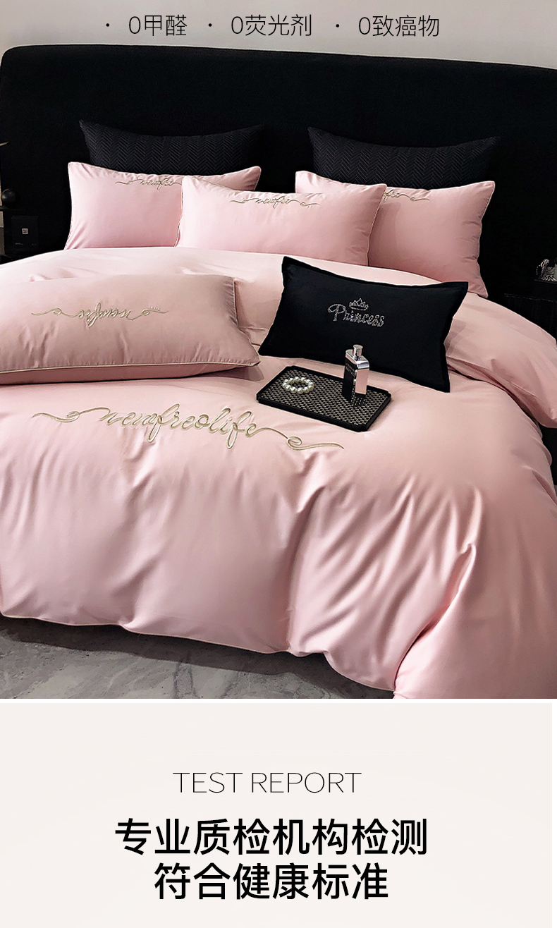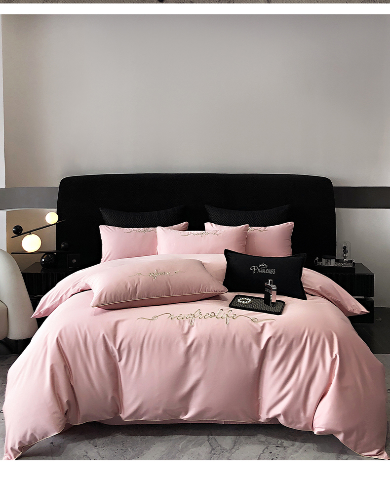 商品名称:禧澜庭 2025新款高支纯棉全棉斜纹四件套刺绣绣花款轻奢三件套--卡罗系列 戴妃粉