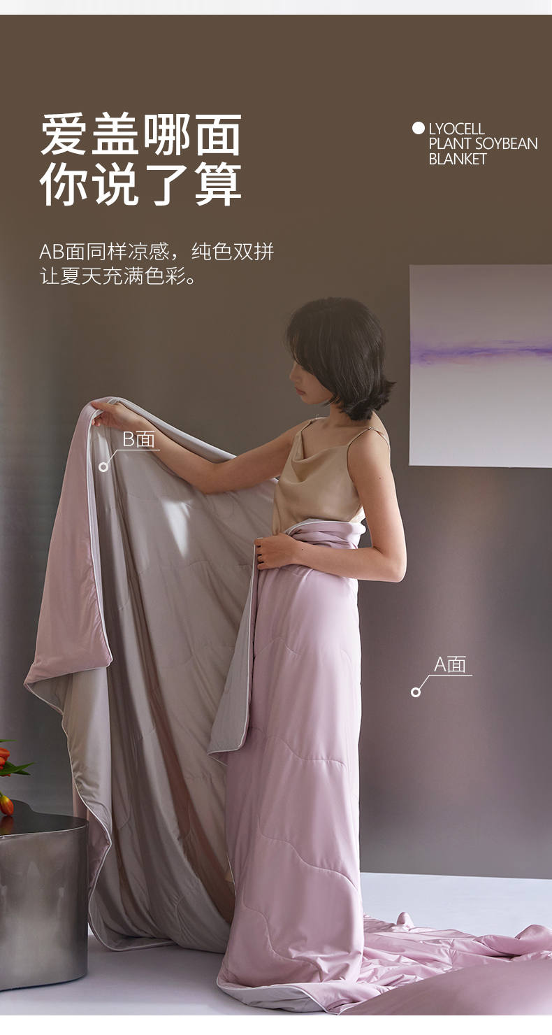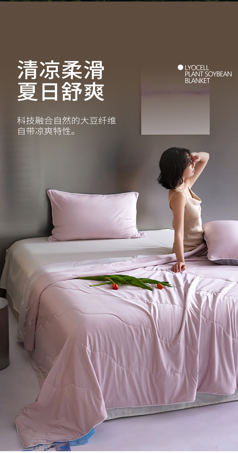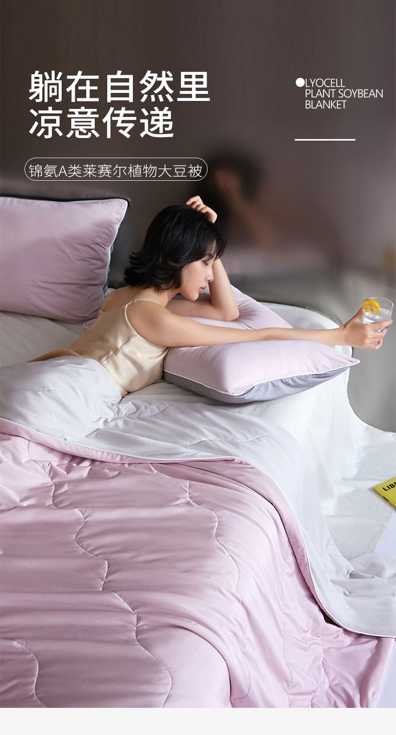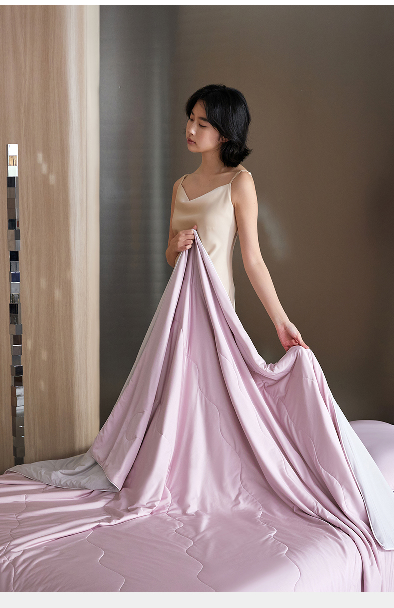 商品名称:头等舱 2025新款锦氨(165克)水光亮面锦A类55莱赛尔植物大豆7A抗菌夏凉被夏被(模特图) 水粉色+银灰
