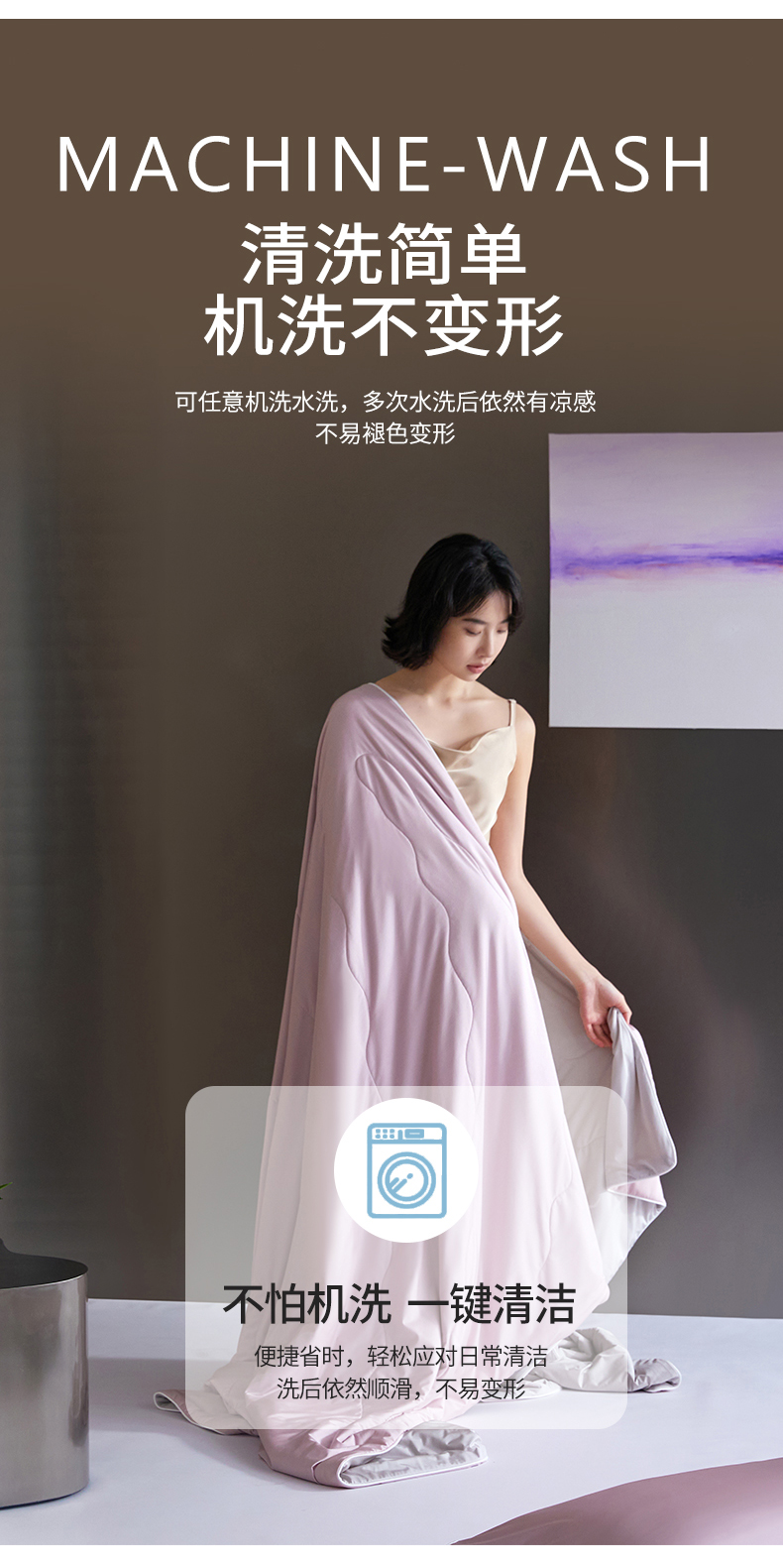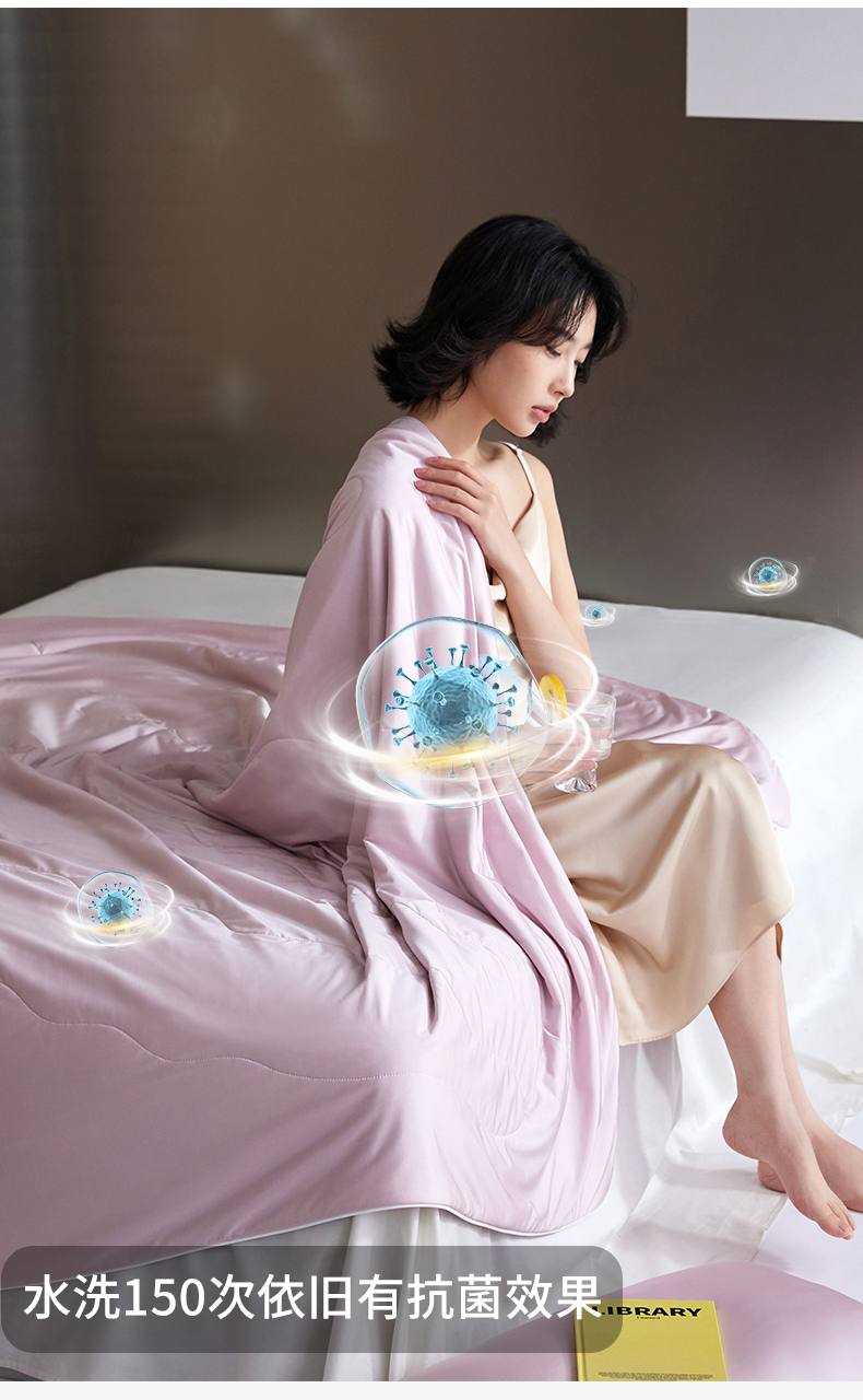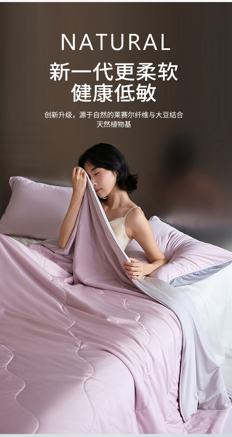 商品名称:头等舱 2025新款锦氨(165克)水光亮面锦A类55莱赛尔植物大豆7A抗菌夏凉被夏被(模特图) 水粉色+银灰