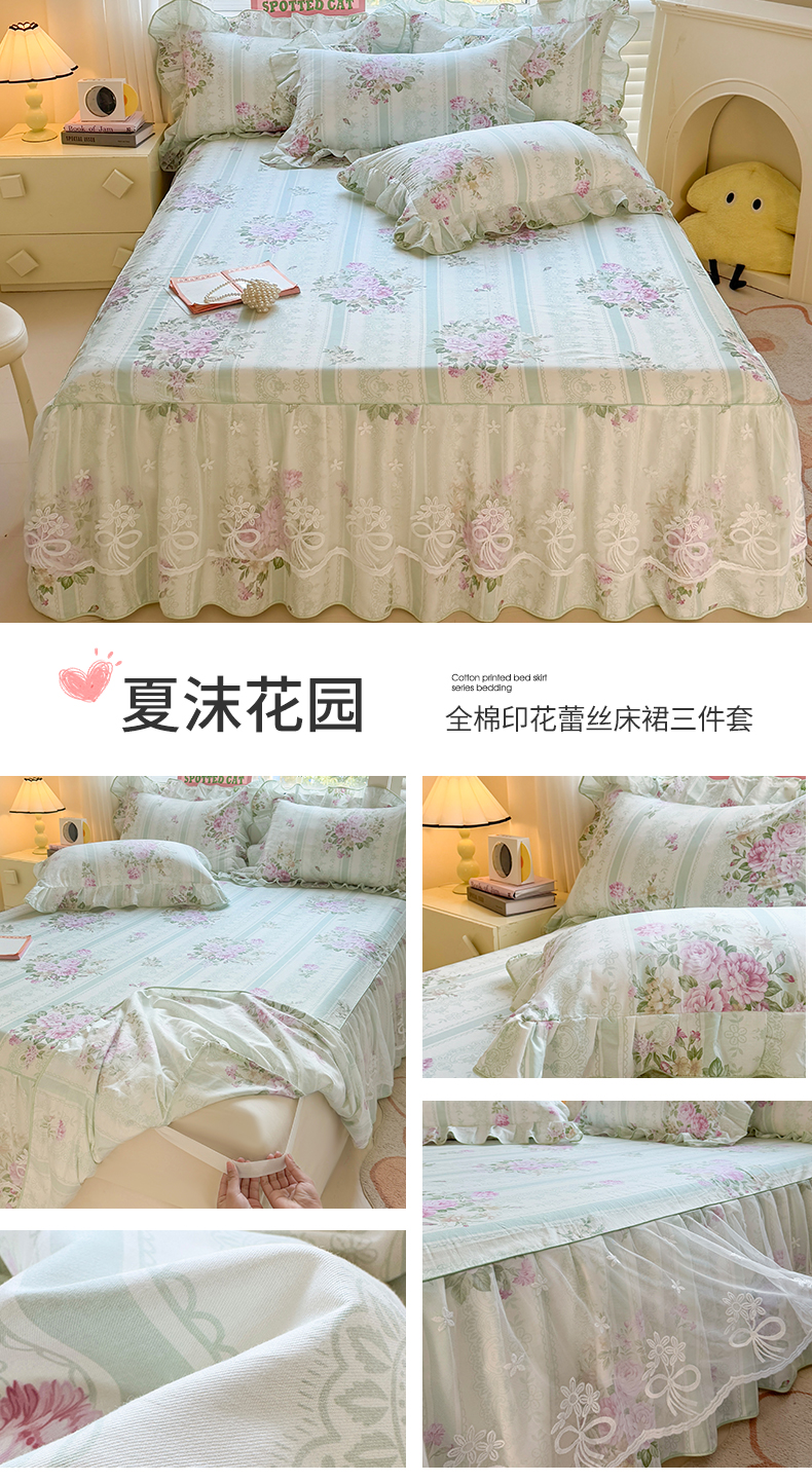 当前位置: 91家纺网 > 商品网购 > 床品套件 > 四件套 > 全棉普通四件套 > 宜凡家纺 2025新款全棉蕾丝花边床裙三件套 夏沫花园