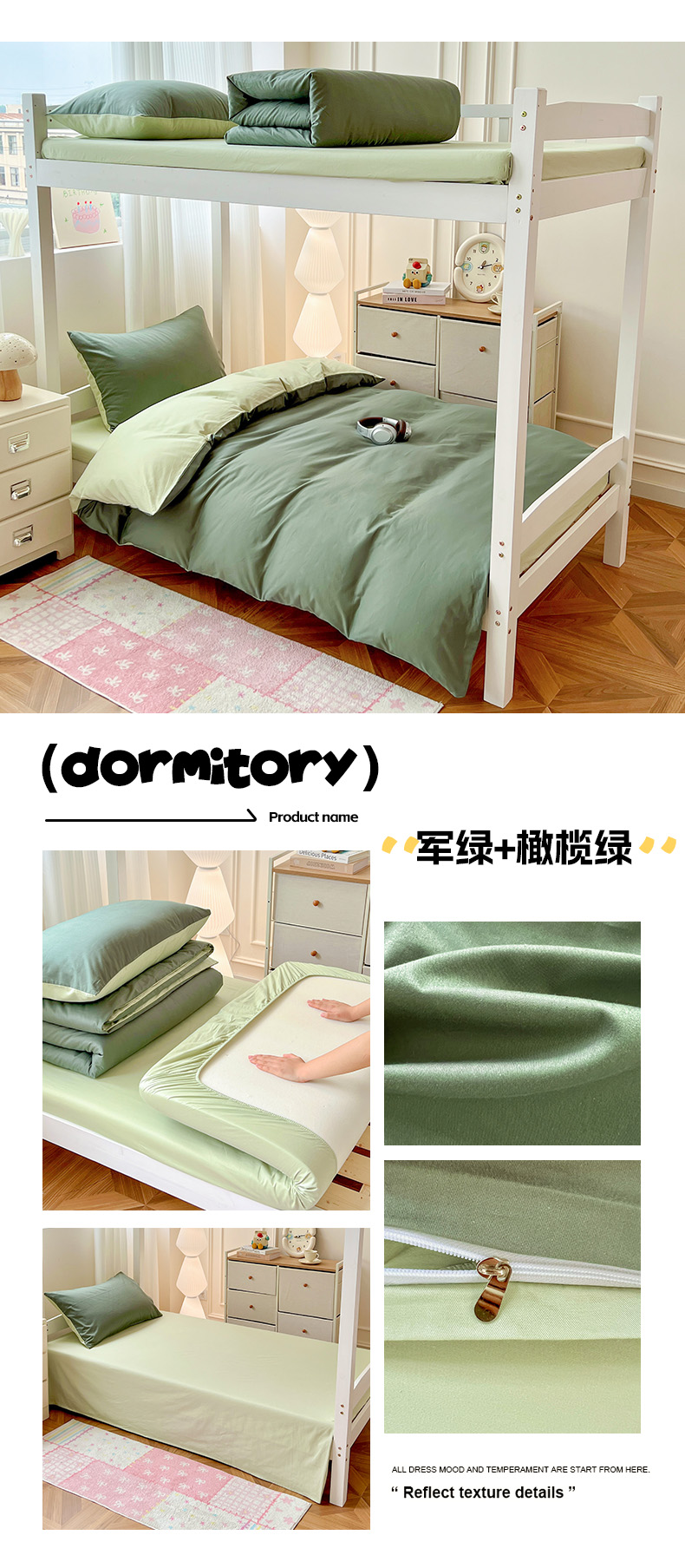 商品名称:泽西家纺 2025新款A类加密全棉40支13376简约风宿舍双拼纯色纯棉学生三件套 军绿+橄榄绿