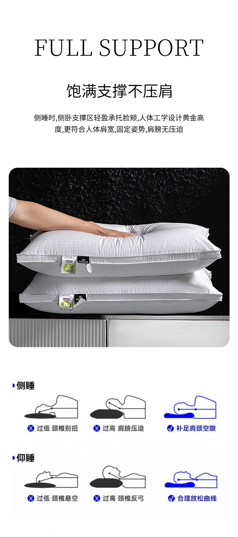 当前位置: 91家纺网 > 商品网购 > 枕头/枕芯/保健枕/颈椎枕 > 普通枕芯 > 蝶飞舞 2025新款五星酒店全棉缎条鹅毛枕头枕芯 靓白 1200g
