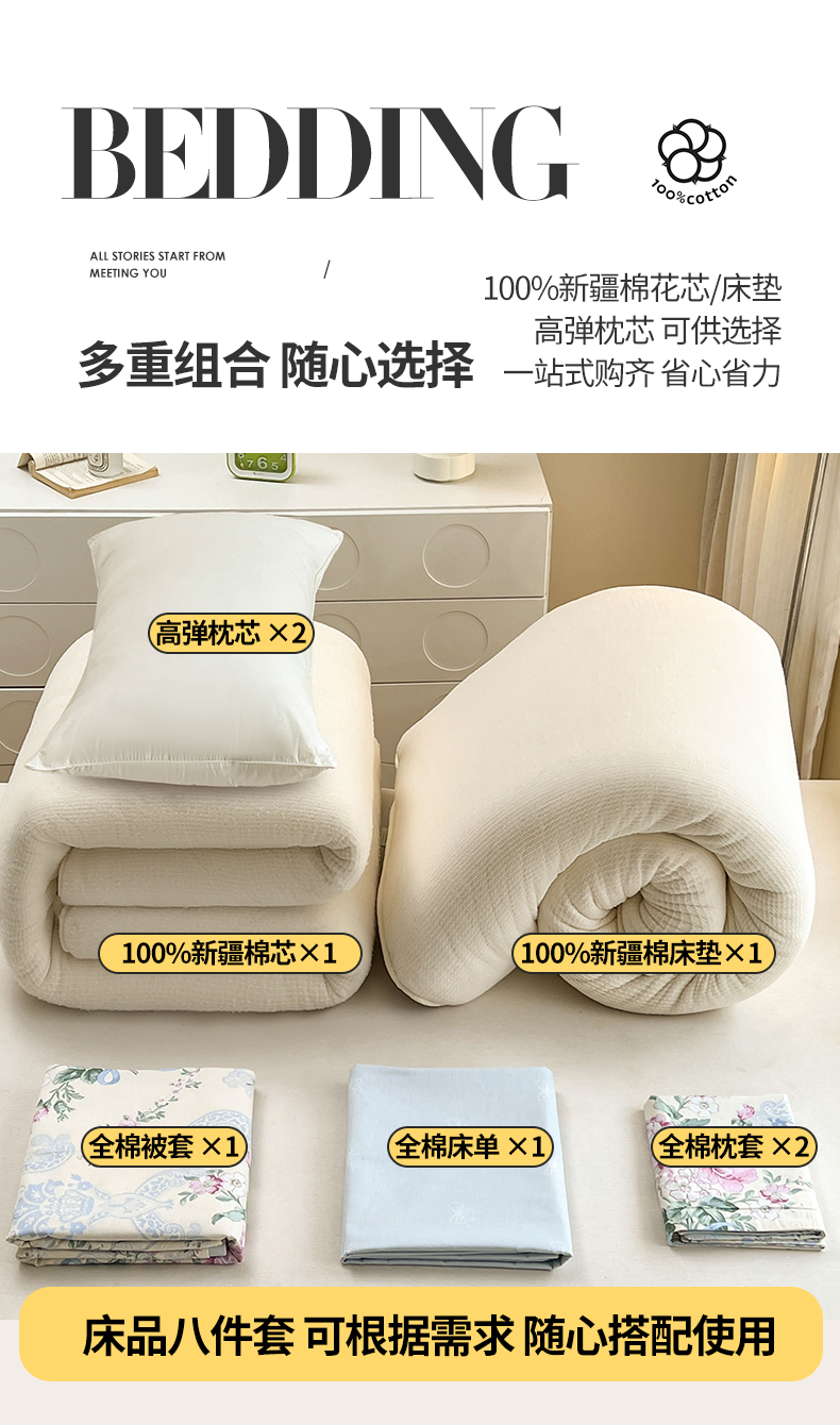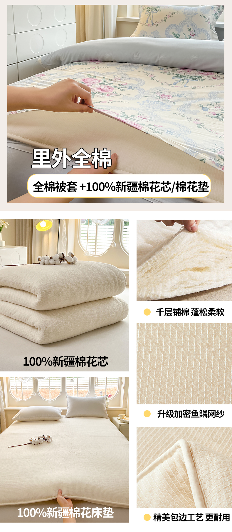 商品名称:西域种棉人·千百笠 2025新款全棉纯棉大学生宿舍100%新疆棉花被子被褥一整套枕头床垫三件套六件套 古典花束