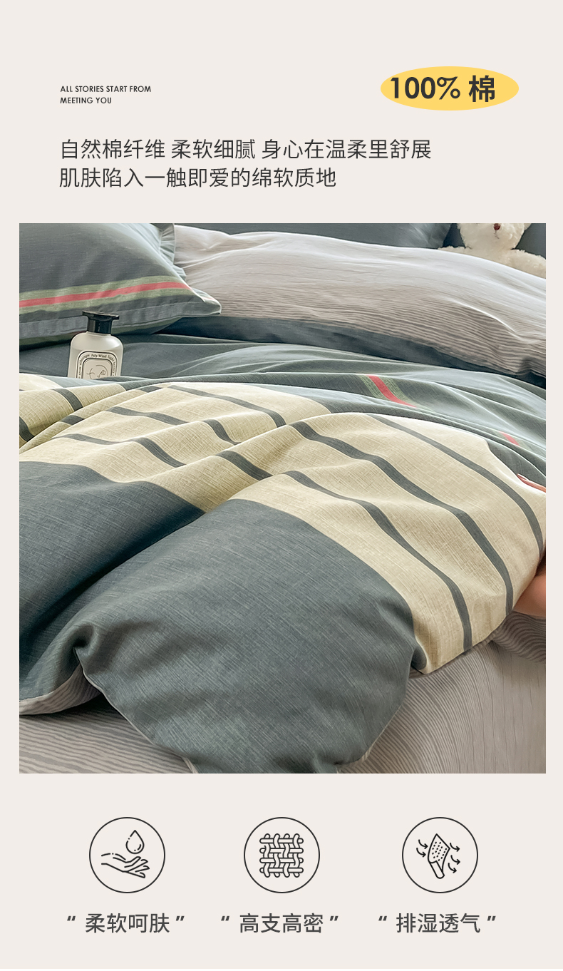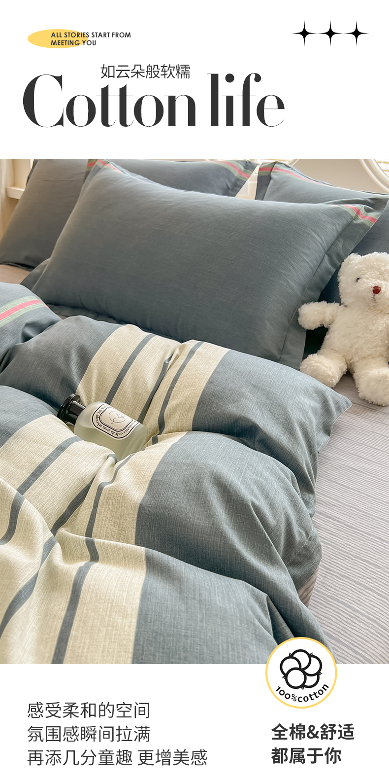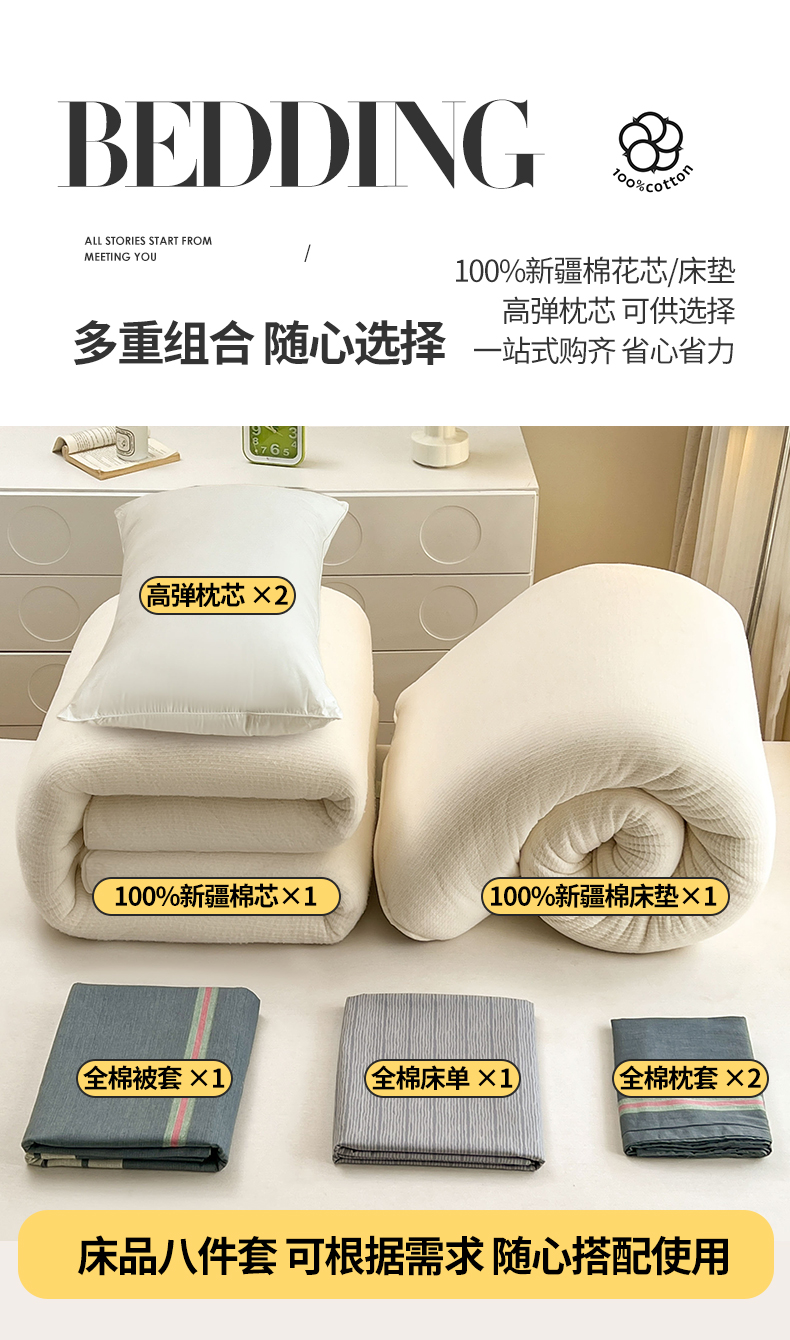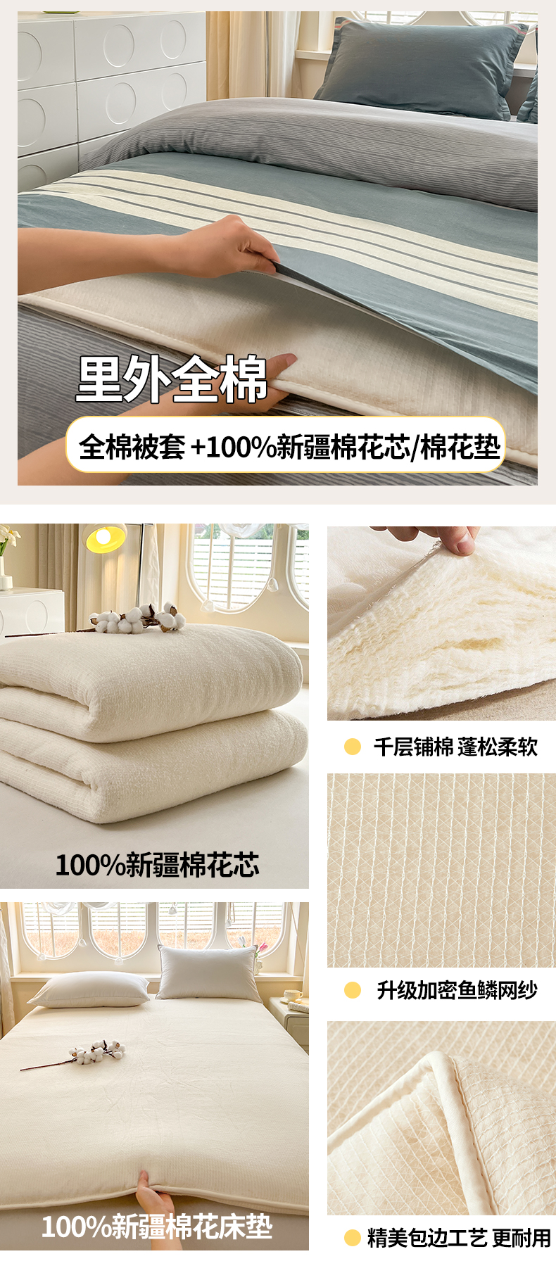 商品名称:西域种棉人·千百笠 2025新款全棉纯棉大学生宿舍100%新疆棉花被子被褥一整套枕头床垫三件套六件套 时尚条纹
