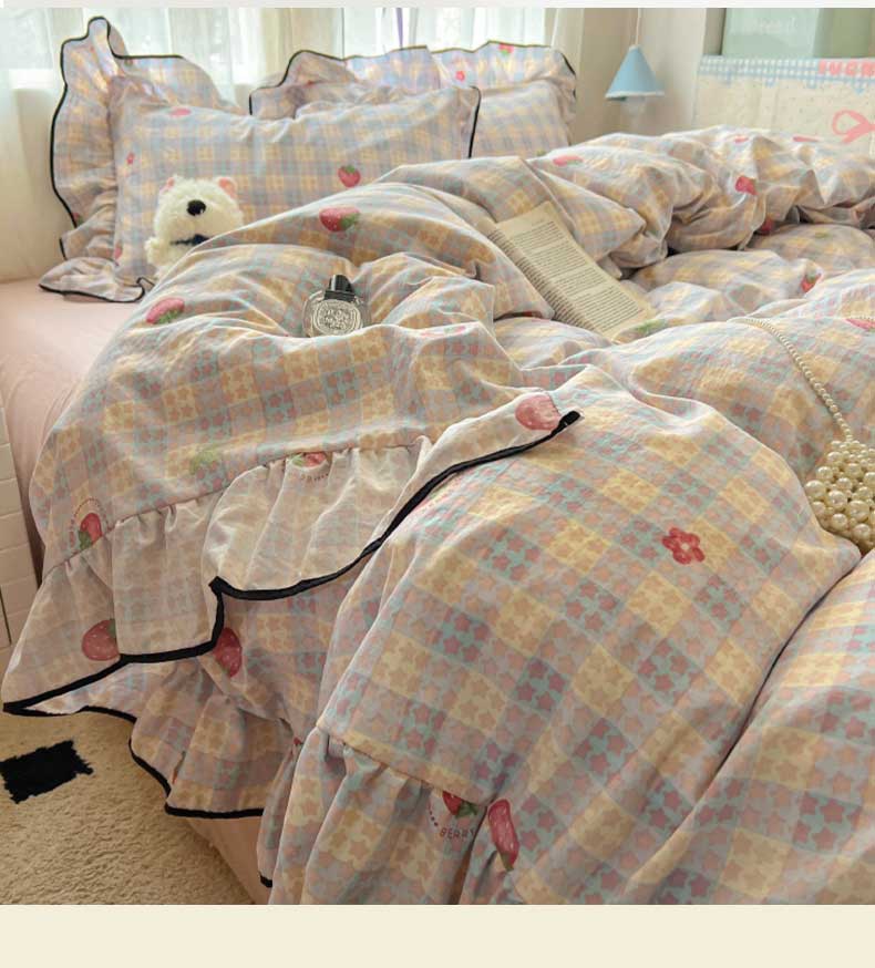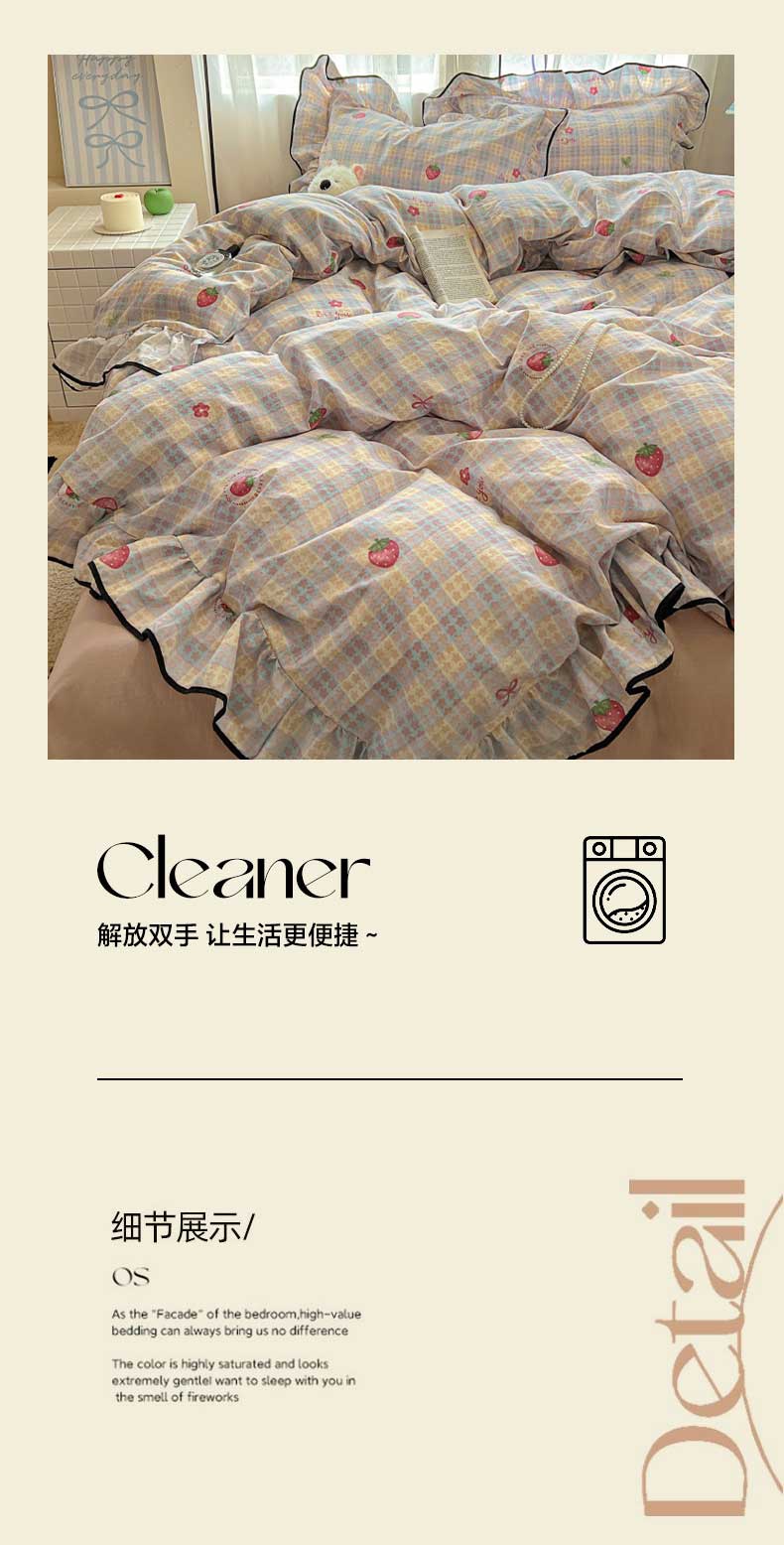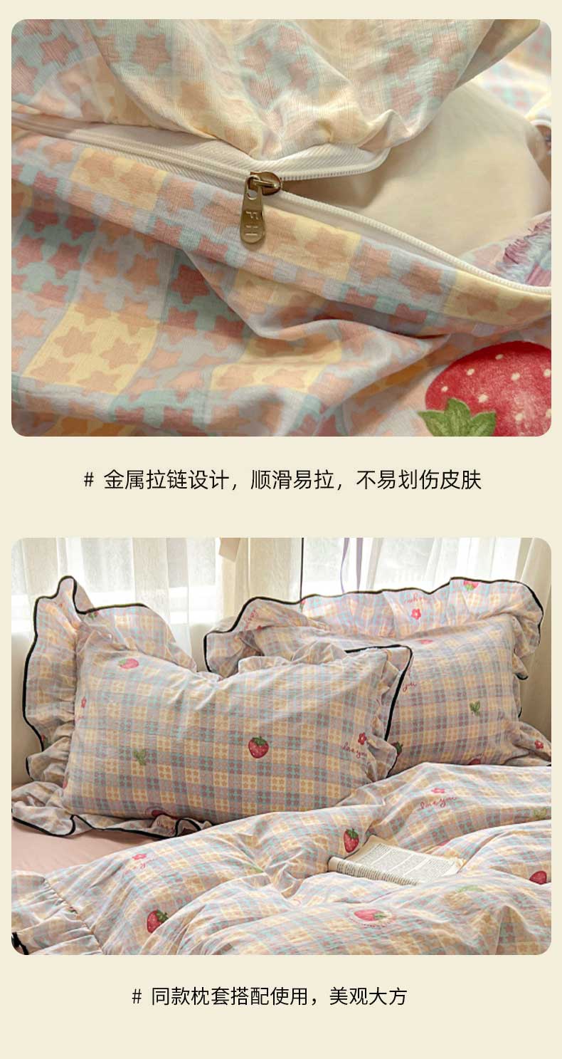 当前位置: 91家纺网 > 商品网购 > 床品套件 > 四件套 > 其它四件套 > 繁花家居 2025新款学生季韩式云感针织棉大花边木耳边四件套 富山草莓