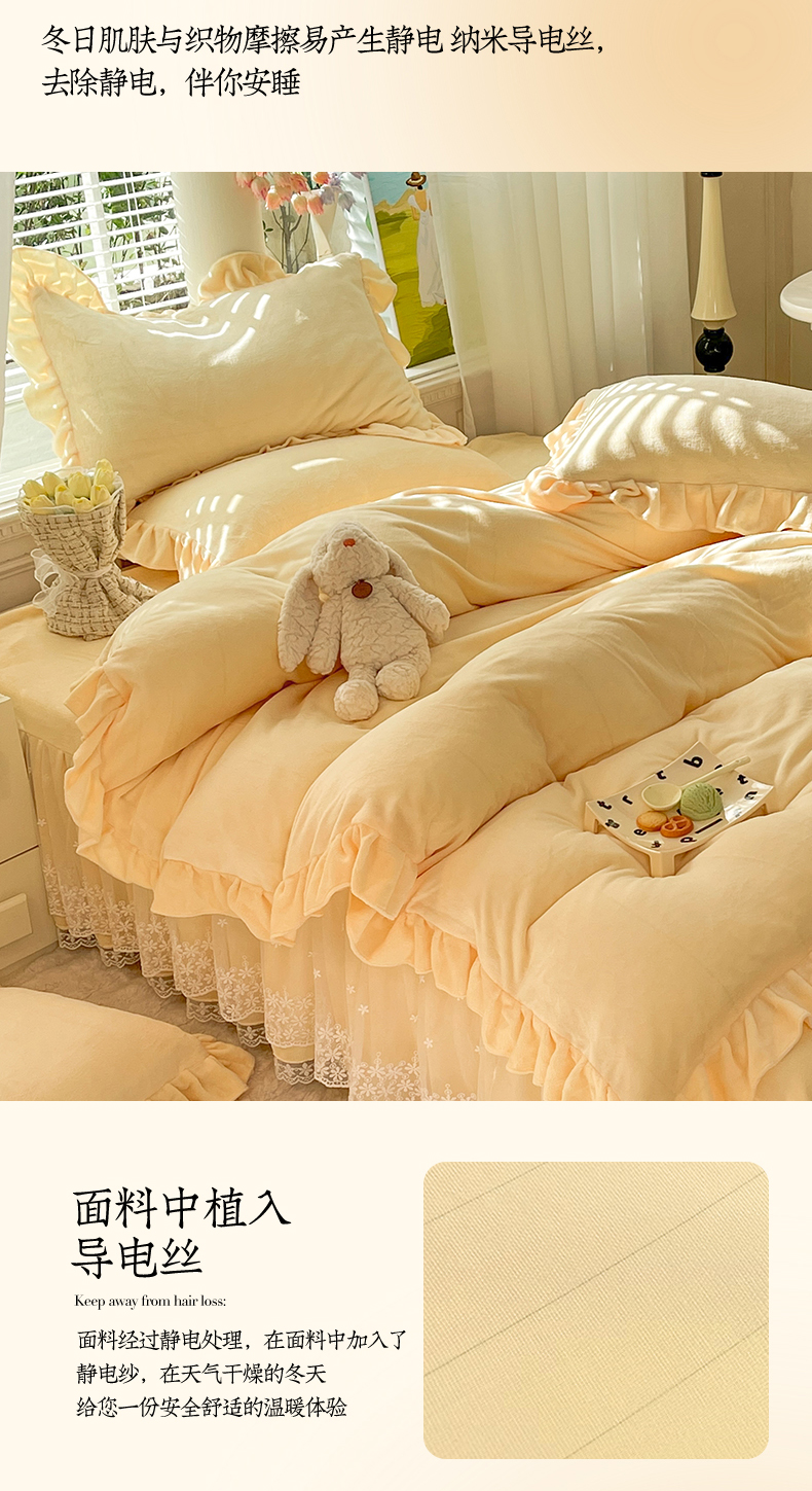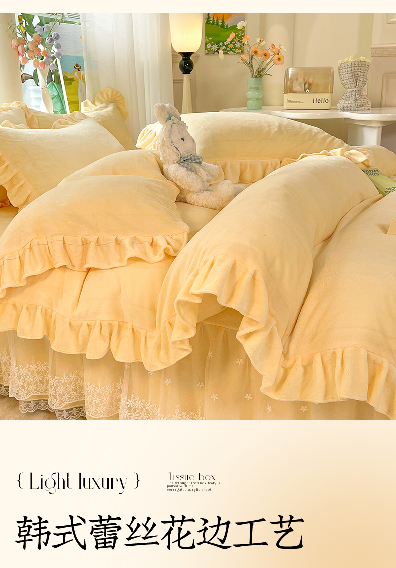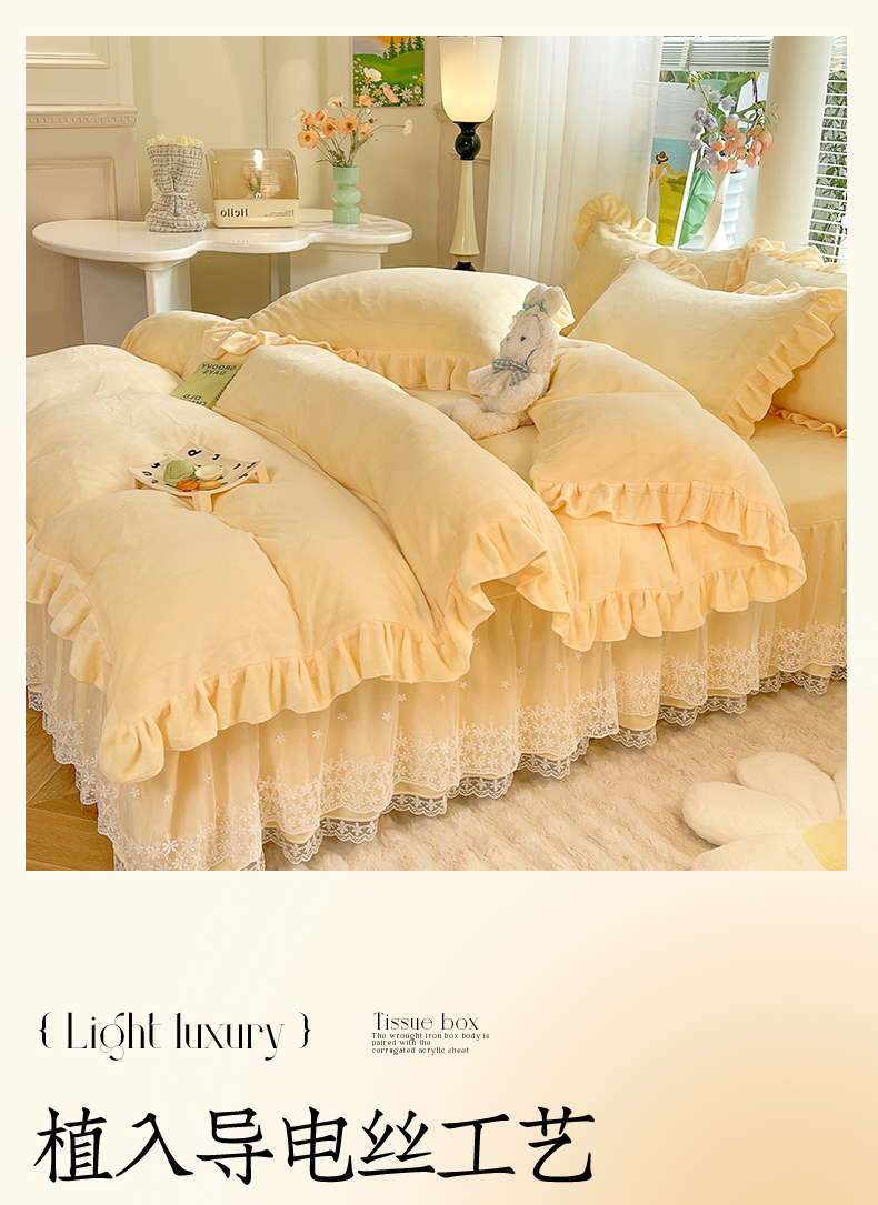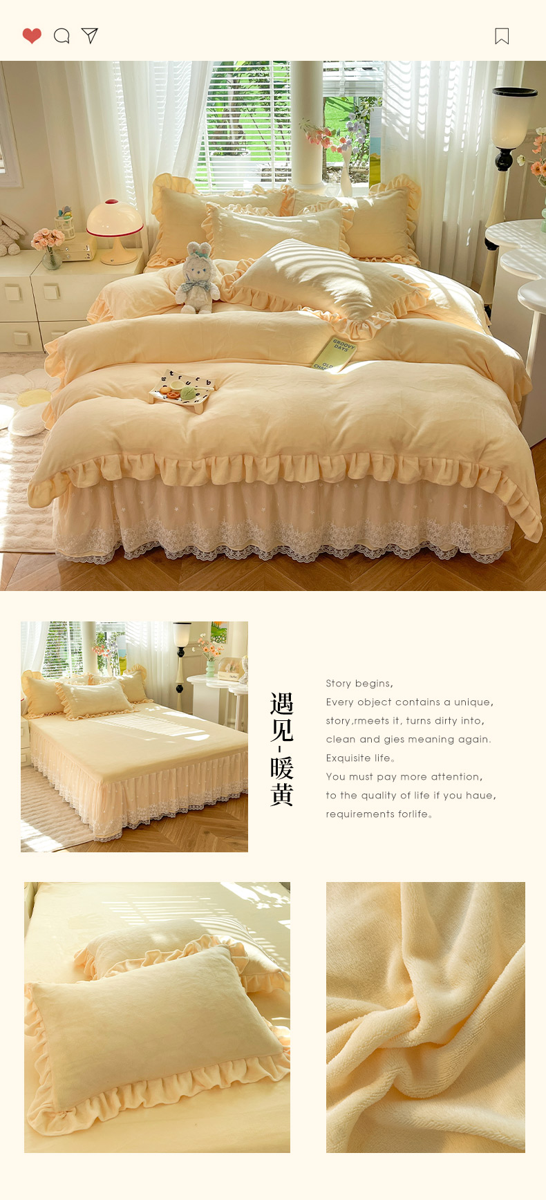 商品名称:【8斤重】2025新款秋冬加厚牛奶绒床裙款四件套法式浪漫蕾丝花边工艺-遇见系列 遇见-暖黄