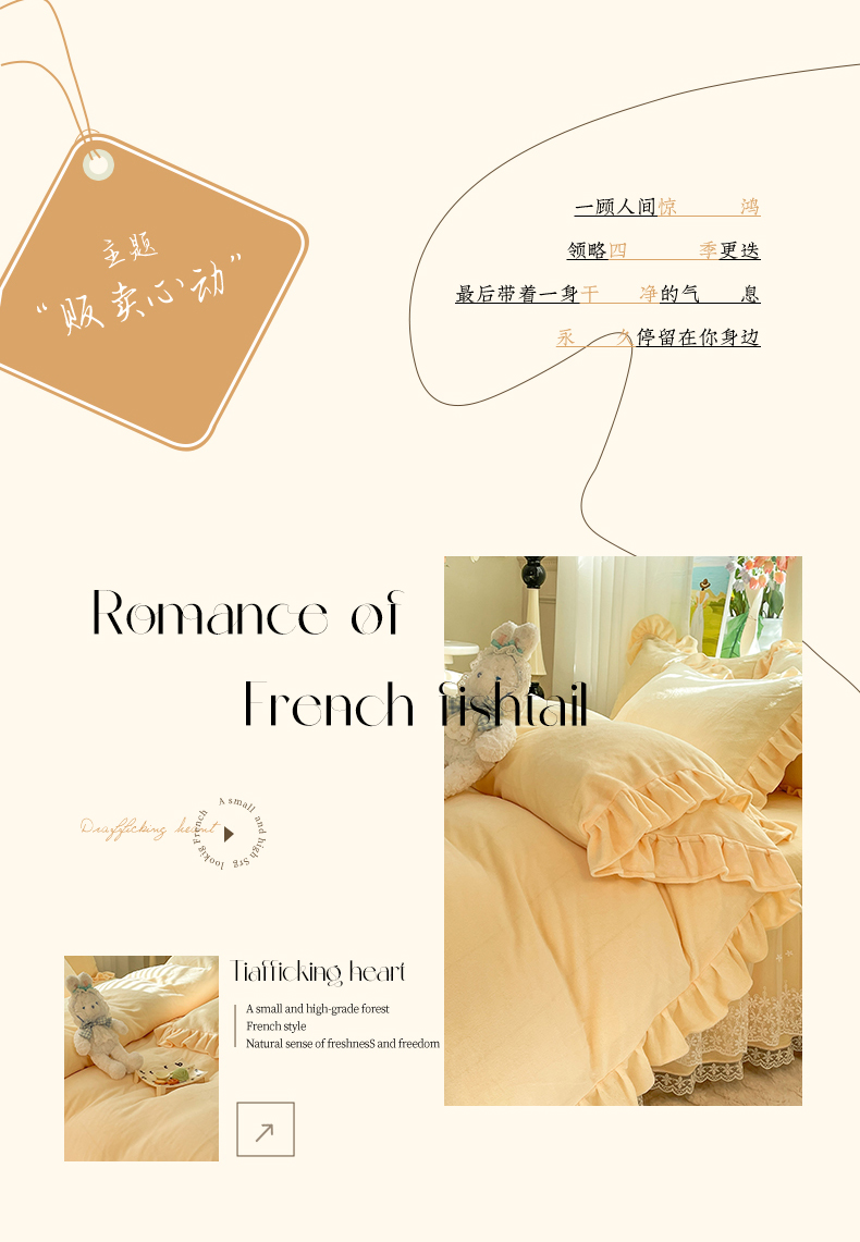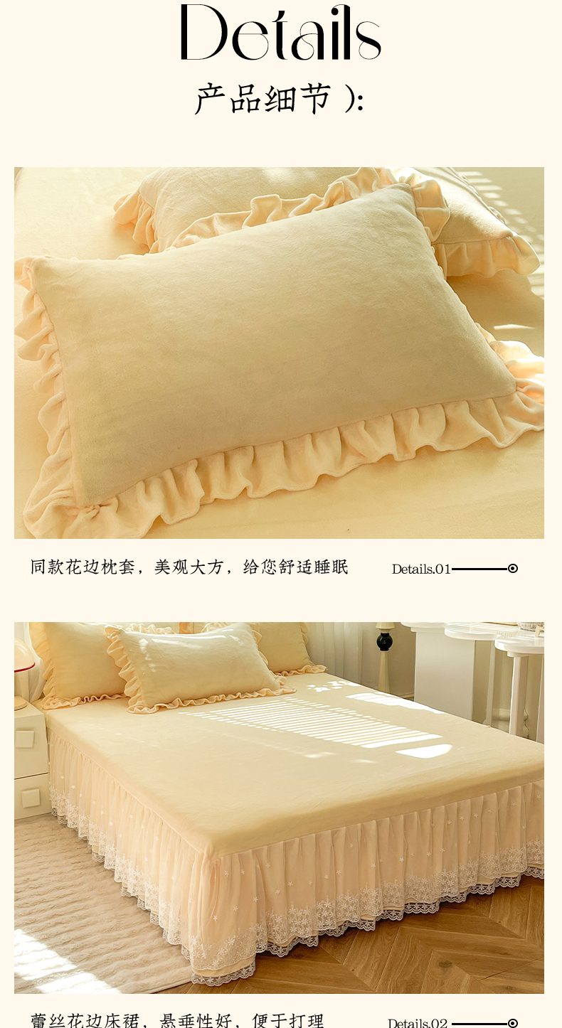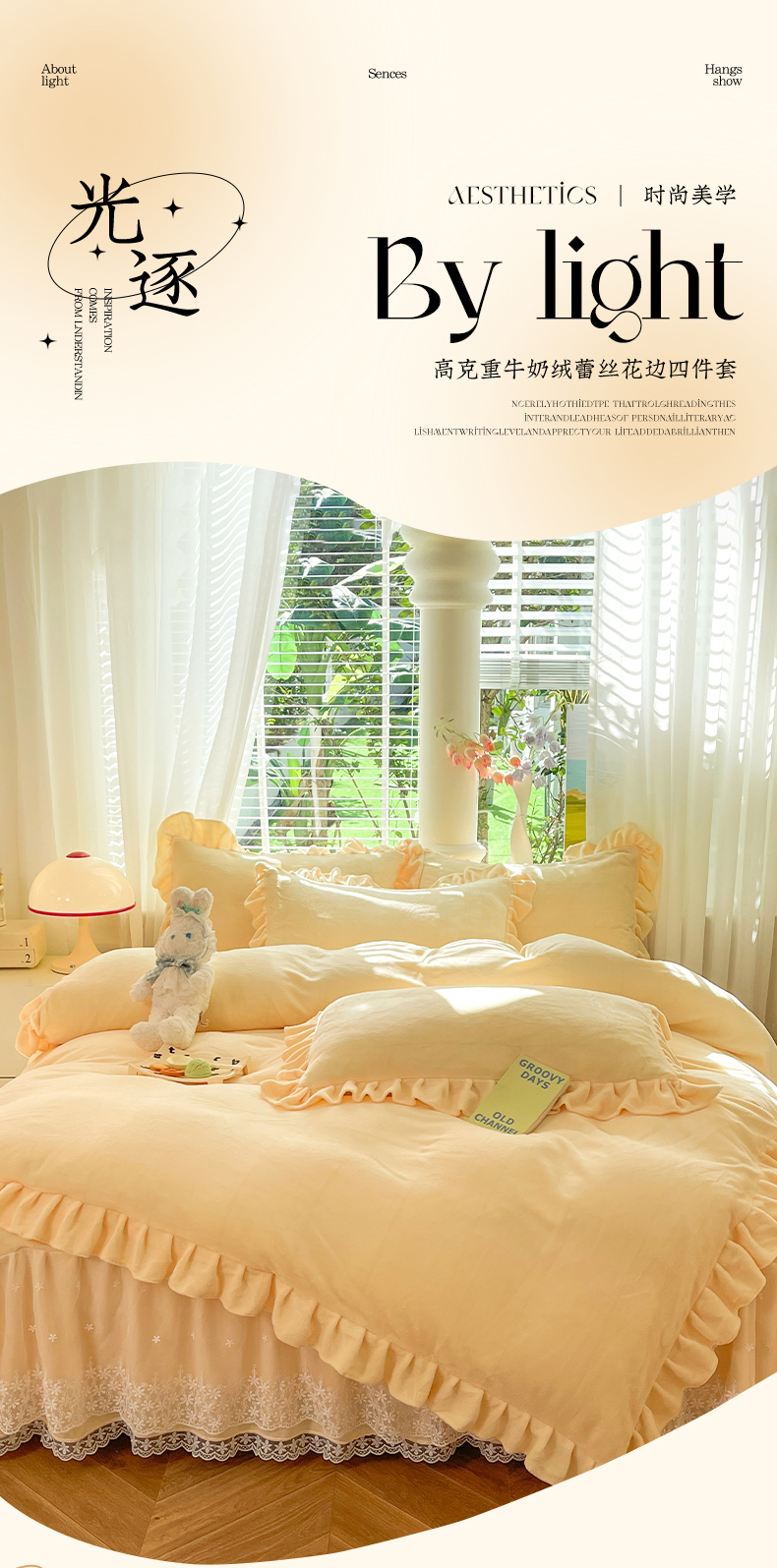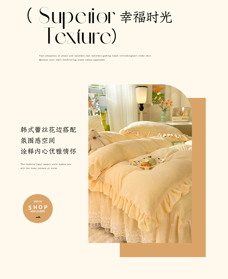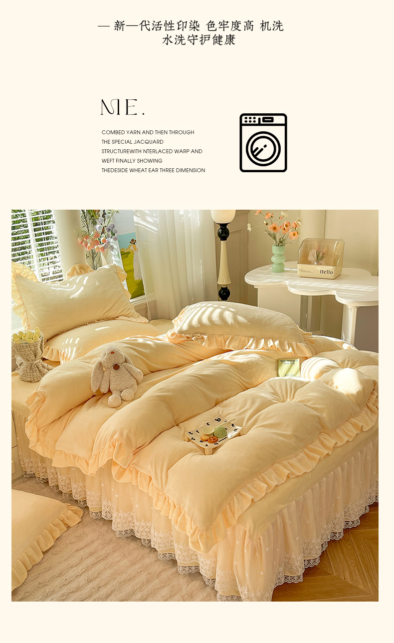 商品名称:【8斤重】2025新款秋冬加厚牛奶绒床裙款四件套法式浪漫蕾丝花边工艺-遇见系列 遇见-暖黄