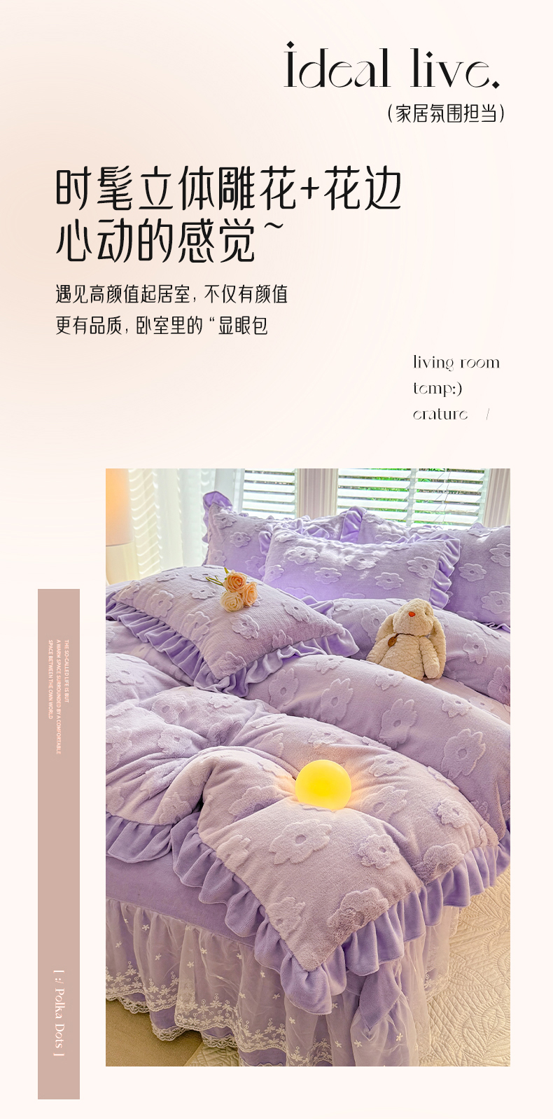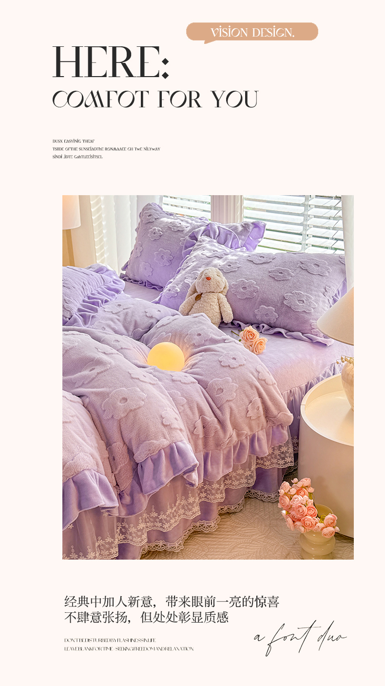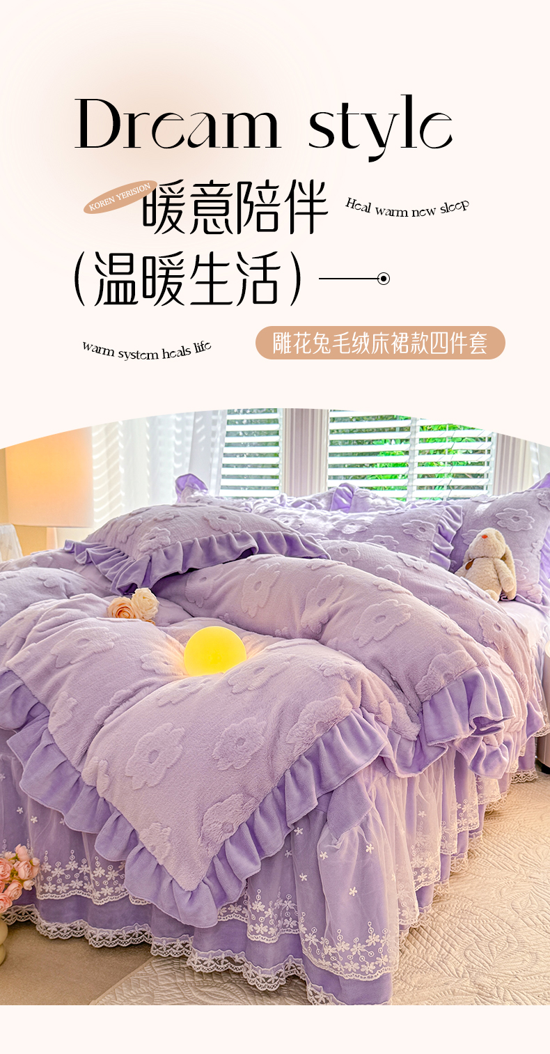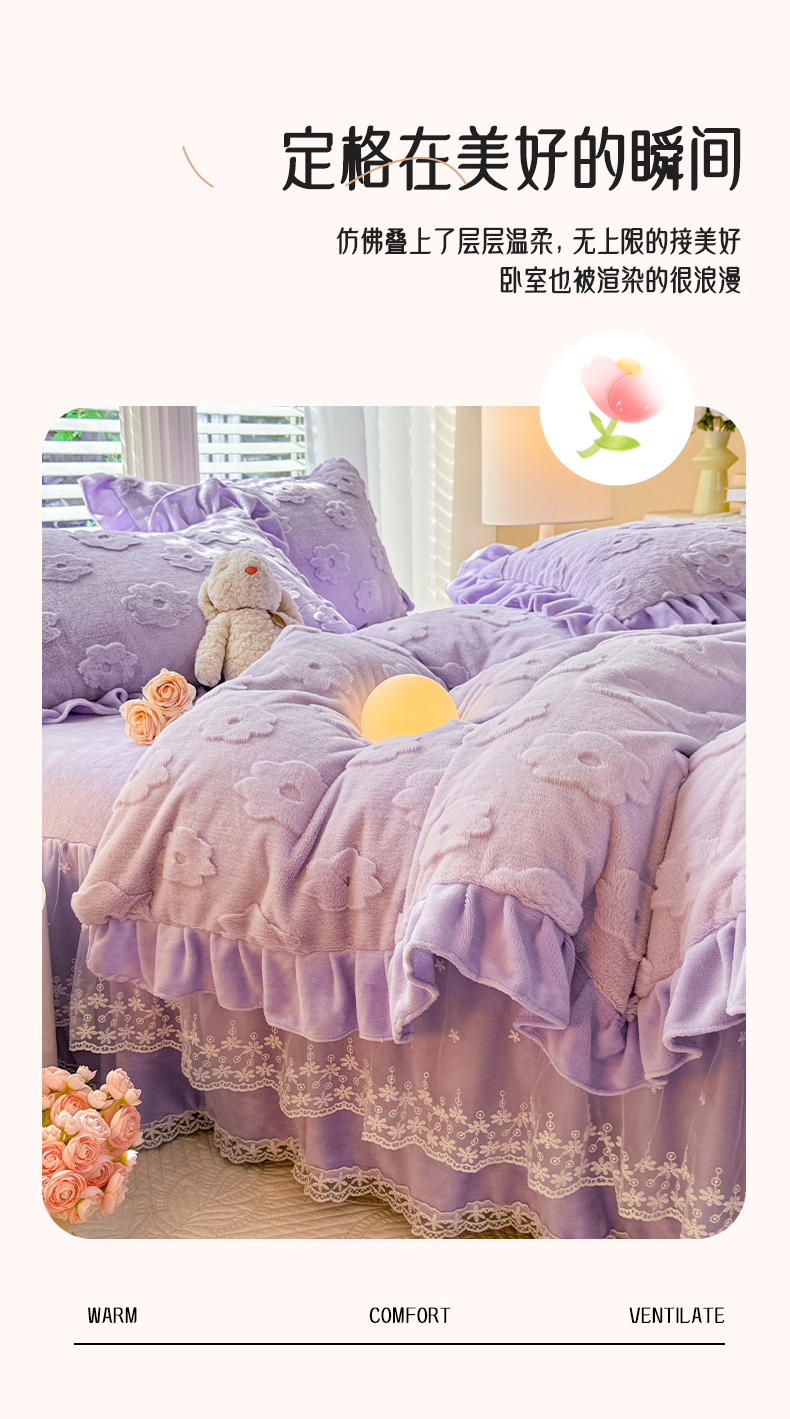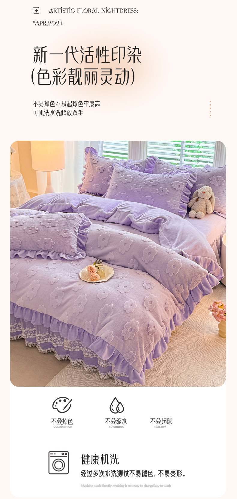 商品名称:唐人居 2025新款雕花花边兔毛绒床裙四件套 花儿朵朵-紫色
