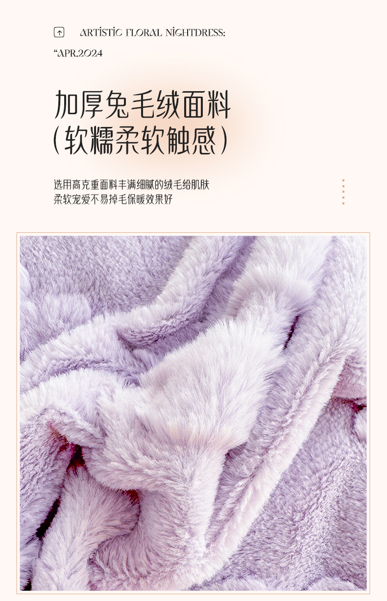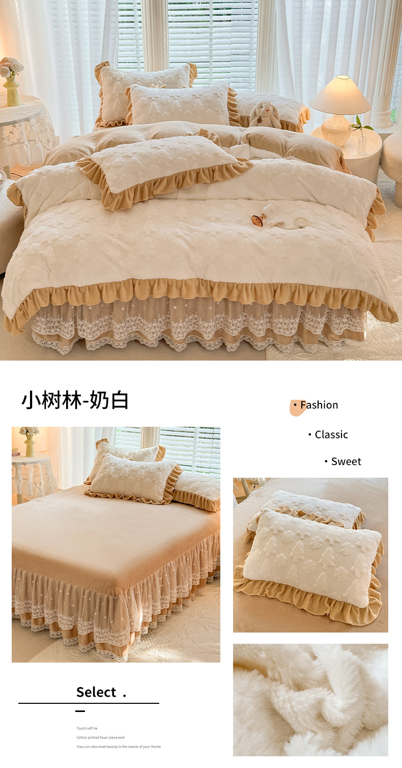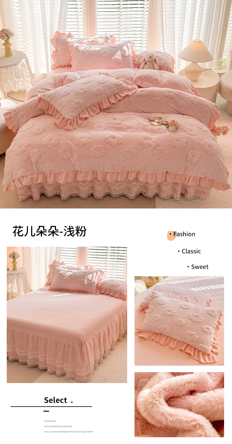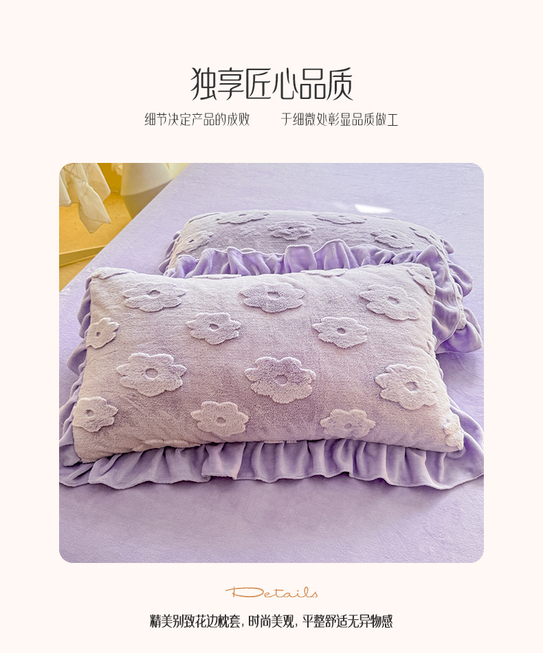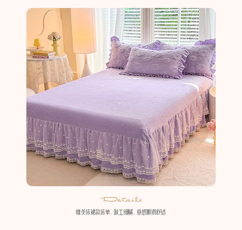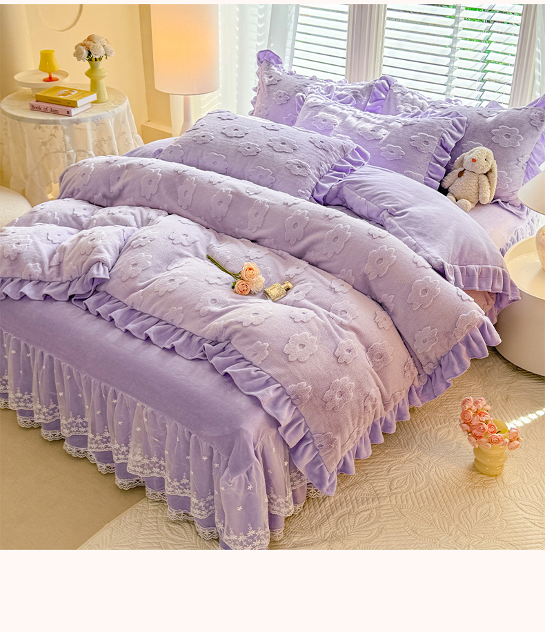 商品名称:唐人居 2025新款雕花花边兔毛绒床裙四件套 花儿朵朵-紫色