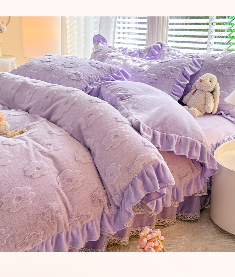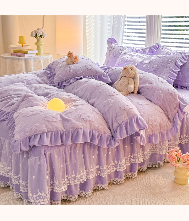 唐人居 2025新款雕花花边兔毛绒床裙四件套 花儿朵朵-紫色