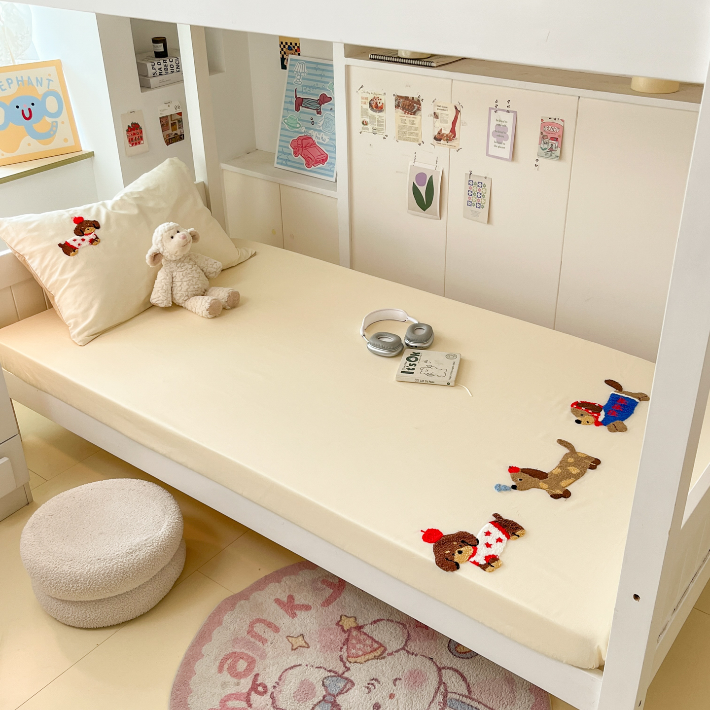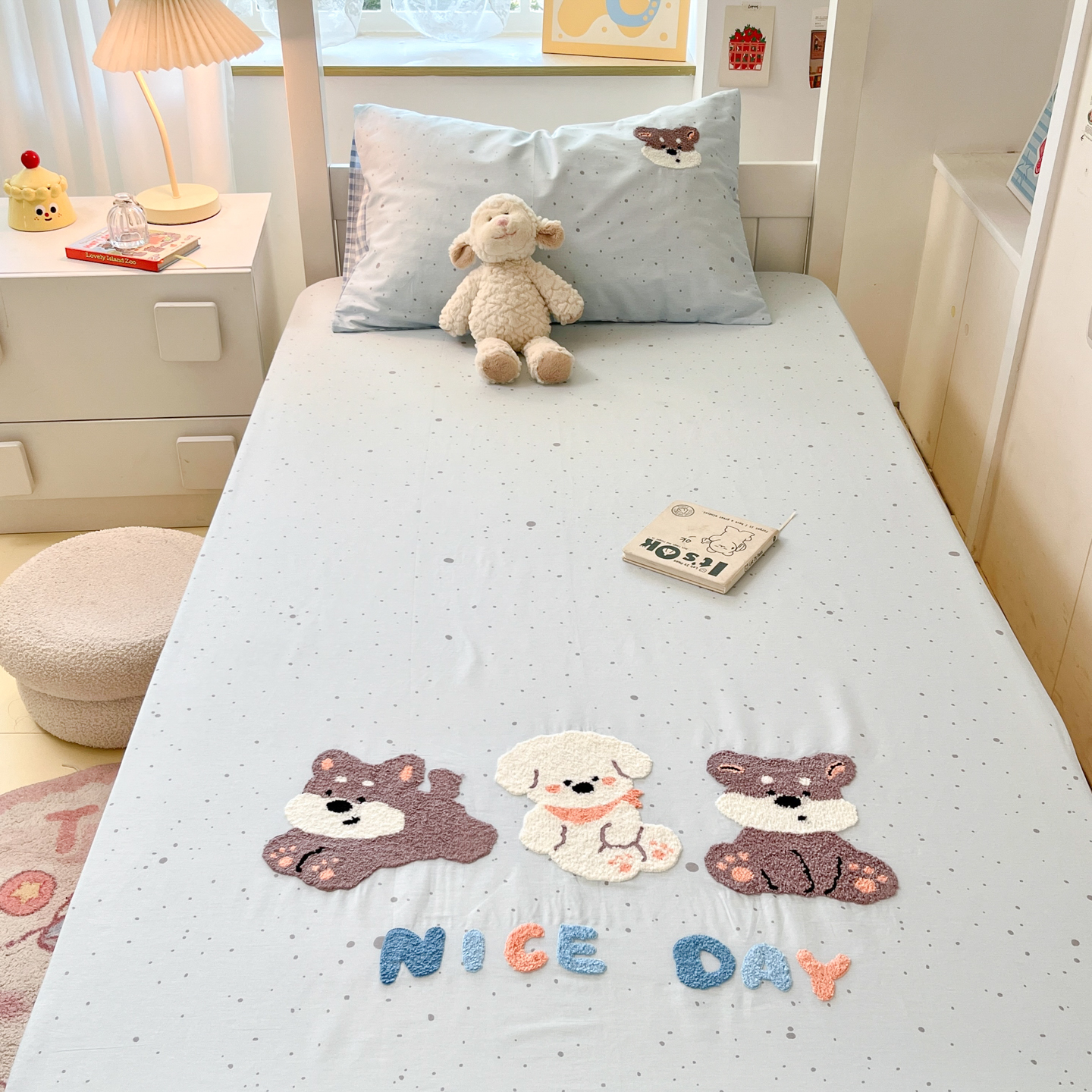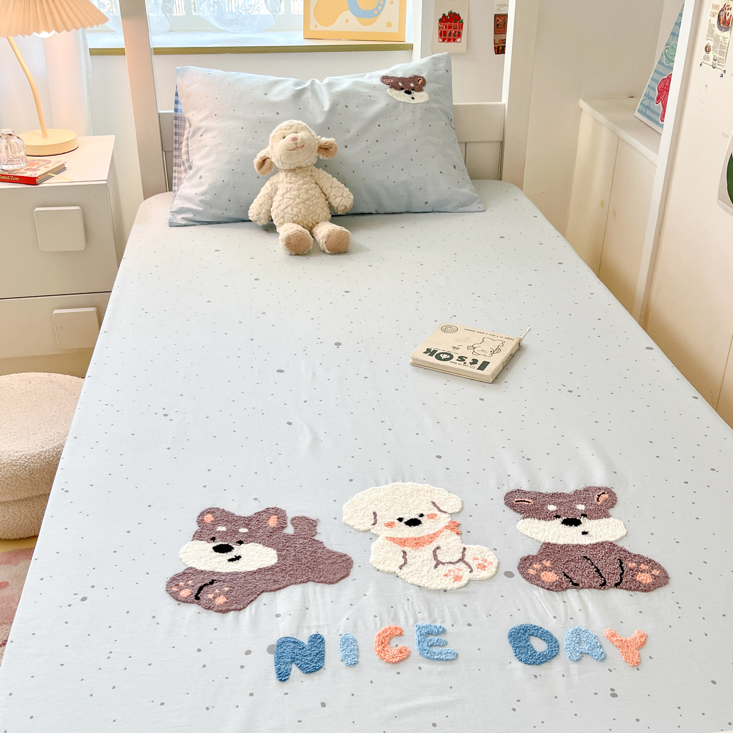 (总)慕尚家纺 2025新款全棉印花学生三件套套件,艾米熊,彩色爱心狗,铃兰花,美食派对,萌宠乐园,书生猫咪,桃心狗,汪可爱,旺旺,樱桃