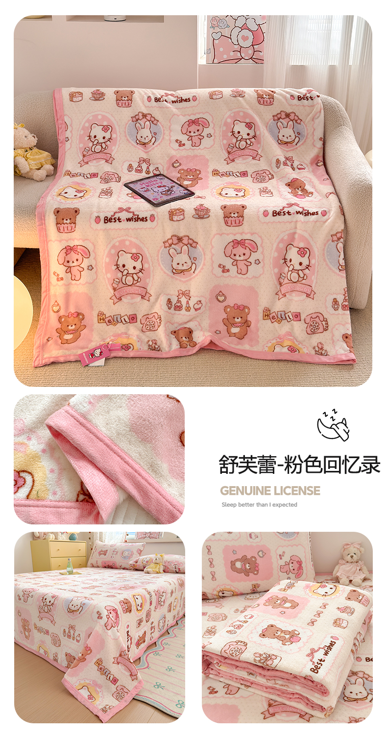 商品名称:初念 2025新款正版三丽鸥双面印花牛奶绒多功能四季款毛毯空调毯(撸猫触感,双倍柔软)(提供买家秀) 舒芙蕾-黑皮KT