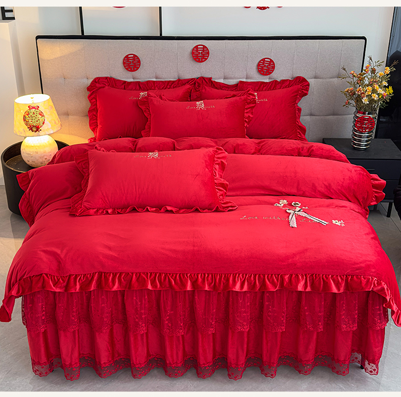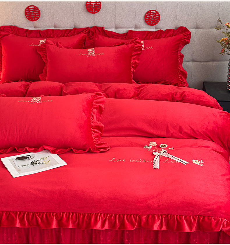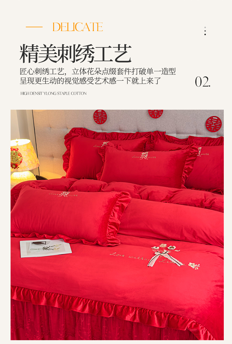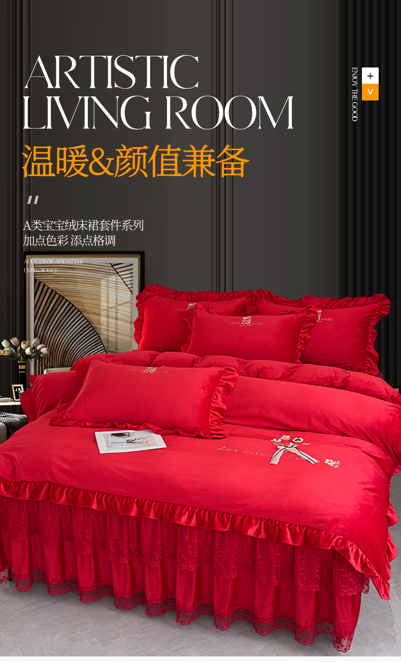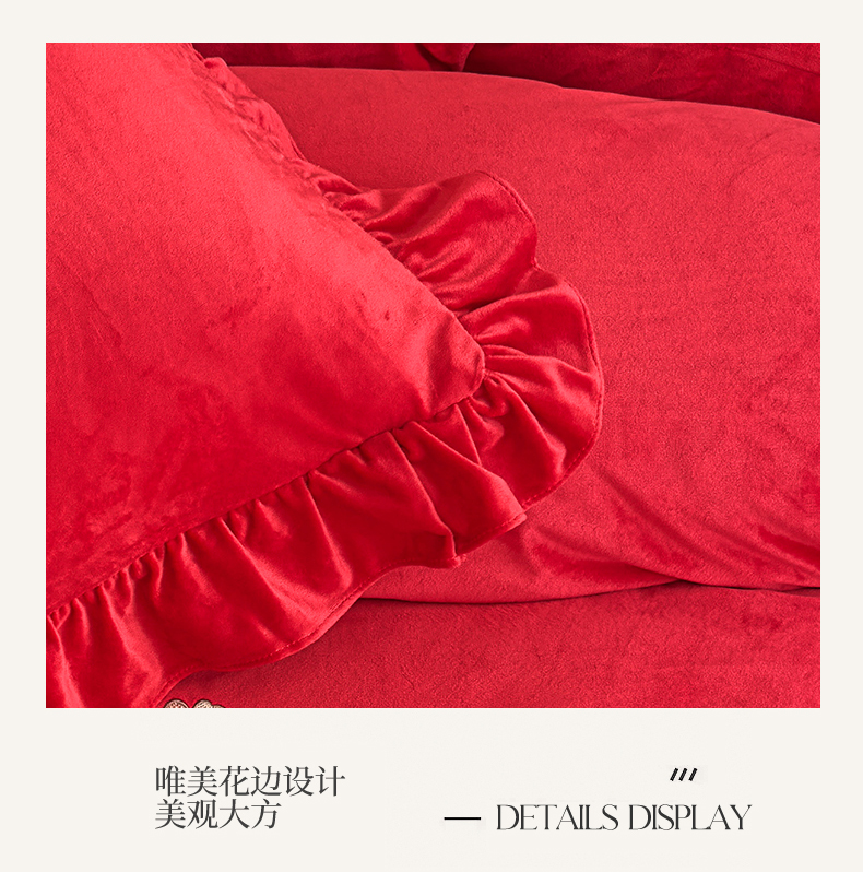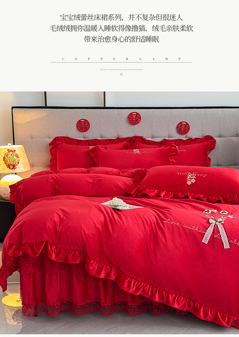 当前位置: 91家纺网 > 商品网购 > 床品套件 > 四件套 > 宝宝绒四件套 > 恒爱家纺 2025新款A类宝宝绒艾薇床裙四件套套件系列 喜庆红