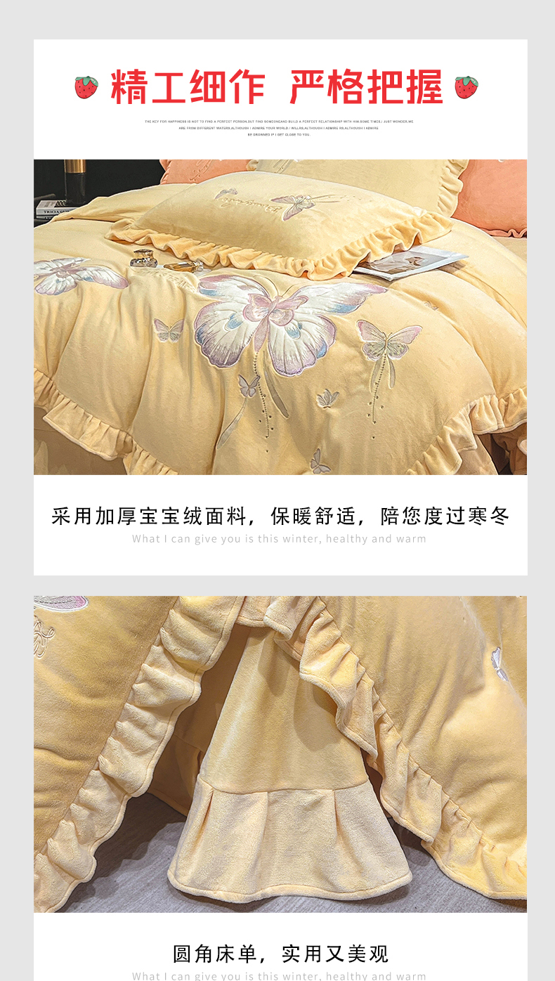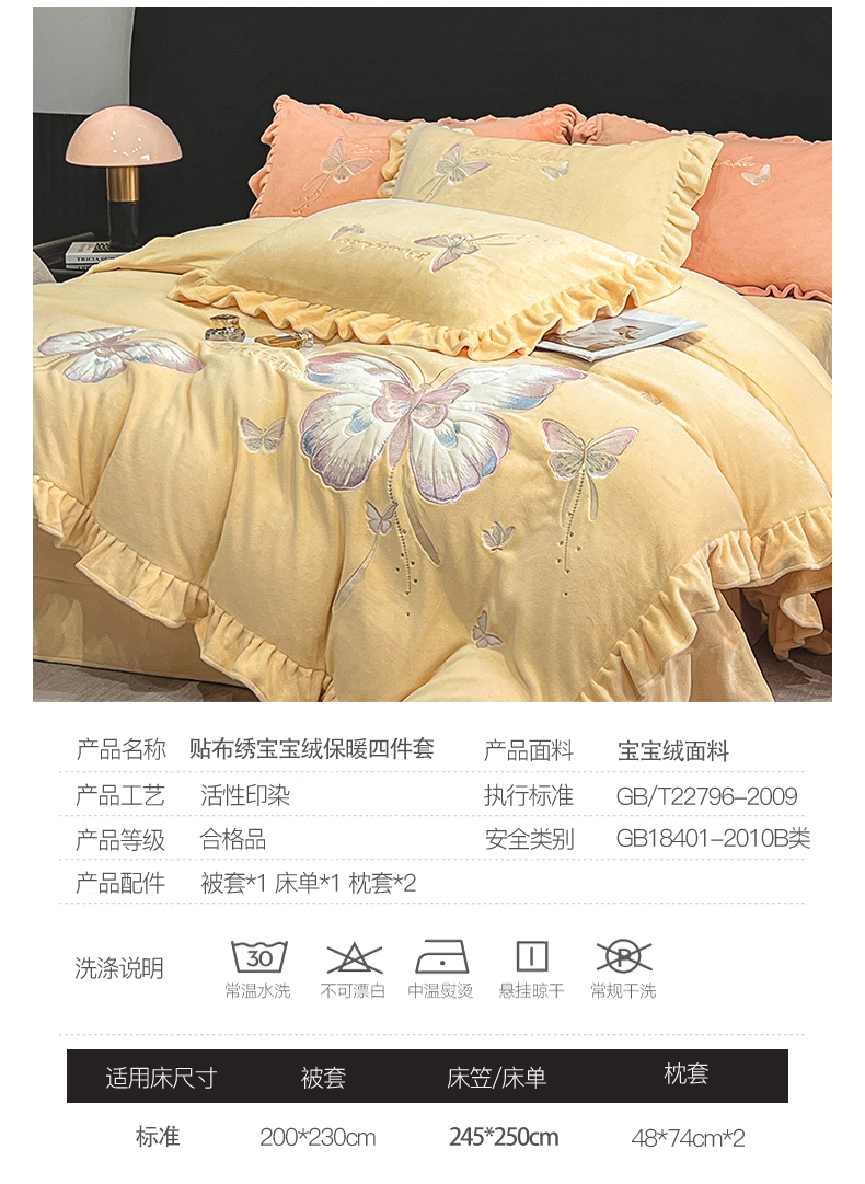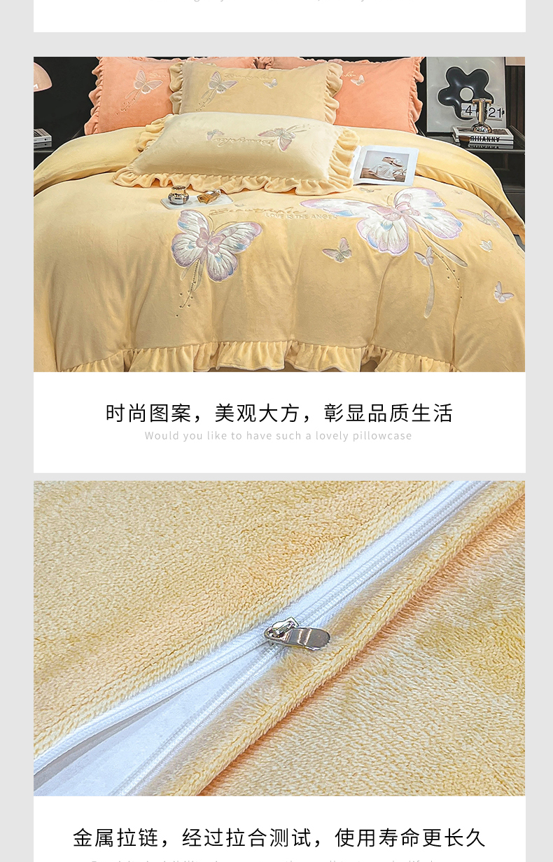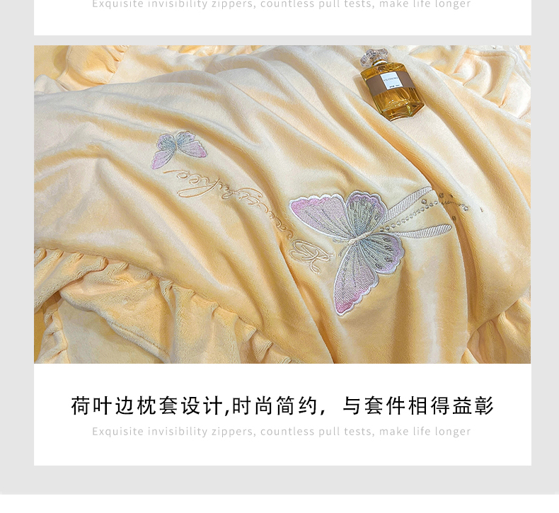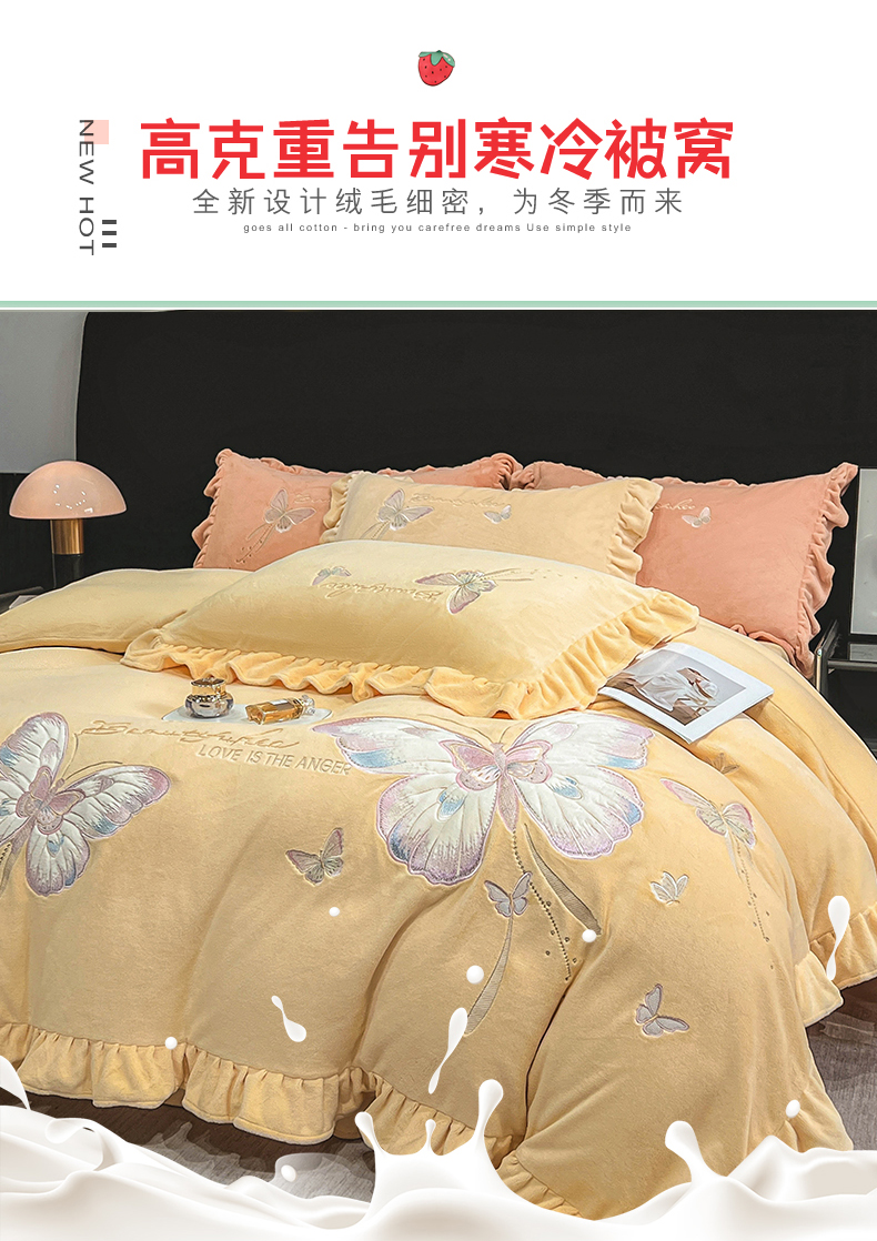 商品名称:悦织湾家纺 2025新款230克9.5斤重牛奶绒宝宝绒贴布绣四件套蝴蝶款高密保暖轻奢时尚床上用品四件套 蝴蝶-嫩黄色