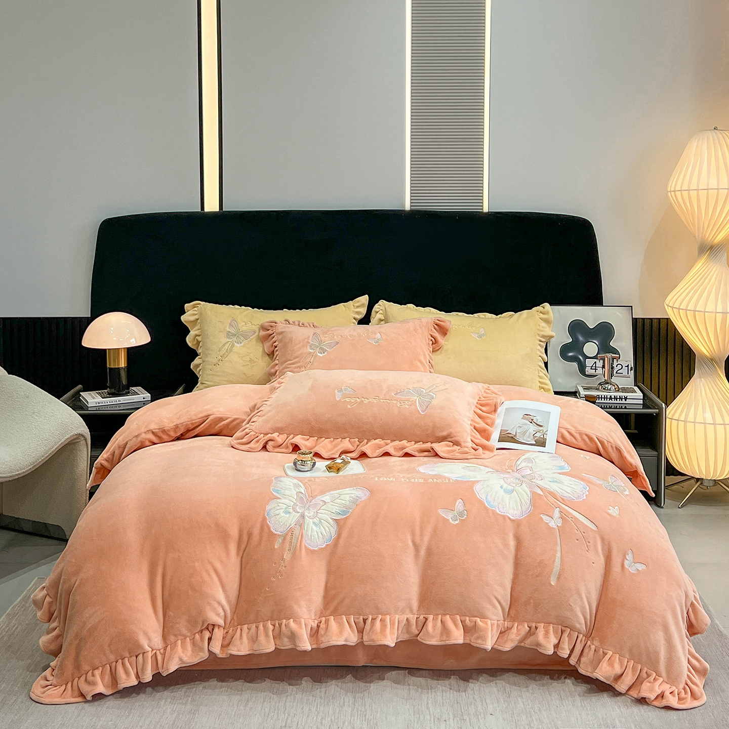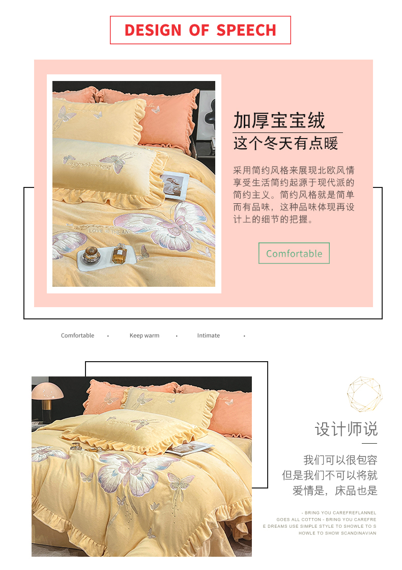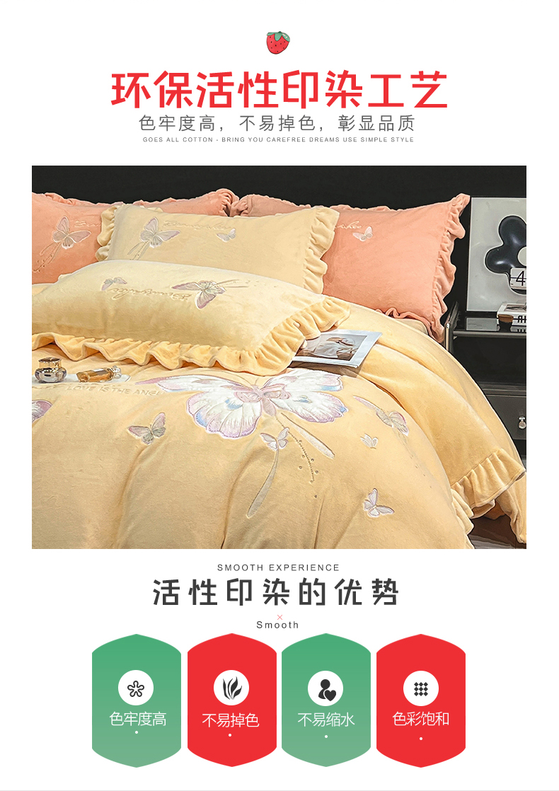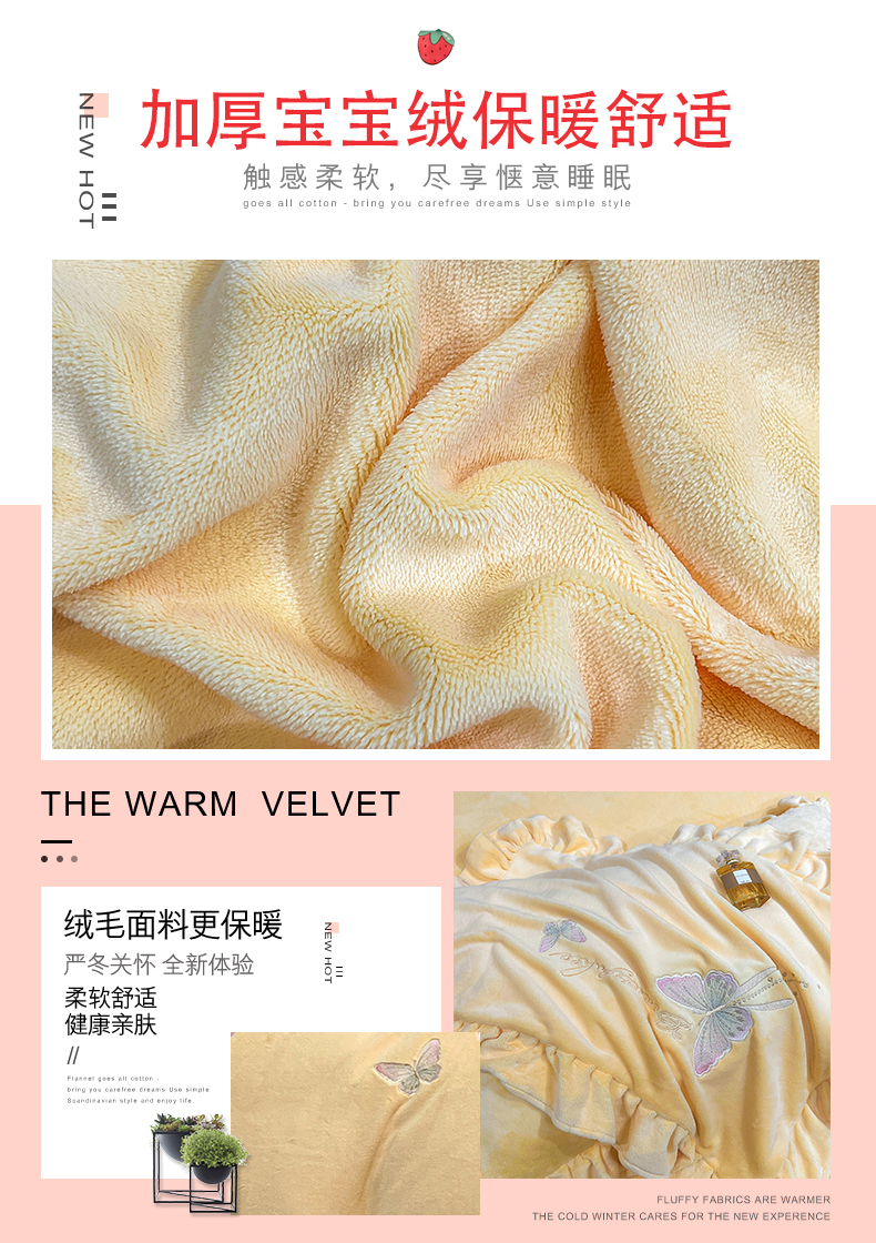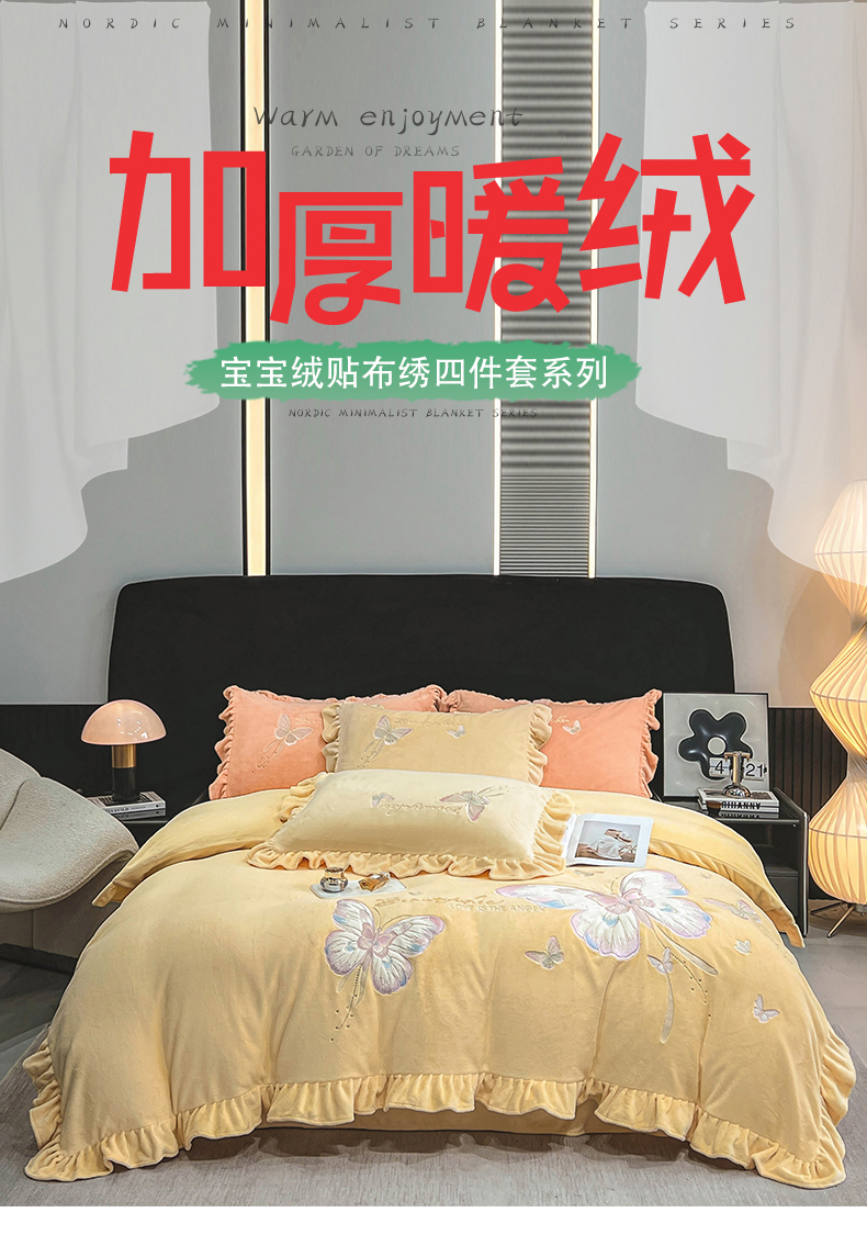 商品名称:悦织湾家纺 2025新款230克9.5斤重牛奶绒宝宝绒贴布绣四件套蝴蝶款高密保暖轻奢时尚床上用品四件套 蝴蝶-嫩黄色