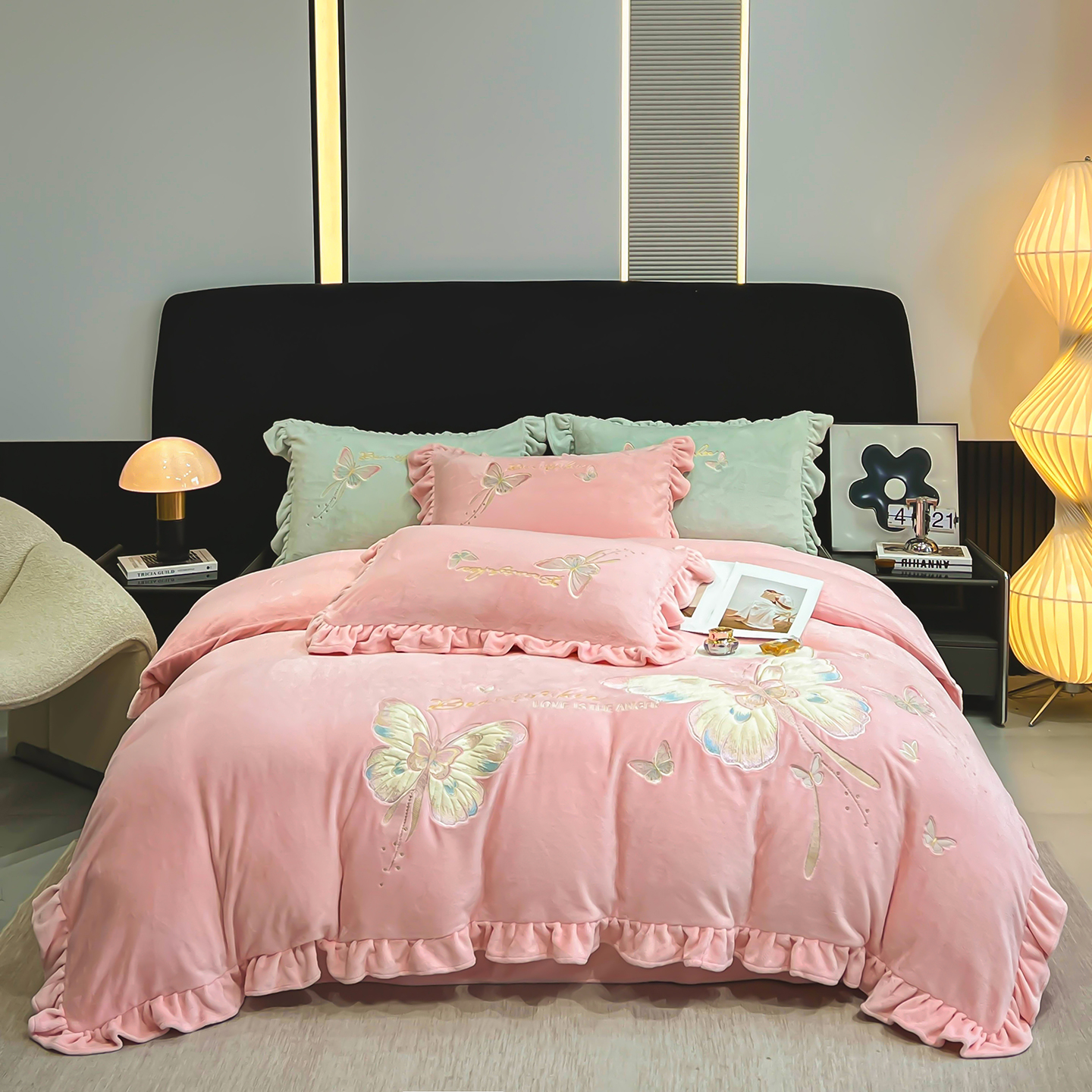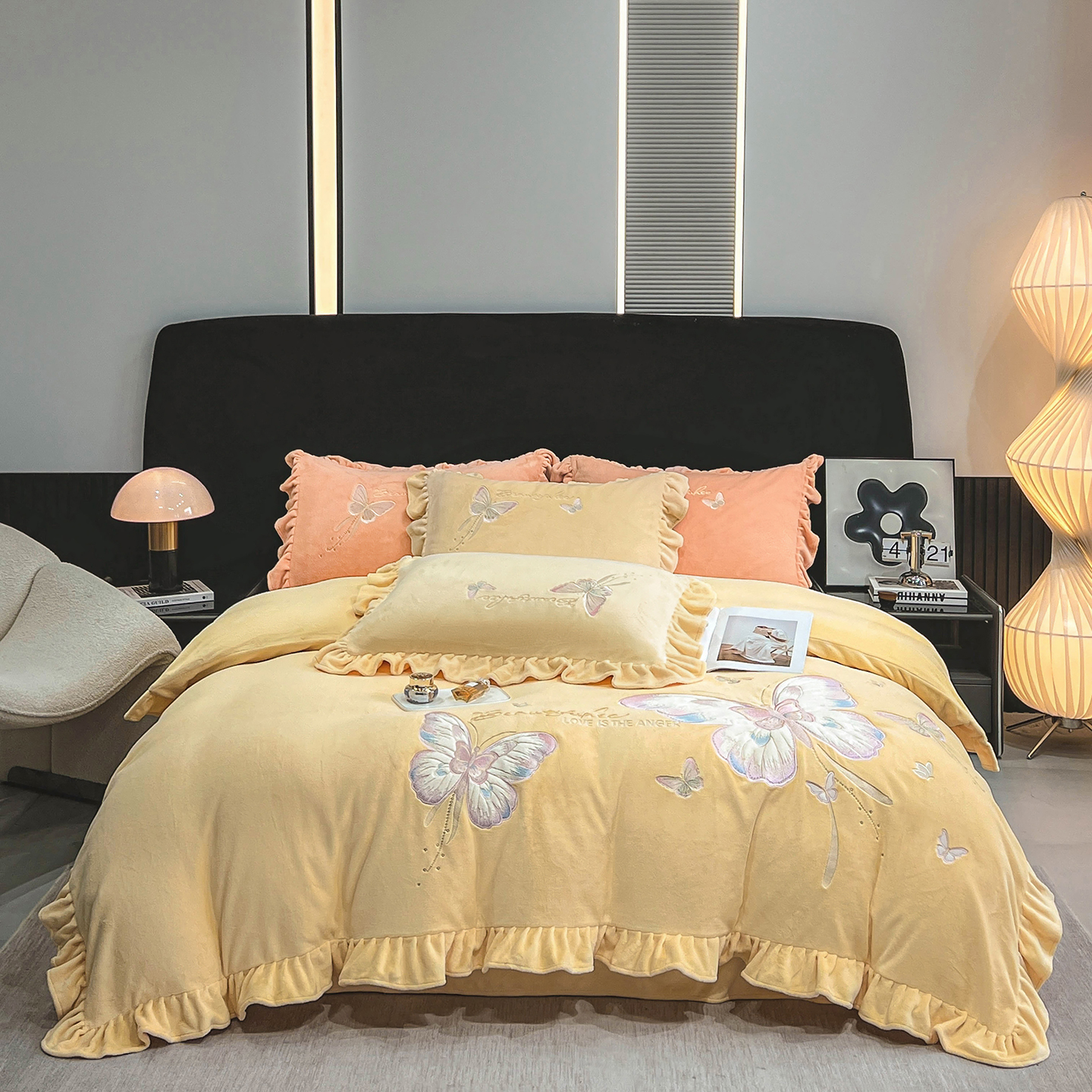 悦织湾家纺 2025新款230克9.5斤重牛奶绒宝宝绒贴布绣四件套蝴蝶款高密保暖轻奢时尚床上用品四件套 蝴蝶-嫩黄色