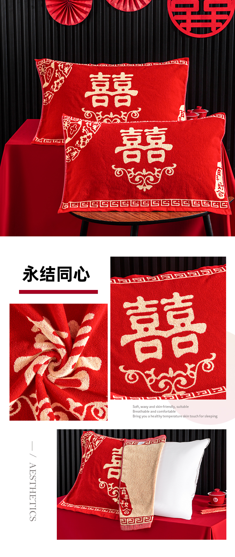 (总)美宜家 2025新款四层全棉纱布婚庆枕巾枕套枕头,百年好合,吉祥如意,喜上眉梢,喜气洋洋,喜结良缘,喜结连理,心心相印,欢欢喜喜,浪漫爱情,双喜临门,真爱永恒,花好月圆