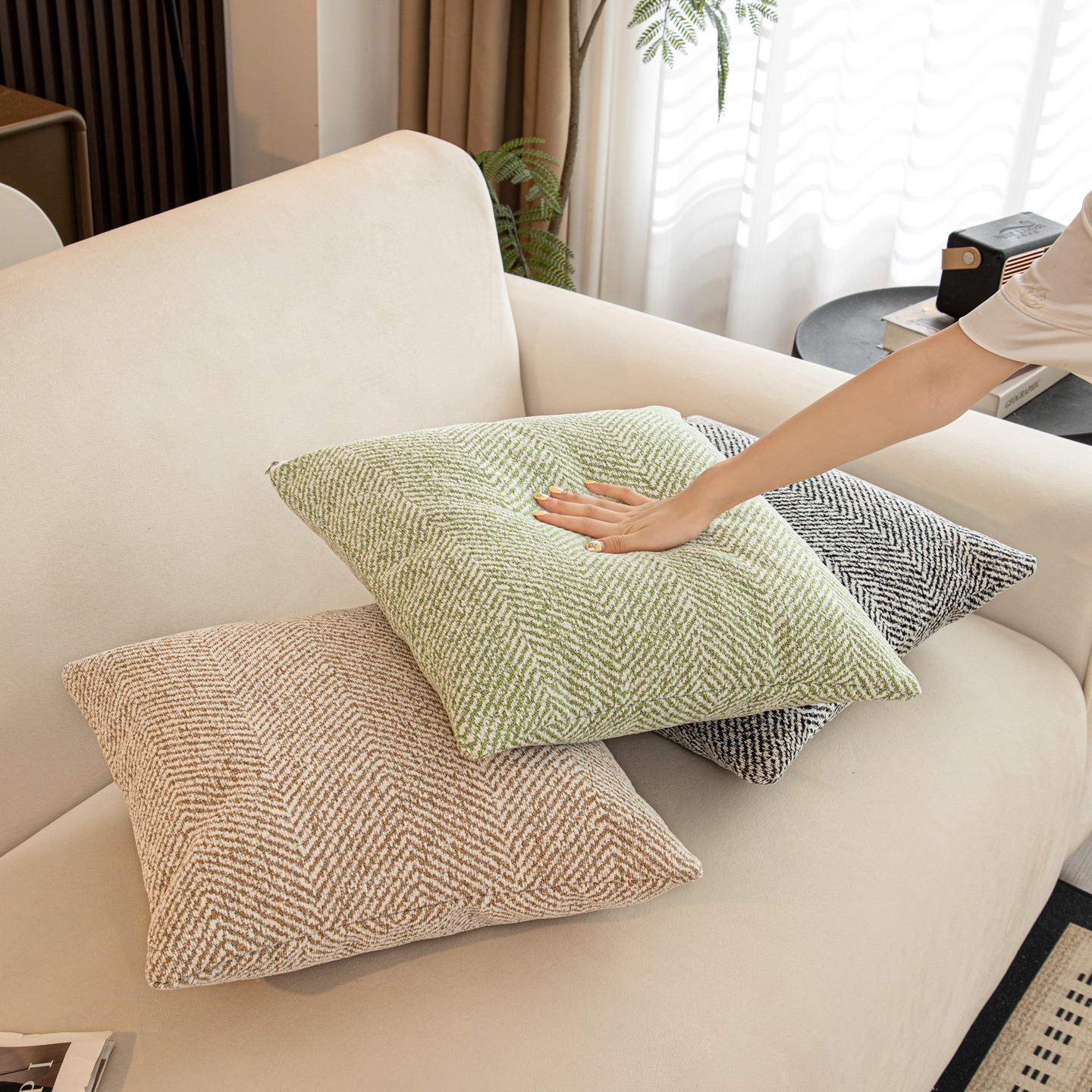 (总)沐沐家纺 2026新款中古风抱枕,墨绿条斜条纹流苏,立体褶皱米白,奶白泡泡,平行空间绿,组合