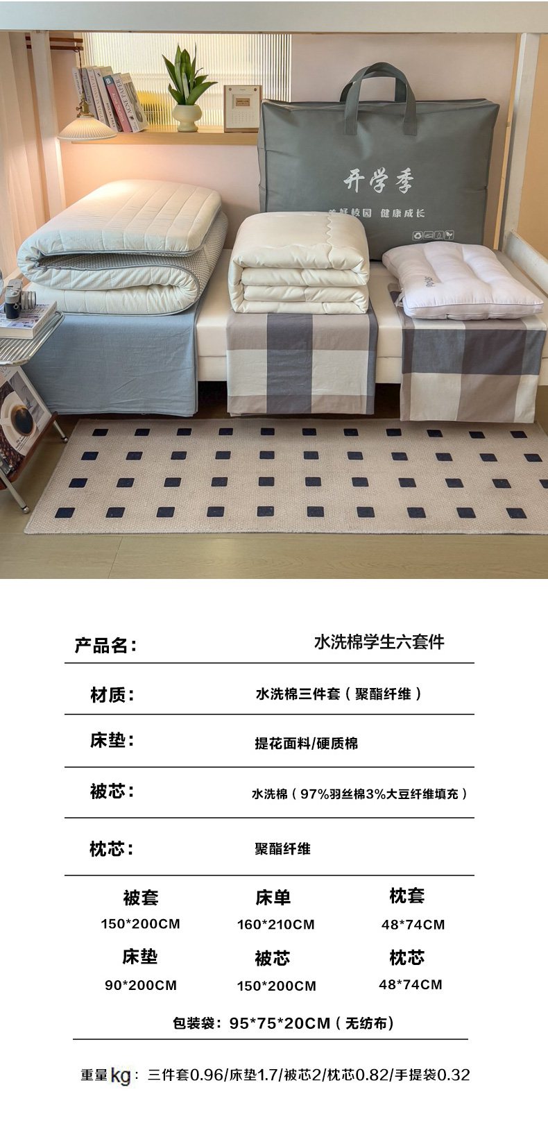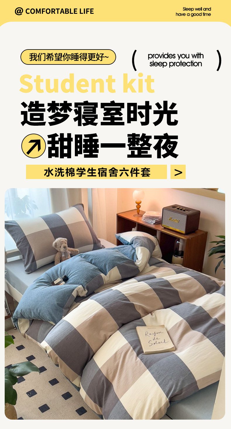 商品名称:梵克保罗 2025春夏新品无印风水洗棉学生六件套大礼包三件套枕套被套床单被芯床垫枕芯学生季 深蓝大格