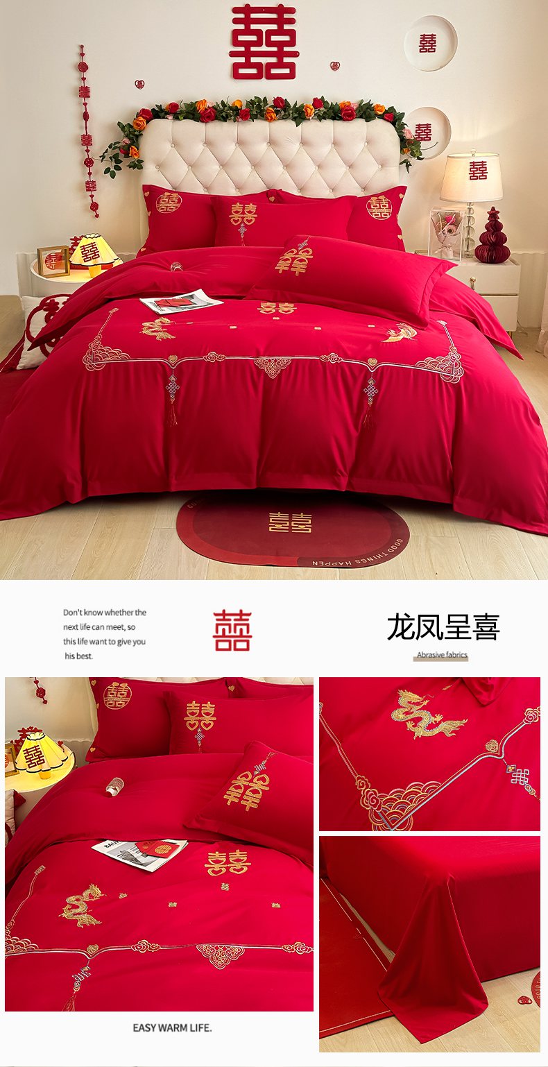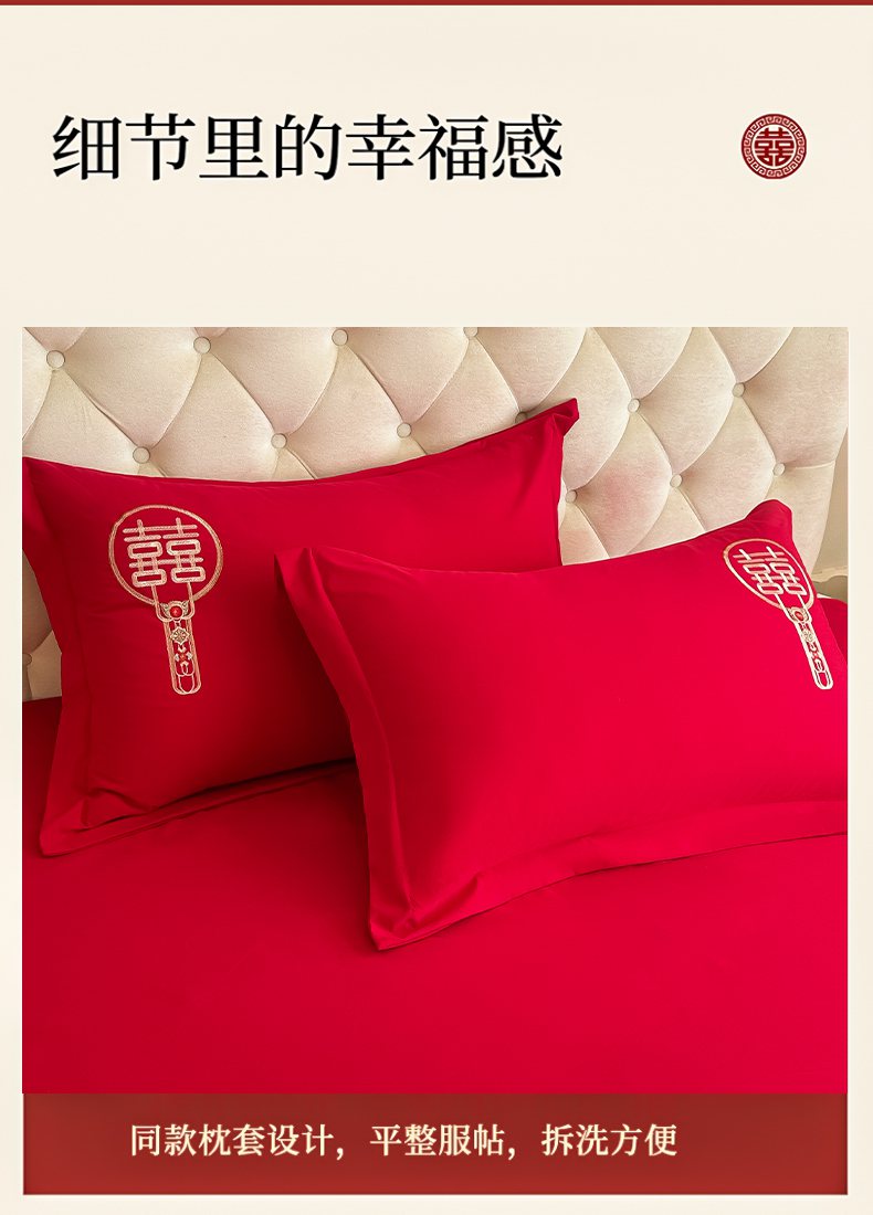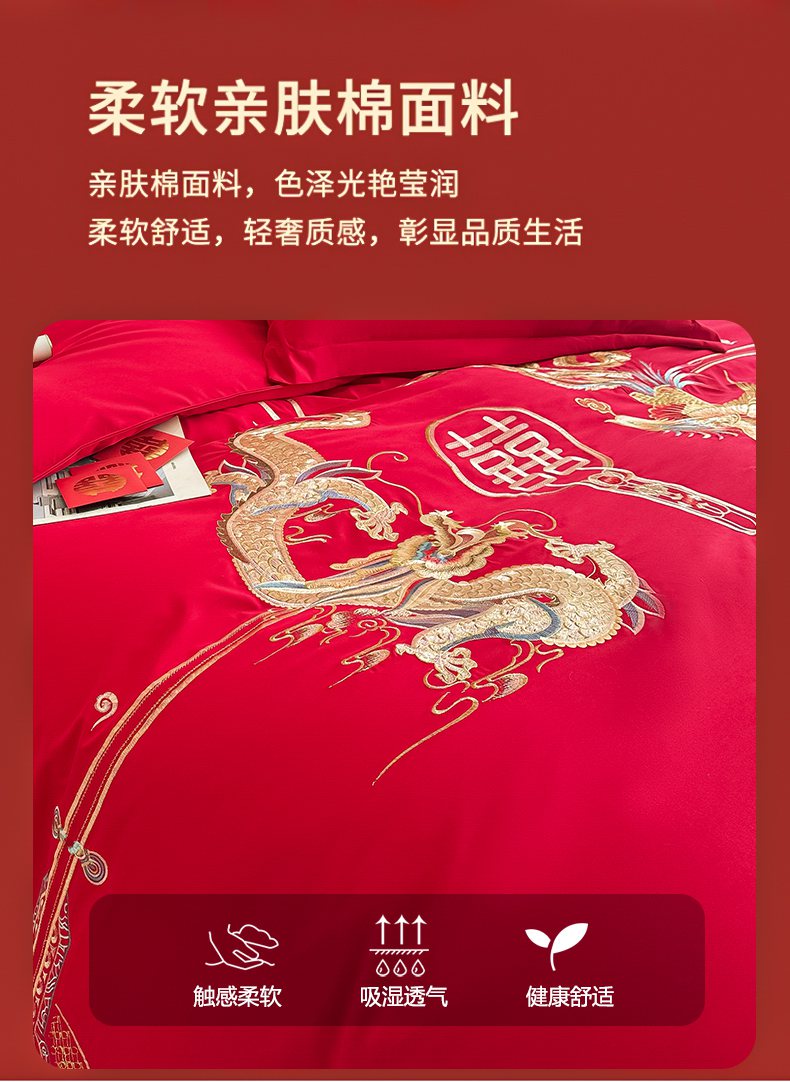 商品名称:梵克保罗 2025新款140高克重磨毛亲肤棉刺绣婚庆四件套 良辰喜事