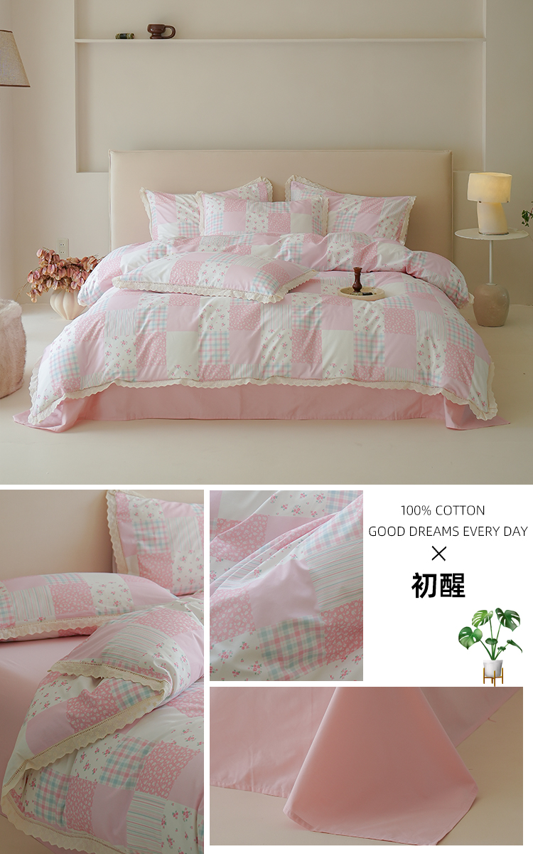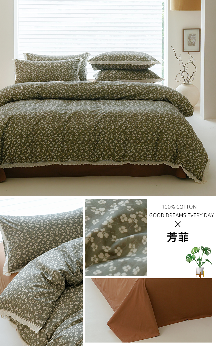 洺兰家居 2025年小清新全棉13372镂空花边小碎花ins风水洗棉四件套 小熊