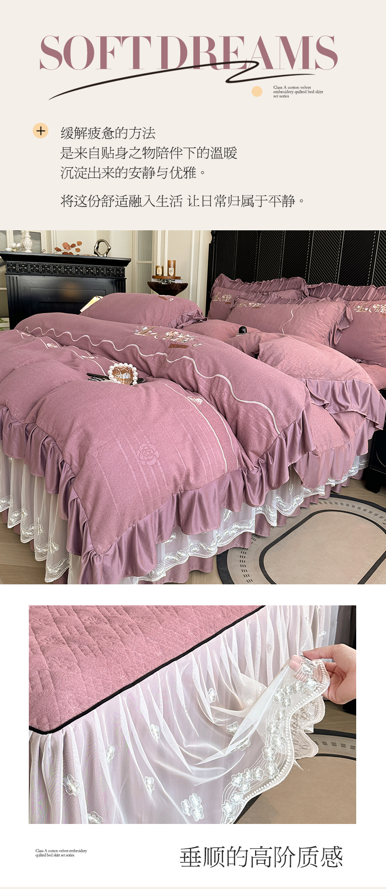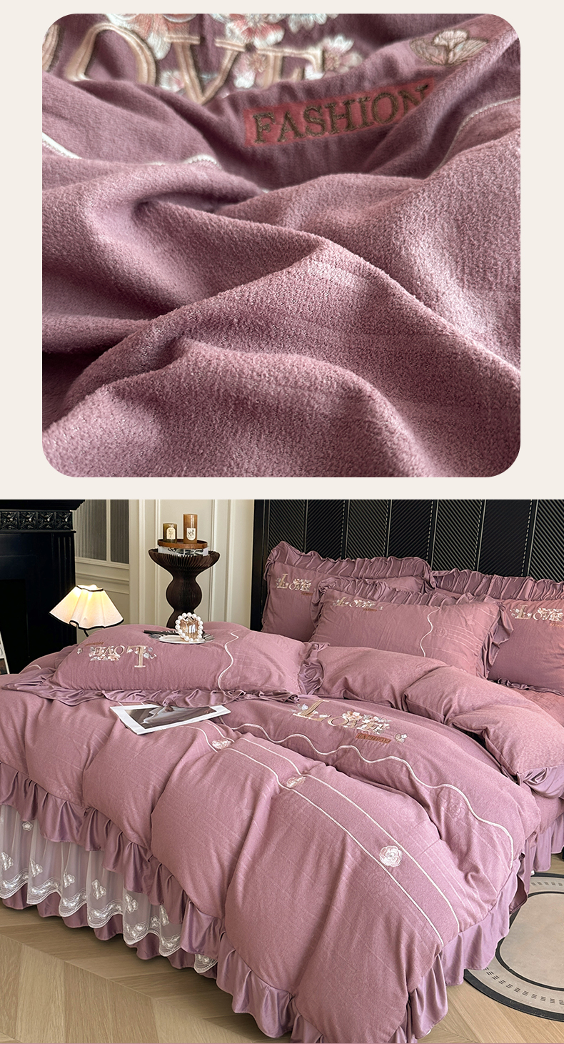 (总)宜凡家纺 2025新款兔绒提花牛奶绒夹棉床裙四件套,爱心 少女粉,爱心 粉紫,爱心 驼色,蝶舞 大红,蝶舞 米色,蝶舞 浅紫,蝶舞 玉色,简爱 苍青,简爱 豆沙紫,简爱 玉色,樱桃 苍青,樱桃 豆沙紫,樱桃 奶油白