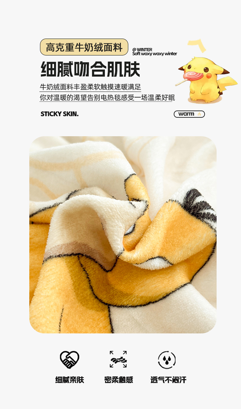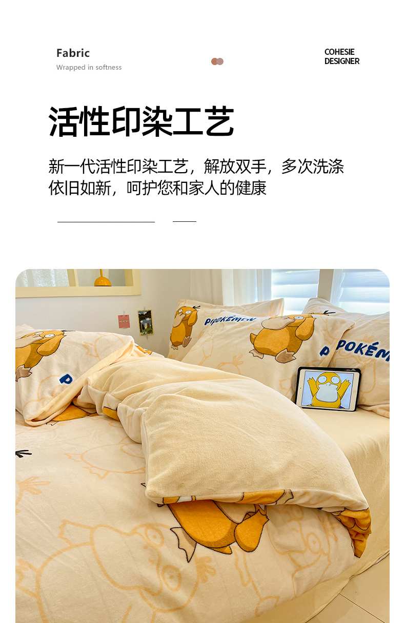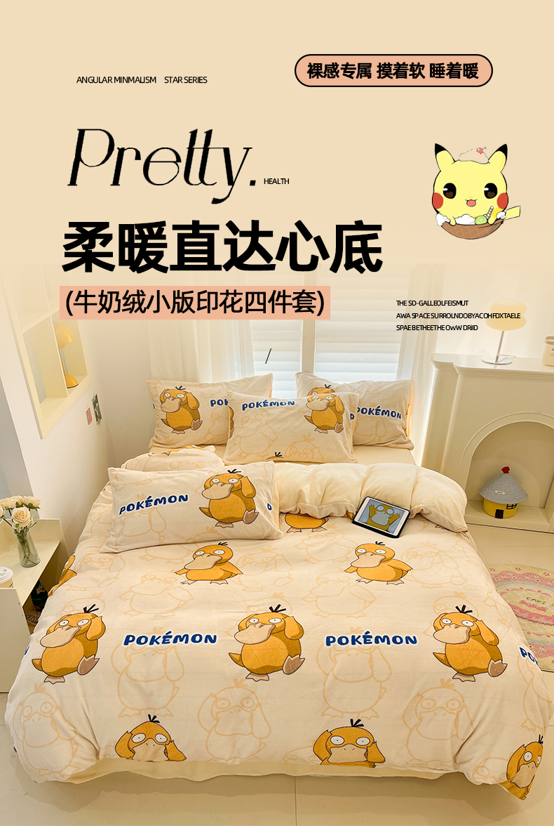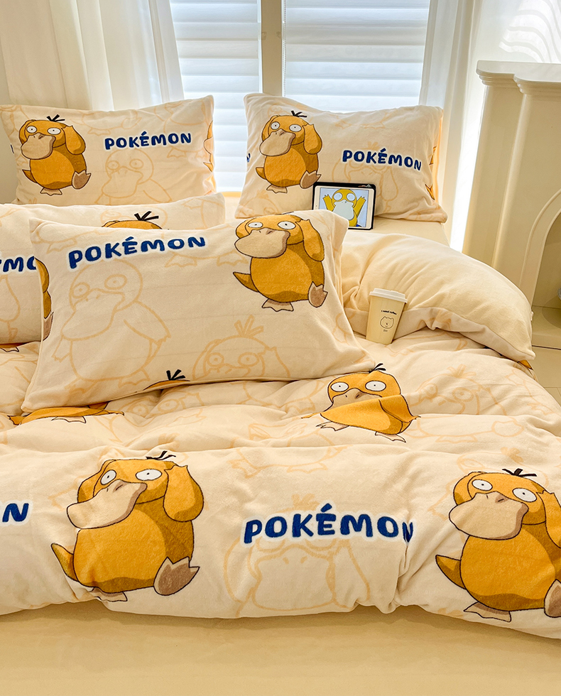 当前位置: 91家纺网 > 商品网购 > 床品套件 > 四件套 > 牛奶绒四件套 > 桃子家居 2025新款A类正版宝可梦授权皮卡丘大版卡通平网数码印花加厚高克重牛奶绒四件套 绒小版-奶黄可达鸭