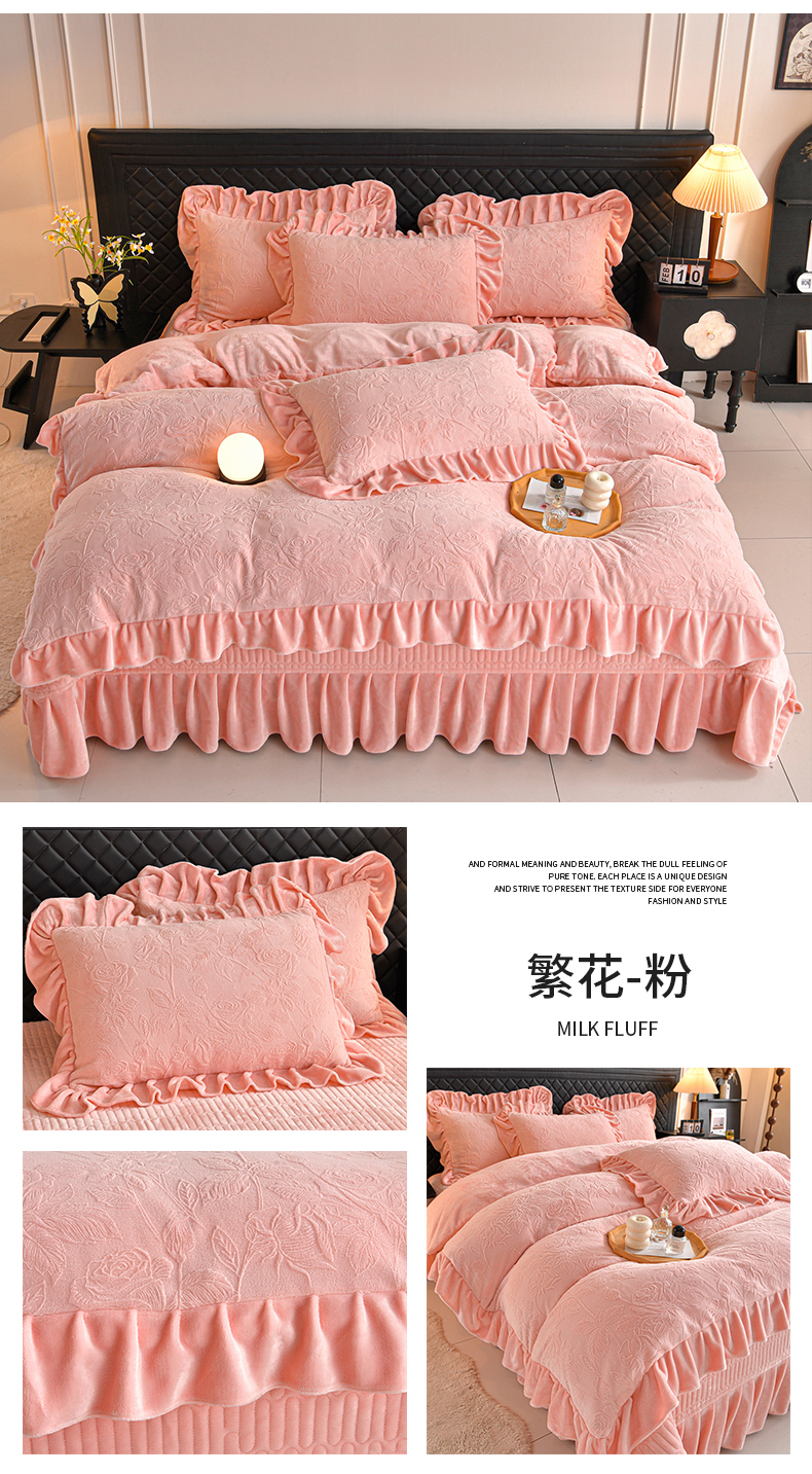 商品名称:赫本家纺 2025新款高克重纯色花边款雕花绒床盖款四件套 繁花-粉