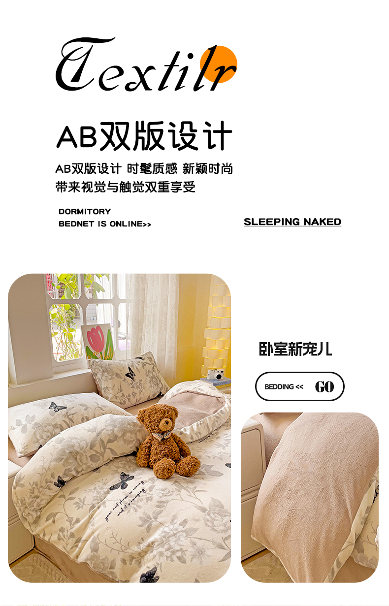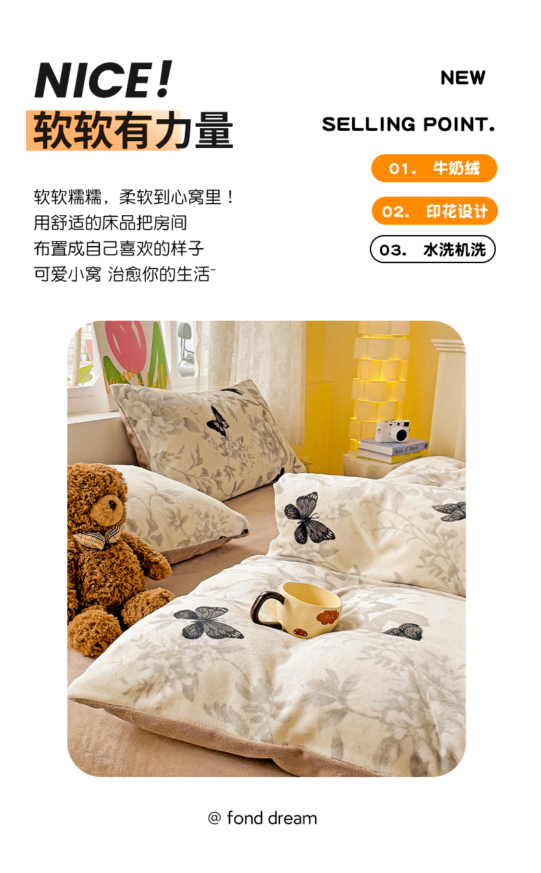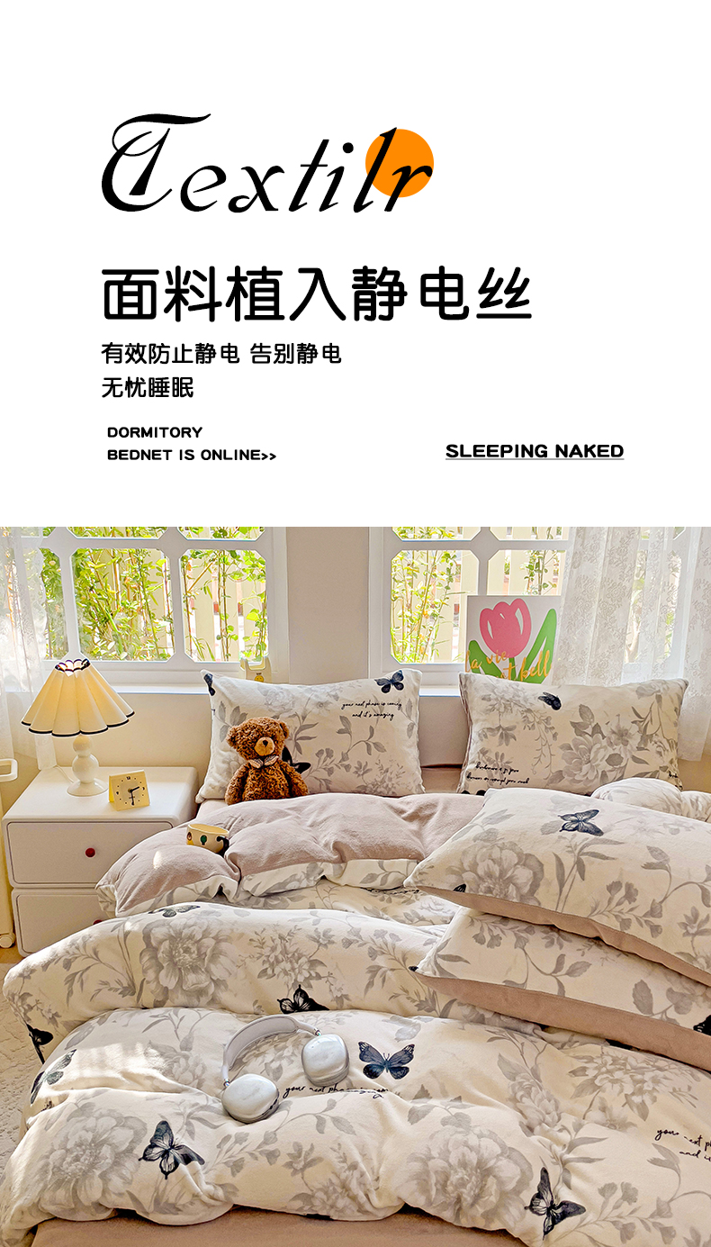 当前位置: 91家纺网 > 商品网购 > 床品套件 > 四件套 > 牛奶绒四件套 > 暖芯优选 2025新款小清新加厚高克重牛奶绒四件套直播热款电商热款 蝴蝶飞舞