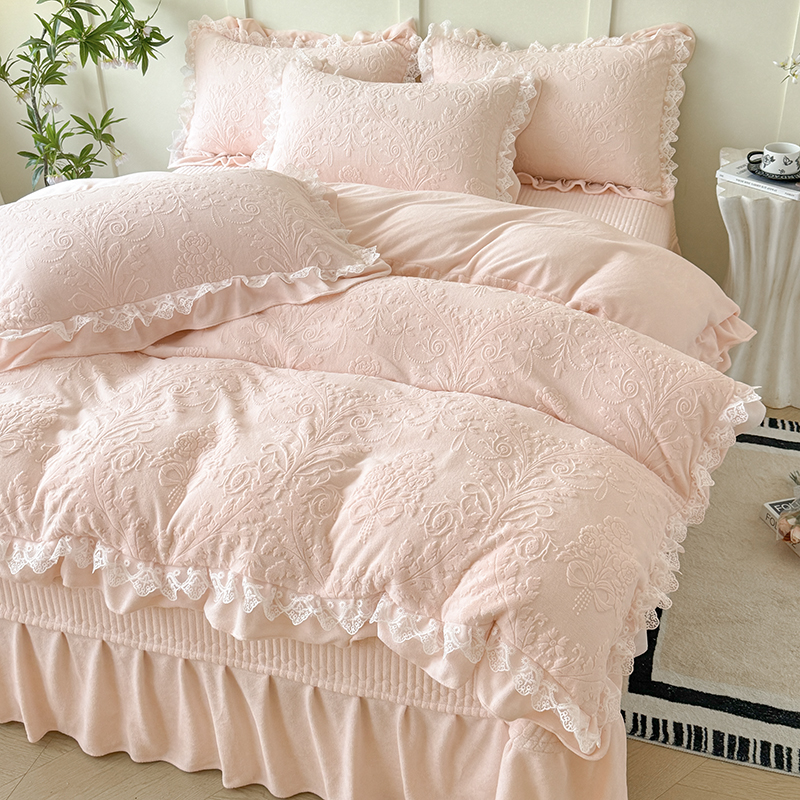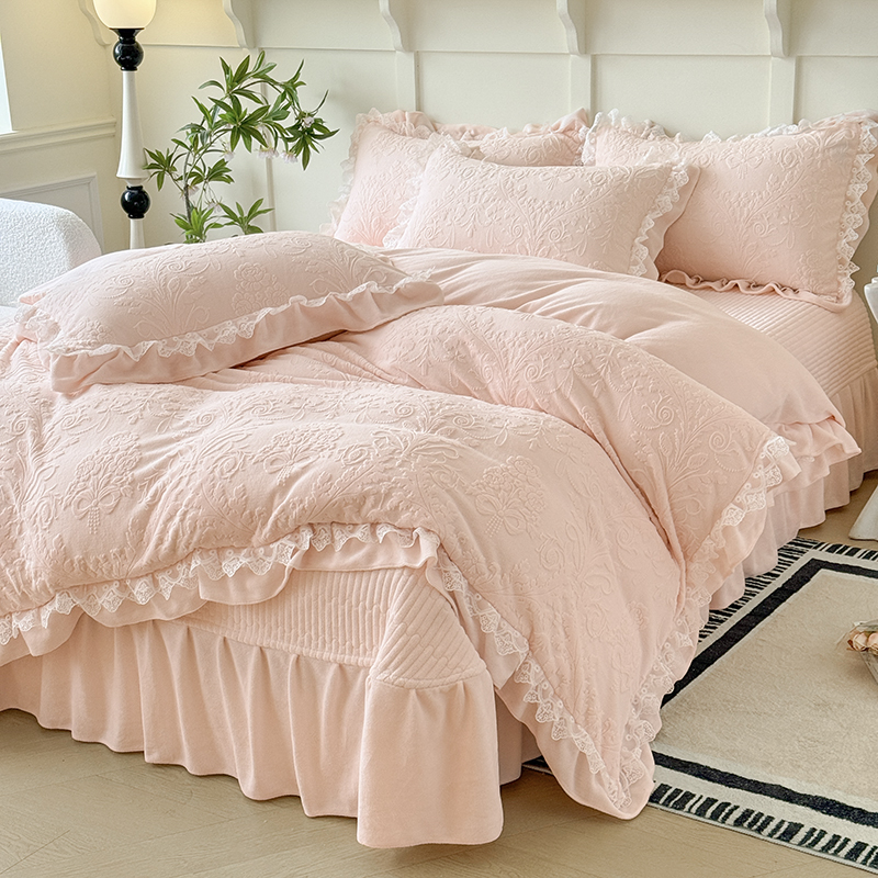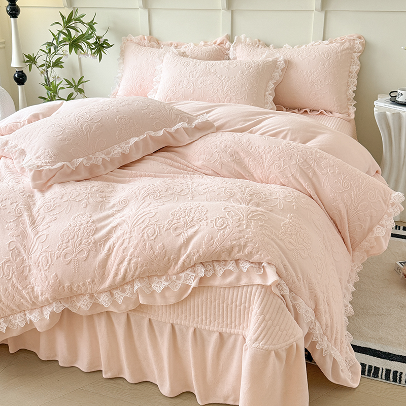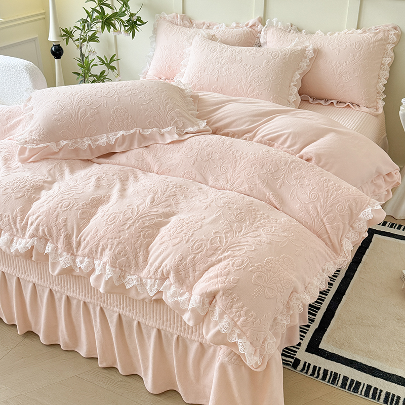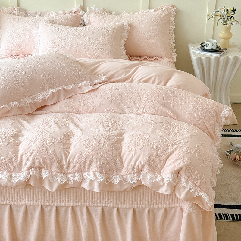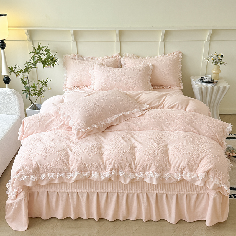 雅眠居 2025新款韩版花边高克重雕花绒牛奶绒床盖四件套 安娜花园-仙女粉