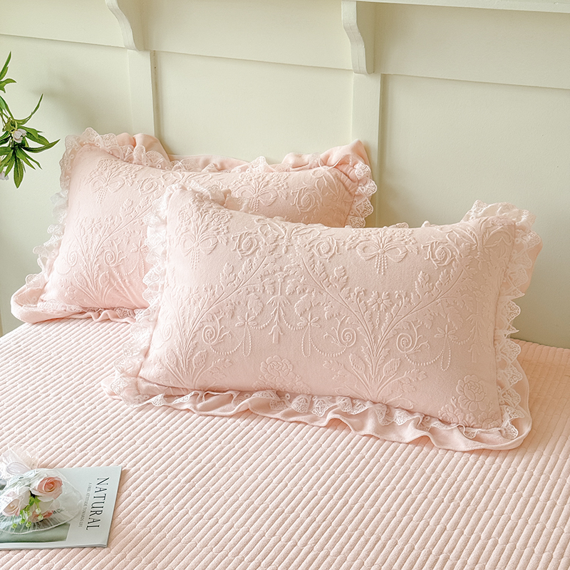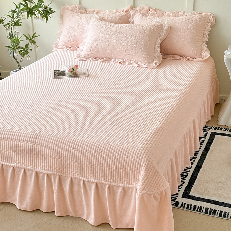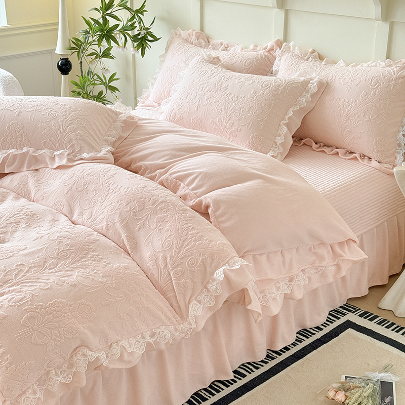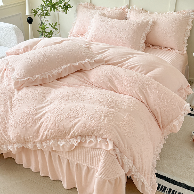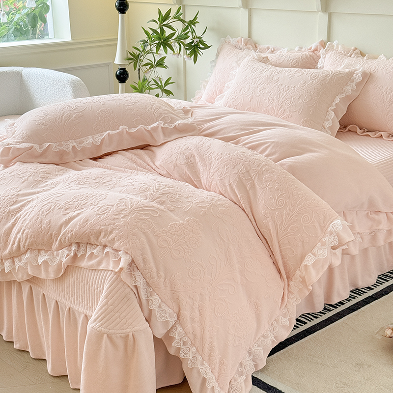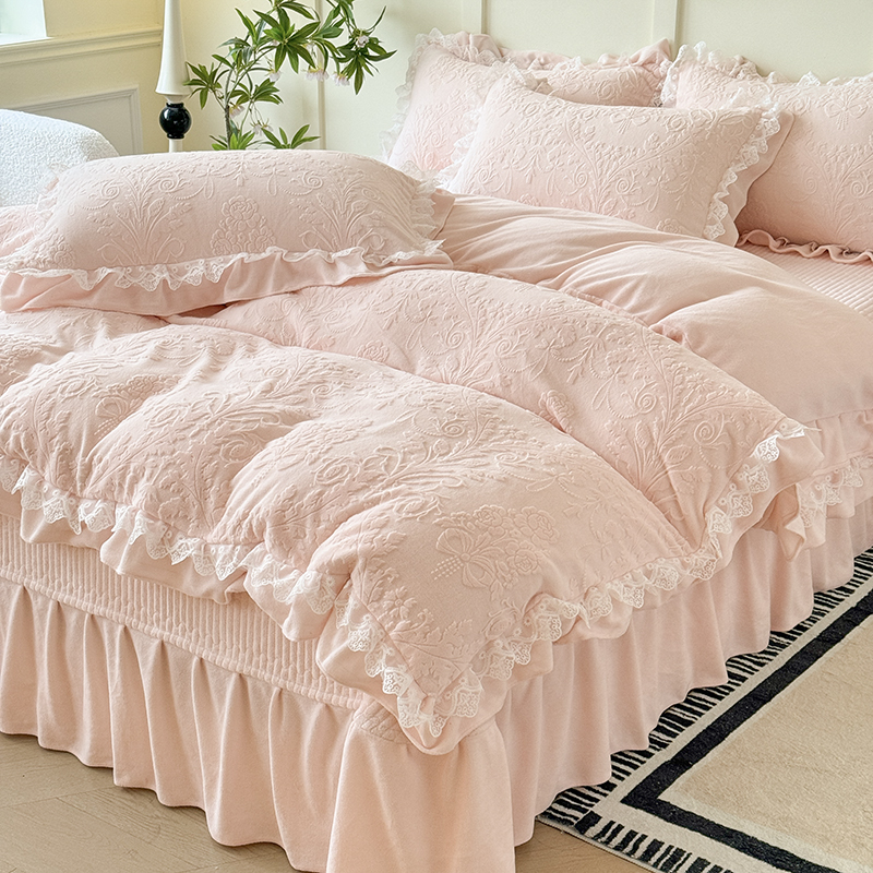 雅眠居 2025新款韩版花边高克重雕花绒牛奶绒床盖四件套 安娜花园-仙女粉