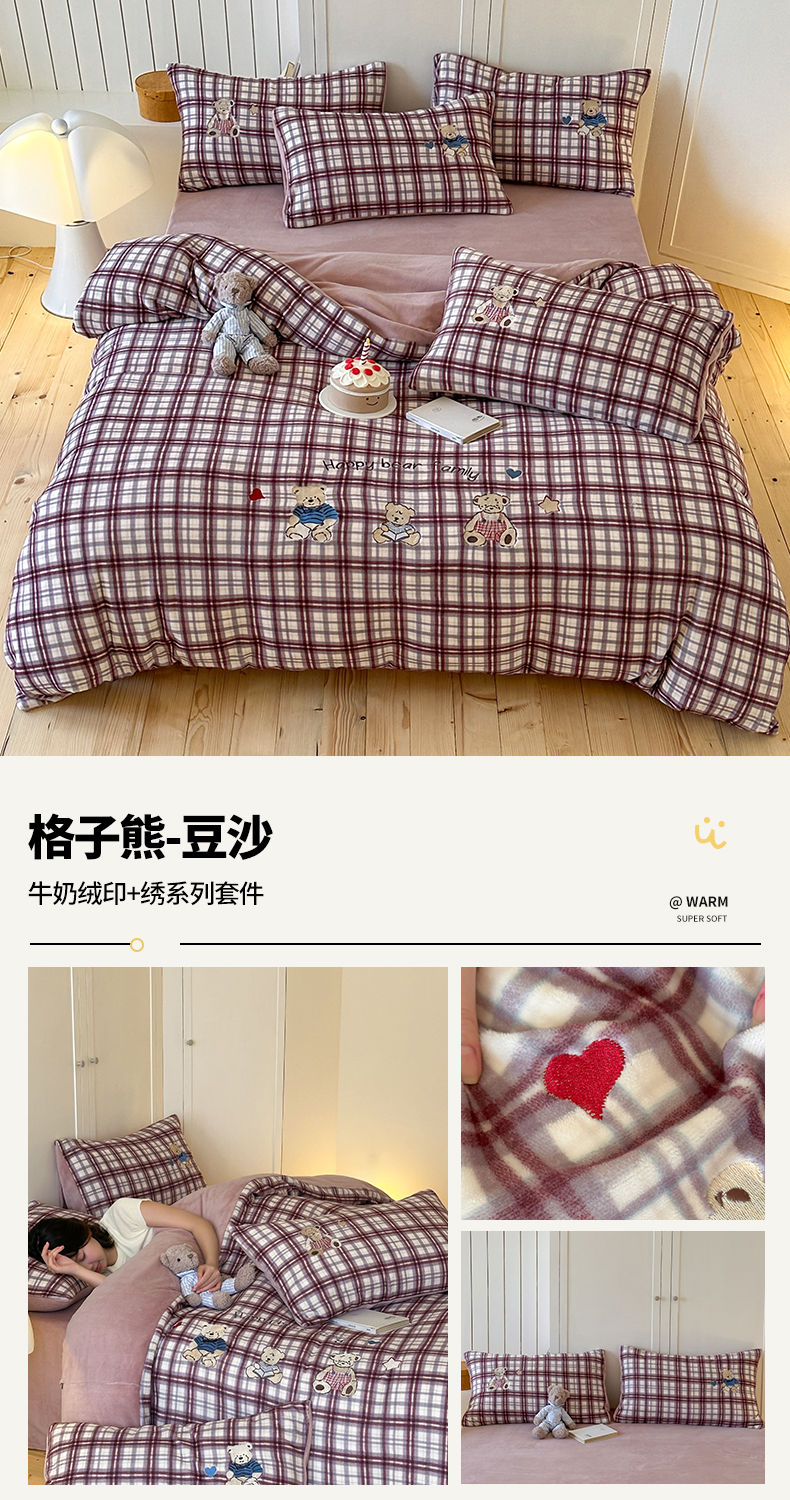 (总)优悦生活馆 2025新款牛奶绒卡通印花刺绣四件套系列,波点猫-白+粉,波点猫-蓝,格子熊-豆沙,格子熊-灰,格子熊-咖,条纹狗-咖,条纹狗-蓝,条纹狗-绿