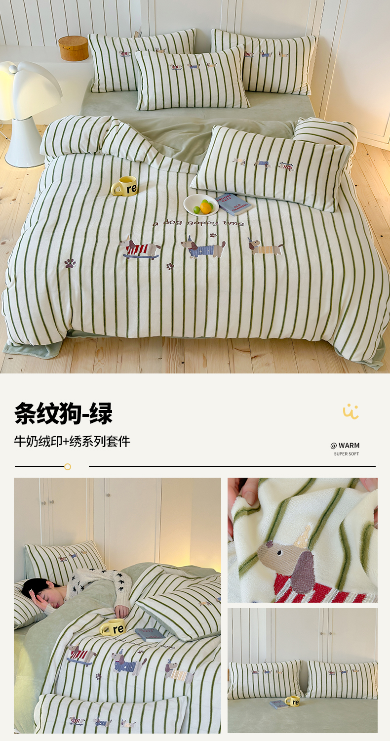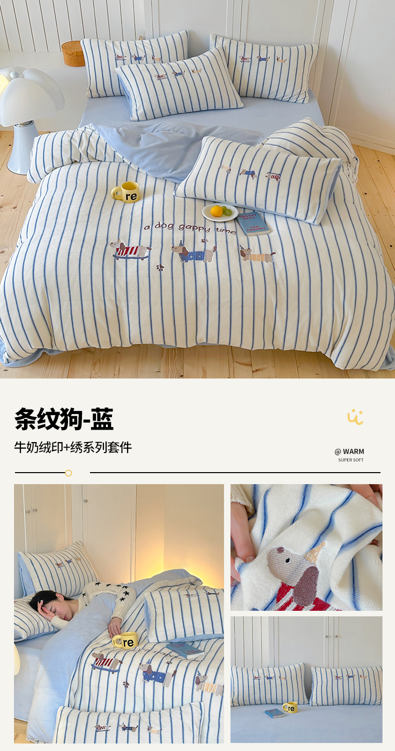 优悦生活馆 2025新款牛奶绒卡通印花刺绣四件套系列 条纹狗-咖