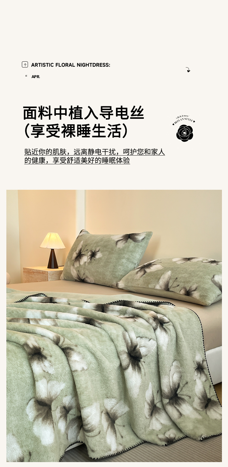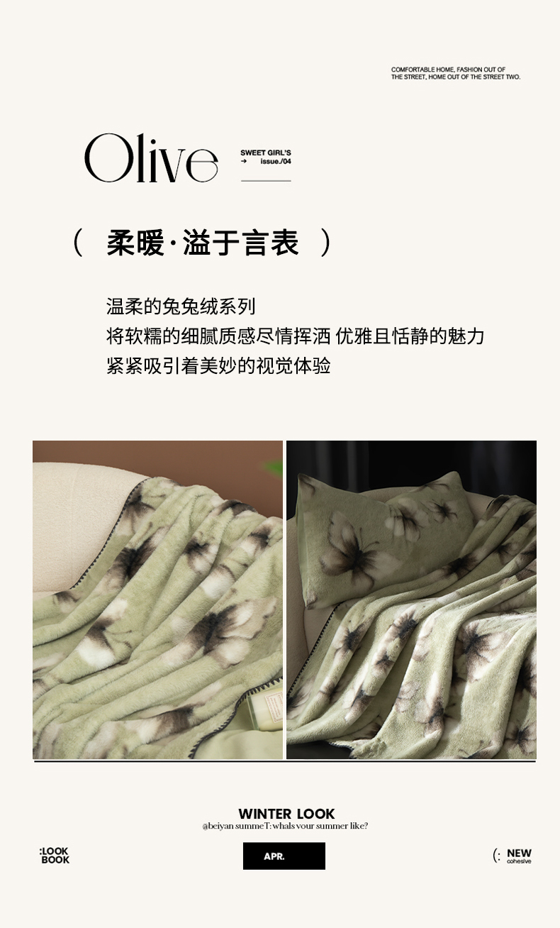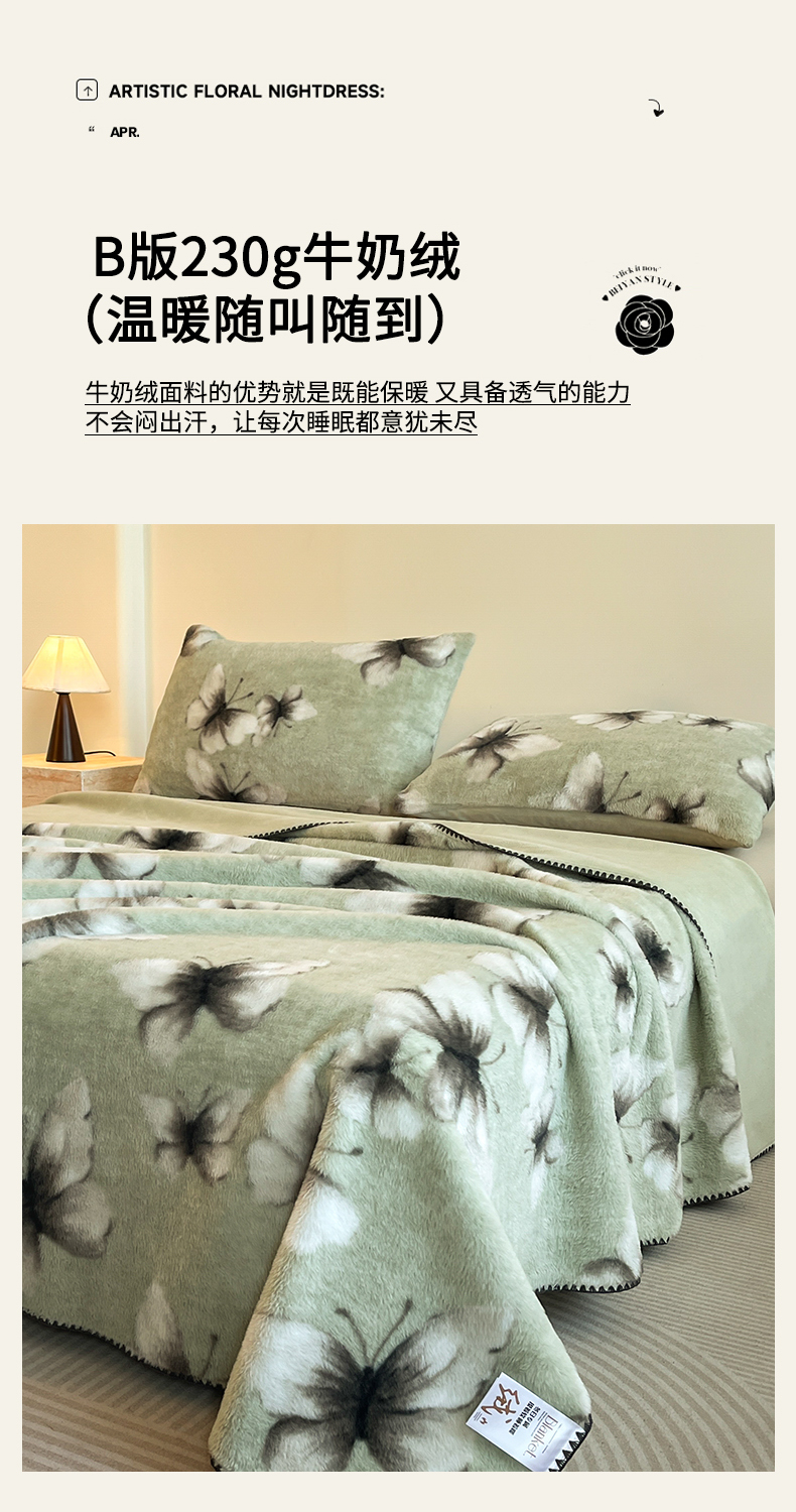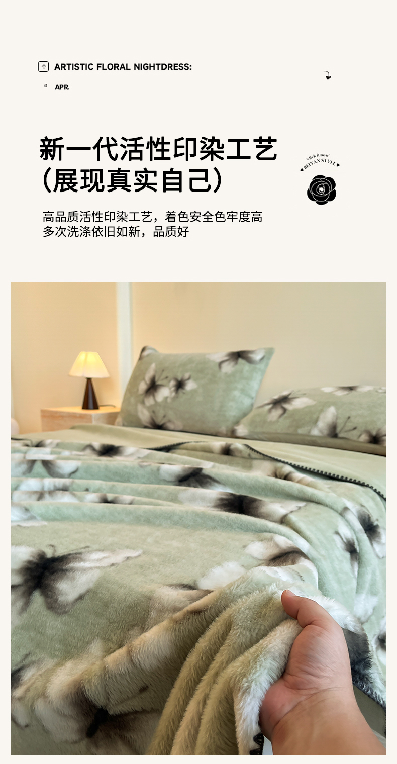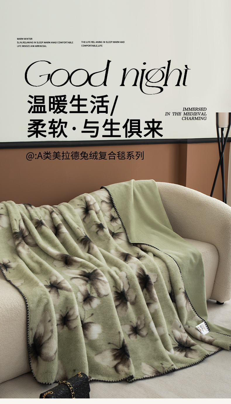 商品名称:子曰 2025新款A类美拉德兔绒复合毯系列 美拉德毛毯-蝶舞绿
