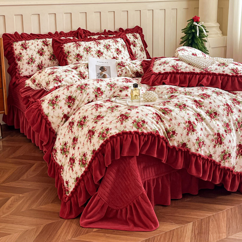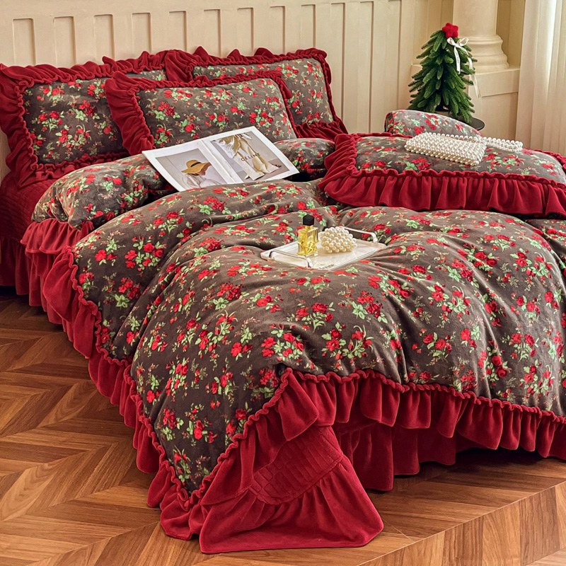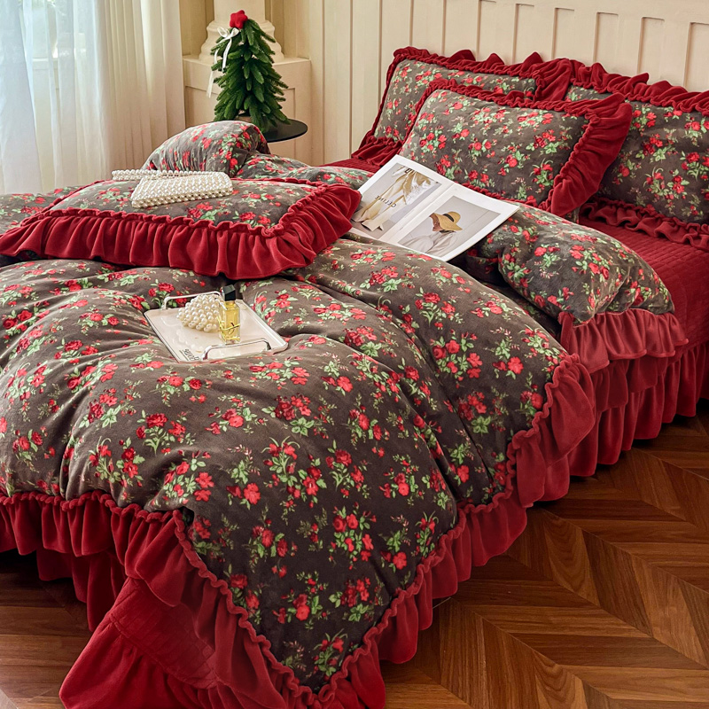 商品名称:尚美 2025新款法式复古风大花边绒床盖被套四件套(花边随机) 复古风格调灰