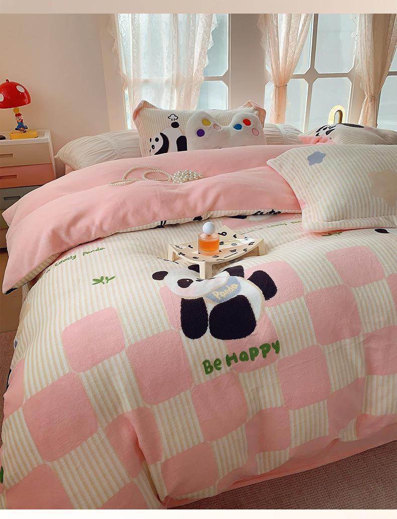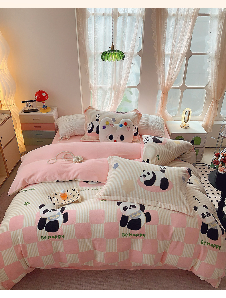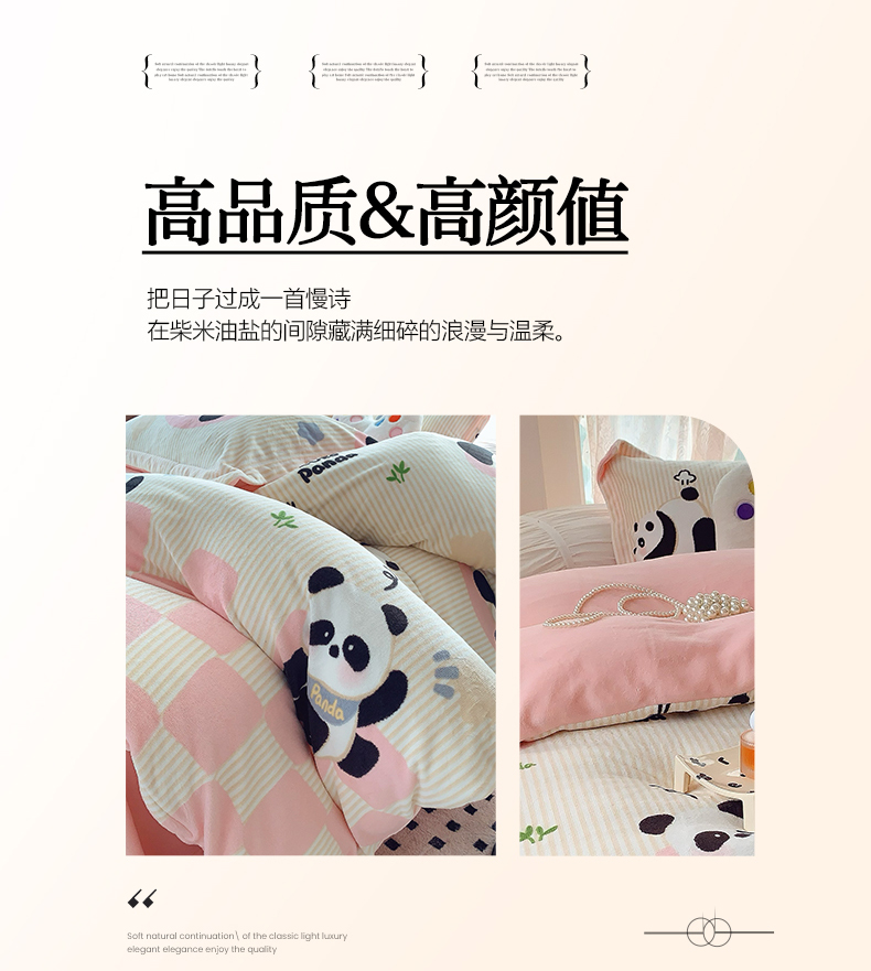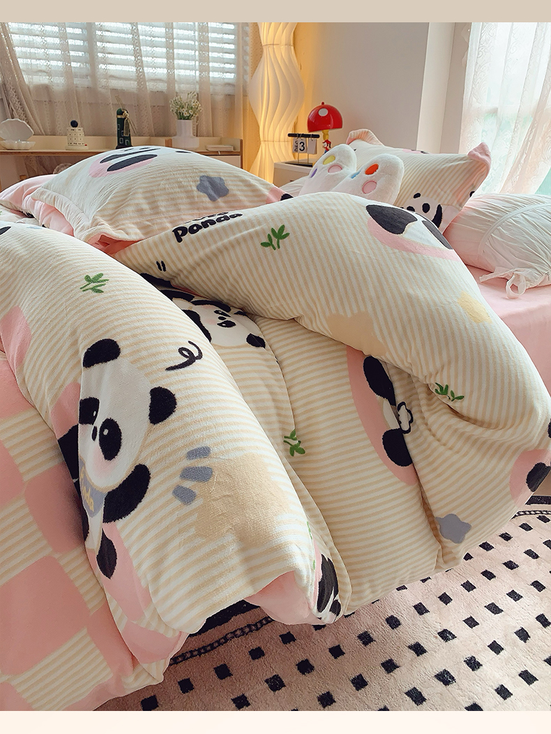 奈萝家纺 2025新款加厚小清新印花牛奶绒三件套四件套 小熊猫粉