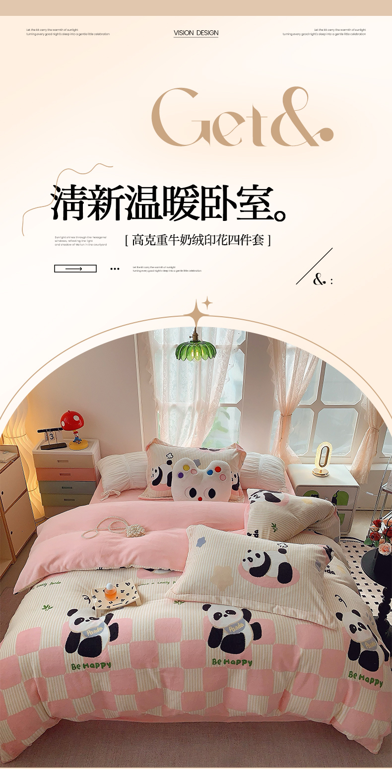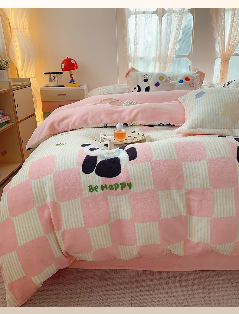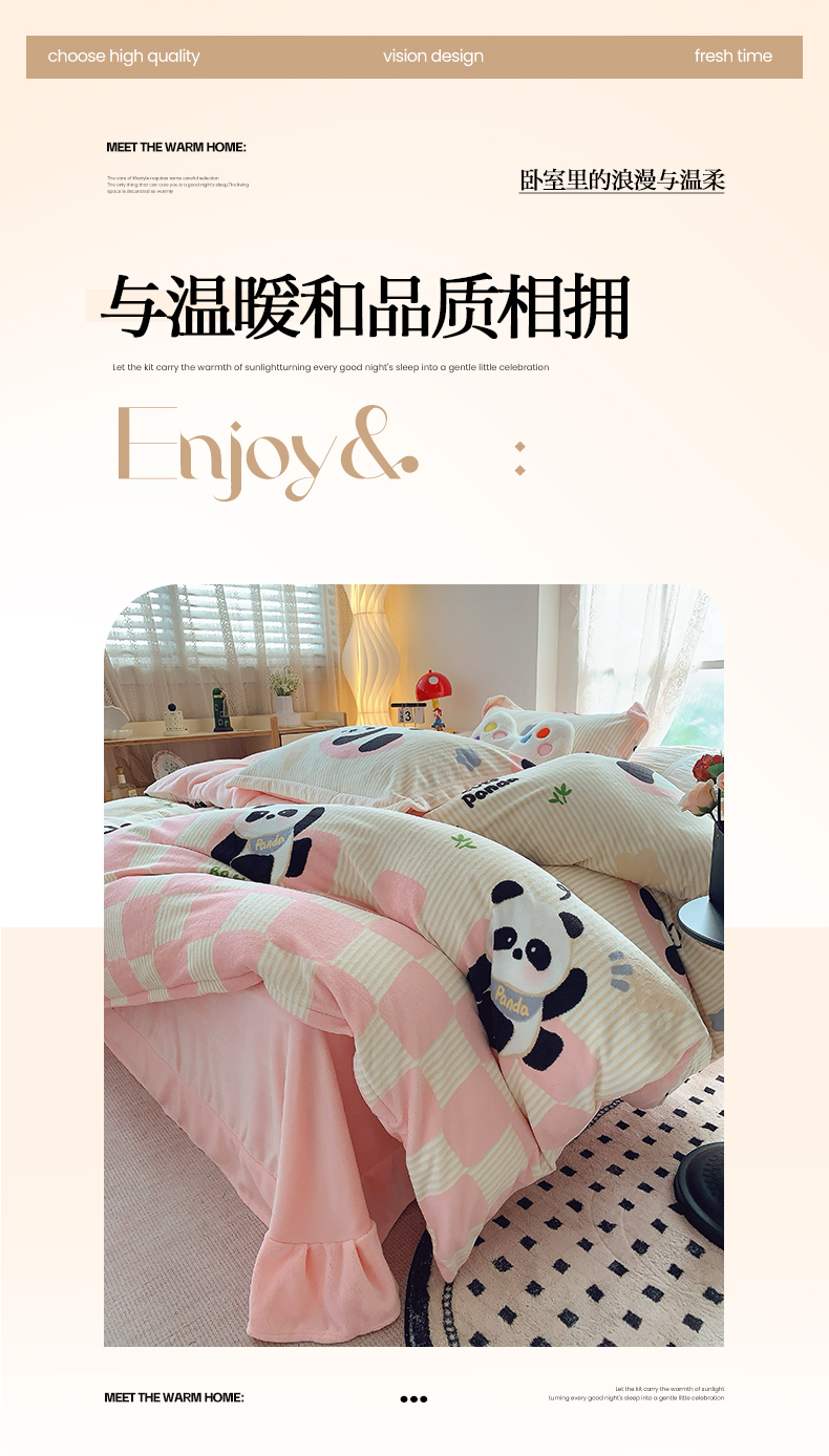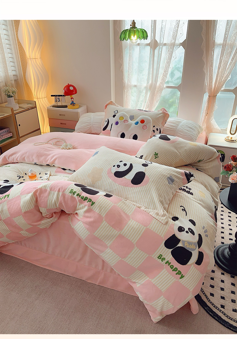 奈萝家纺 2025新款加厚小清新印花牛奶绒三件套四件套 小熊猫粉