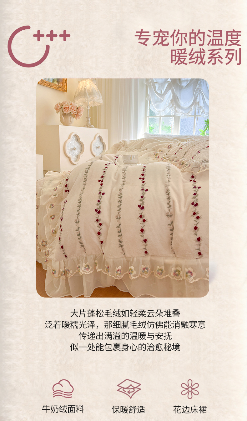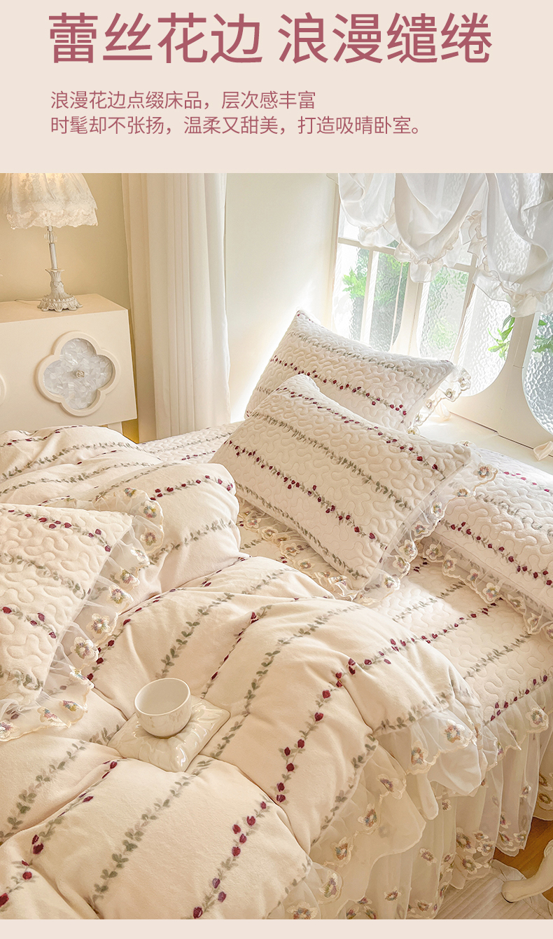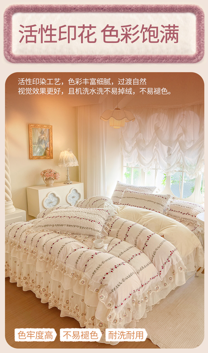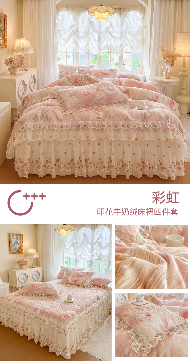 商品名称:网红馆(ck家纺) 2025新款亲肤舒适印花牛奶绒蕾丝边床裙系列四件套 花枝