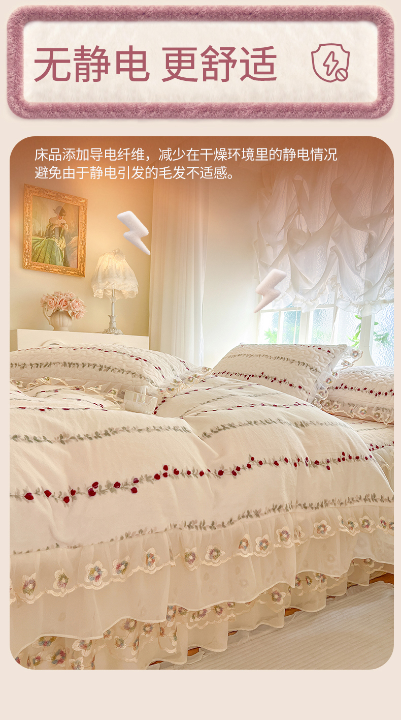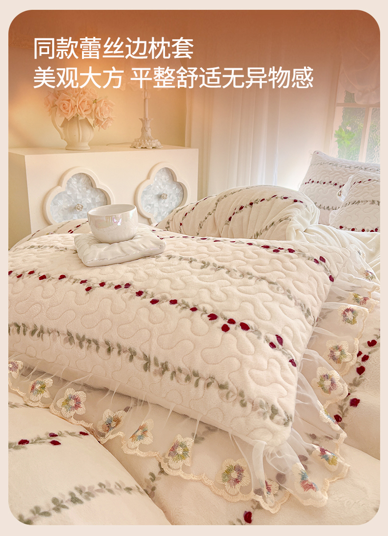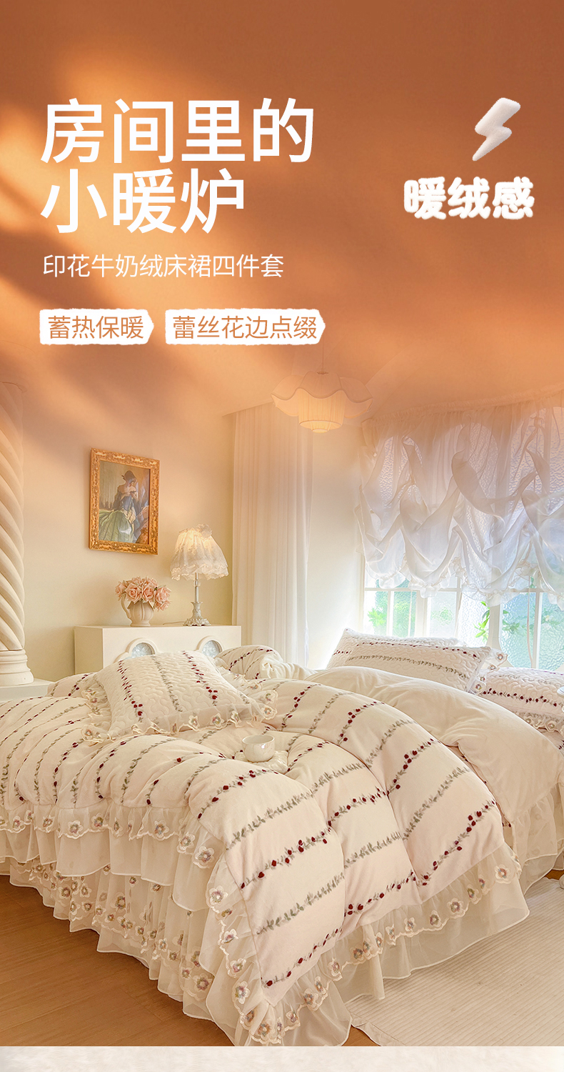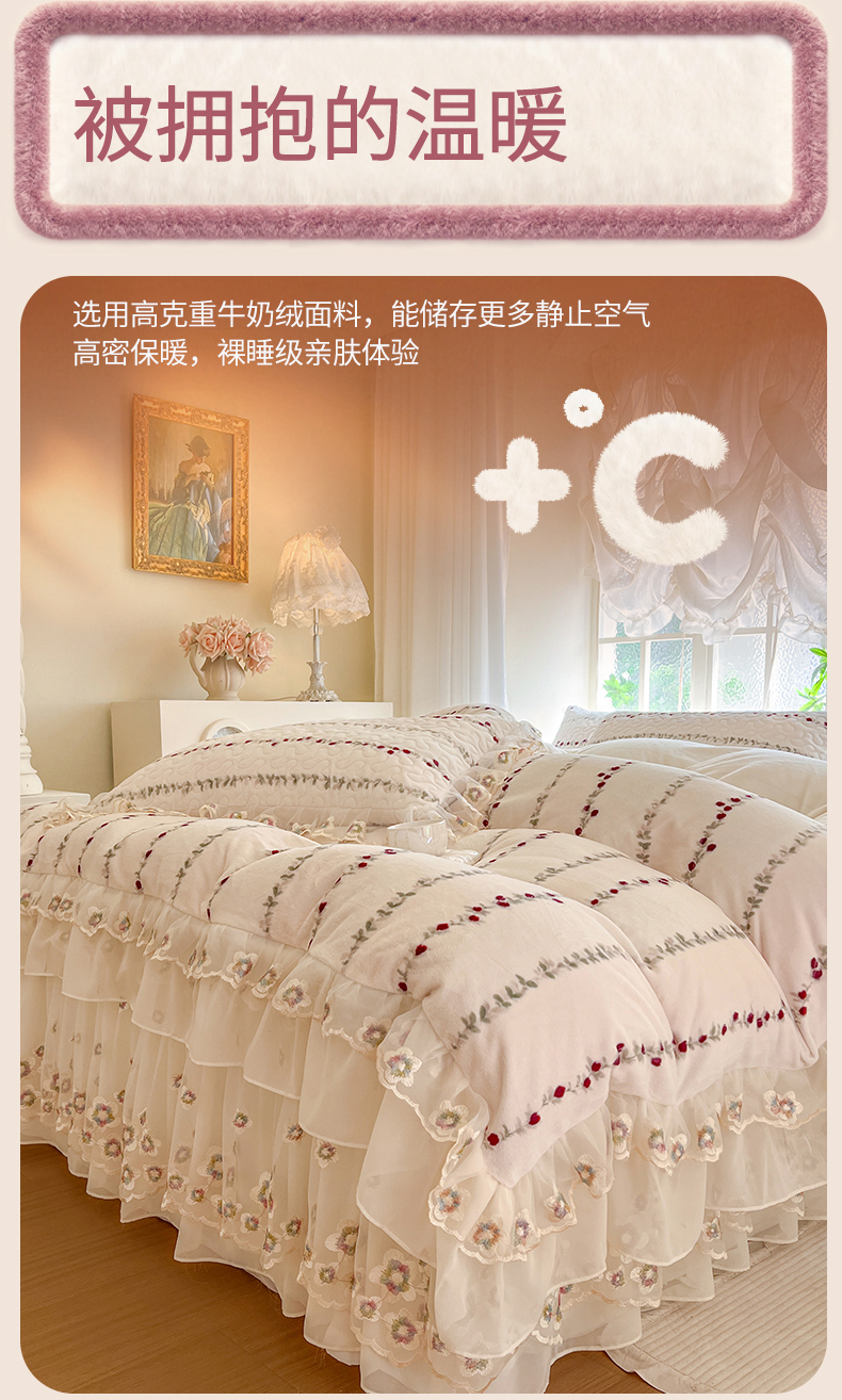 商品名称:网红馆(ck家纺) 2025新款亲肤舒适印花牛奶绒蕾丝边床裙系列四件套 花枝