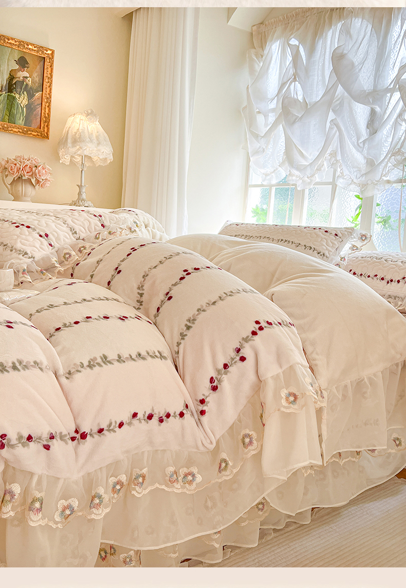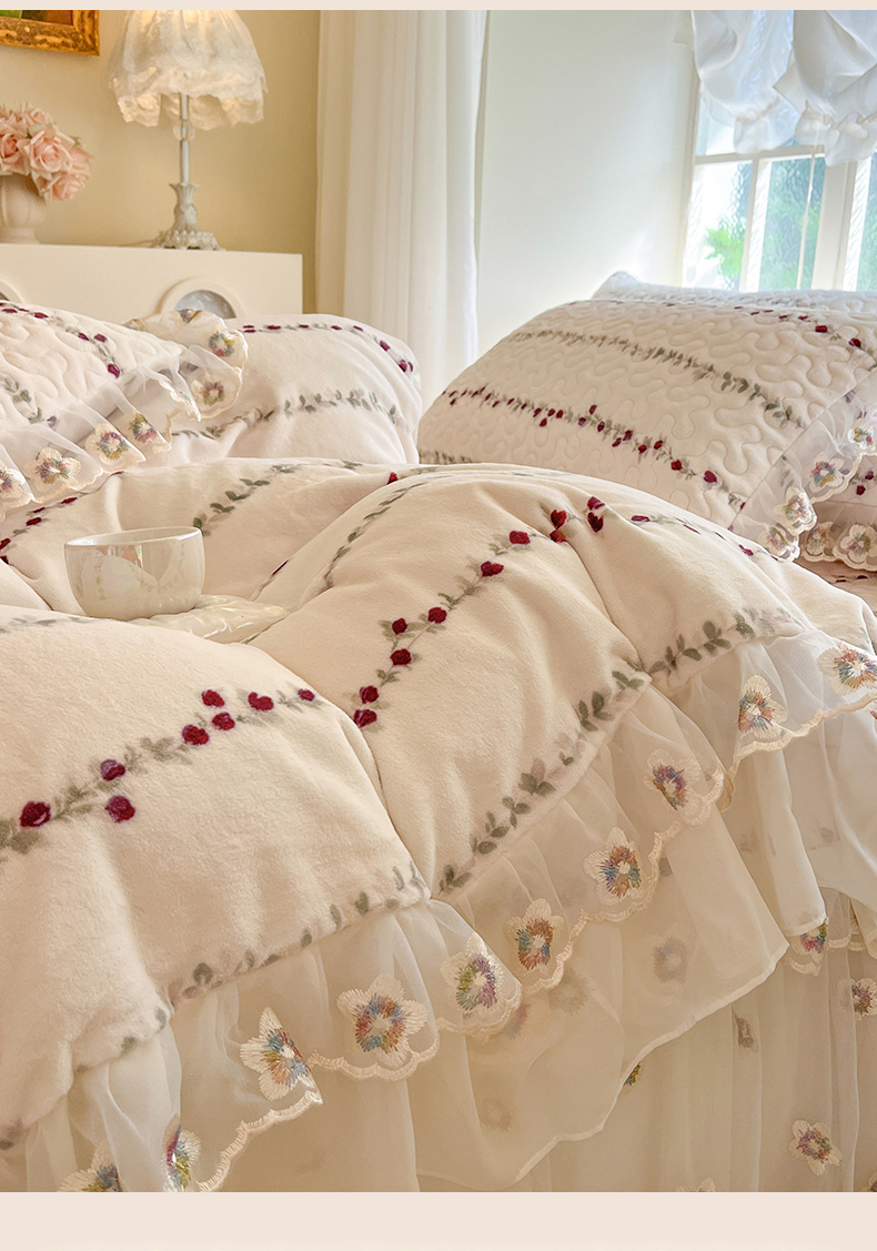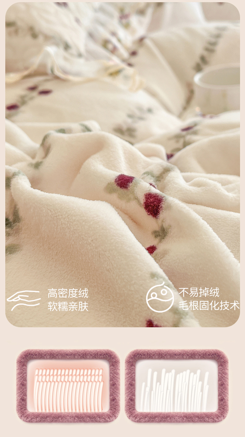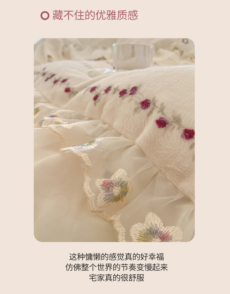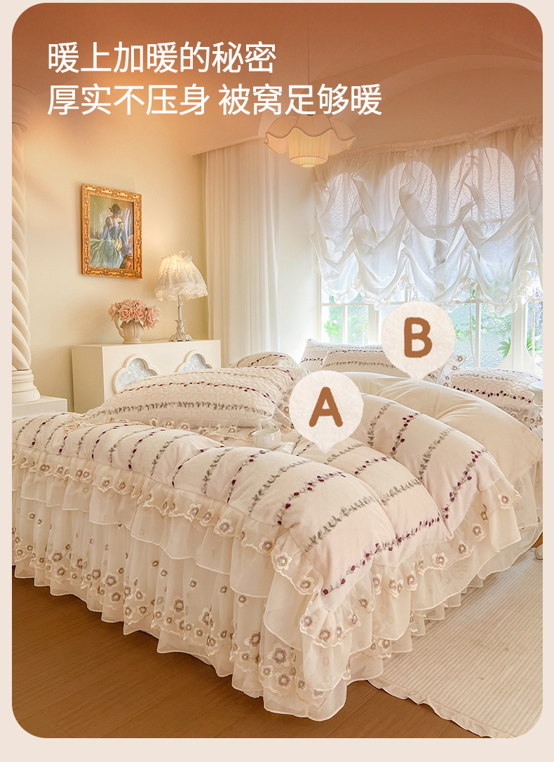 商品名称:网红馆(ck家纺) 2025新款亲肤舒适印花牛奶绒蕾丝边床裙系列四件套 花枝