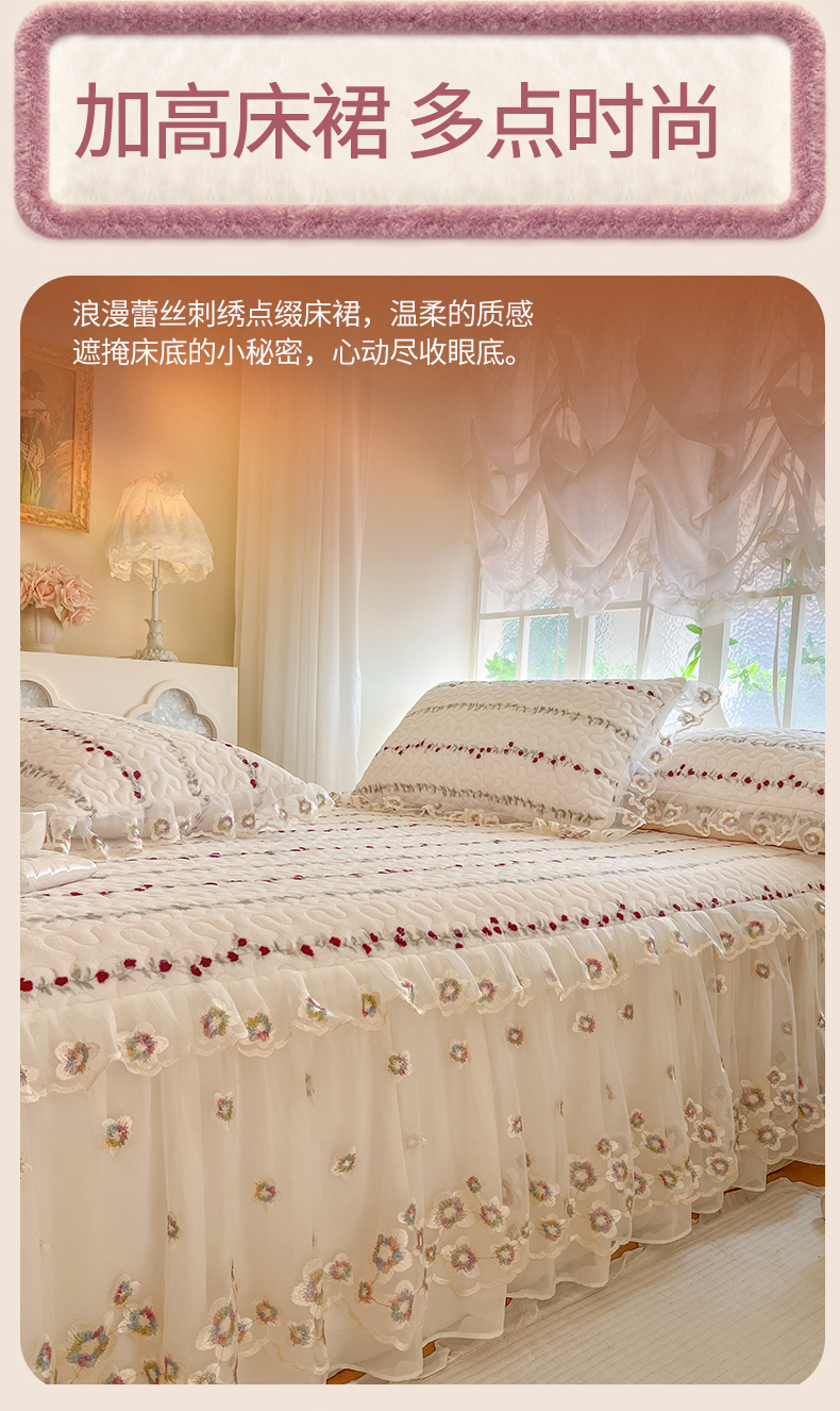 (总)网红馆(ck家纺) 2026新款全棉蕾丝花边床裙款床笠晨暮花间系列,绯红,粉色,麦绿,米色,浅紫,雾蓝