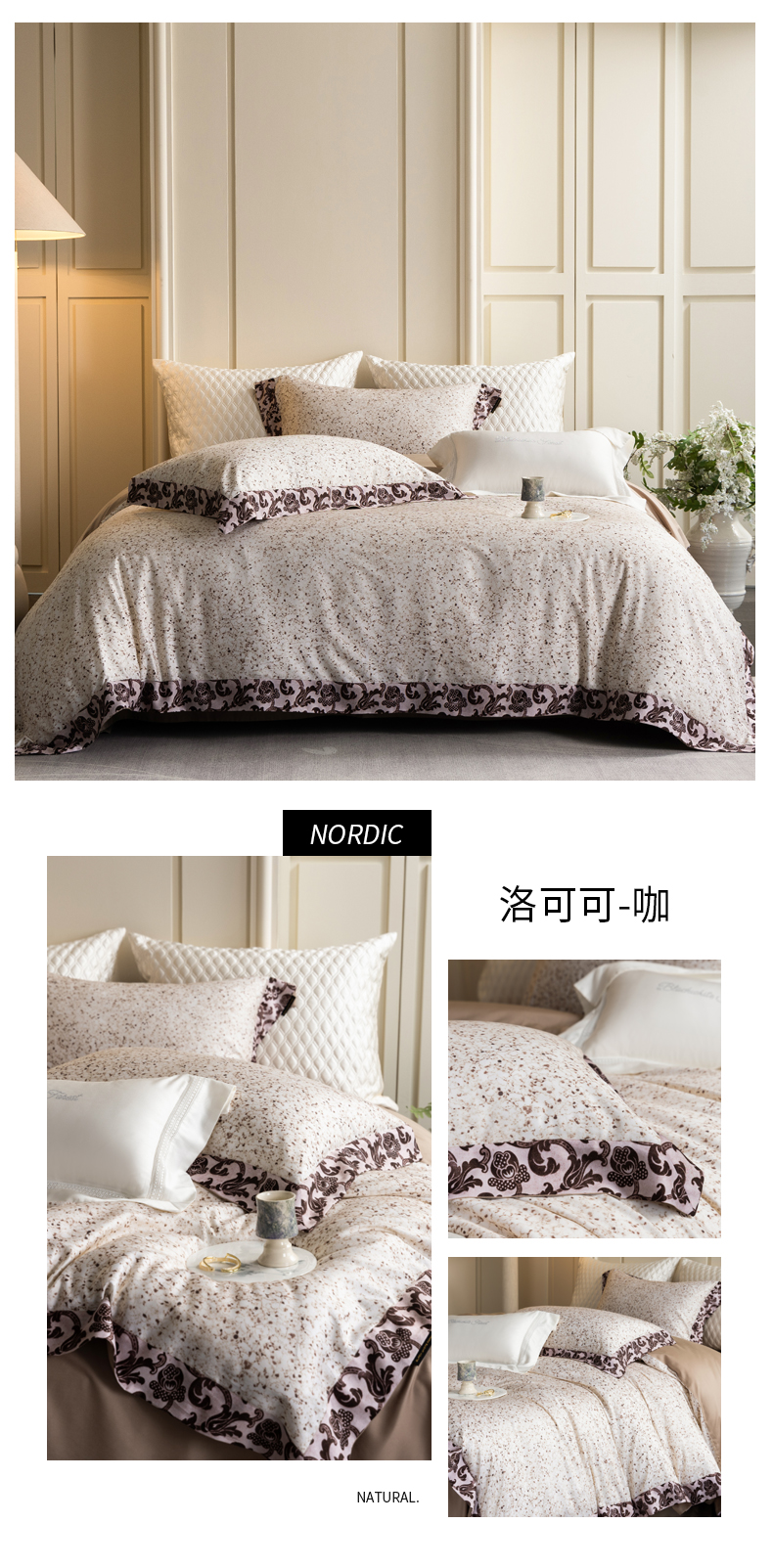 黑白森林2024款 50X50S高支天丝棉数码印花四件套天丝全棉,柚凝咖,柚凝绿,若芙灰,若芙咖