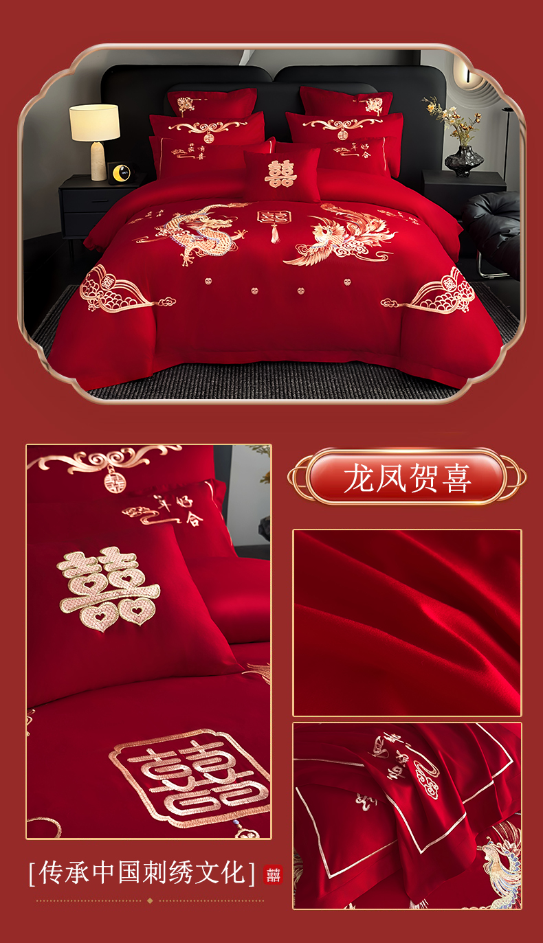 娇伊诗婚庆 2025新款刺绣工艺全棉婚庆四件套系列 龙凤贺喜,龙凤贺喜