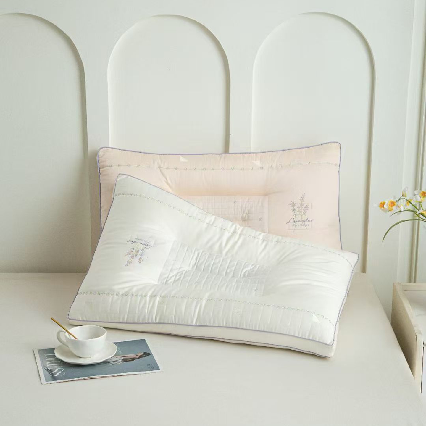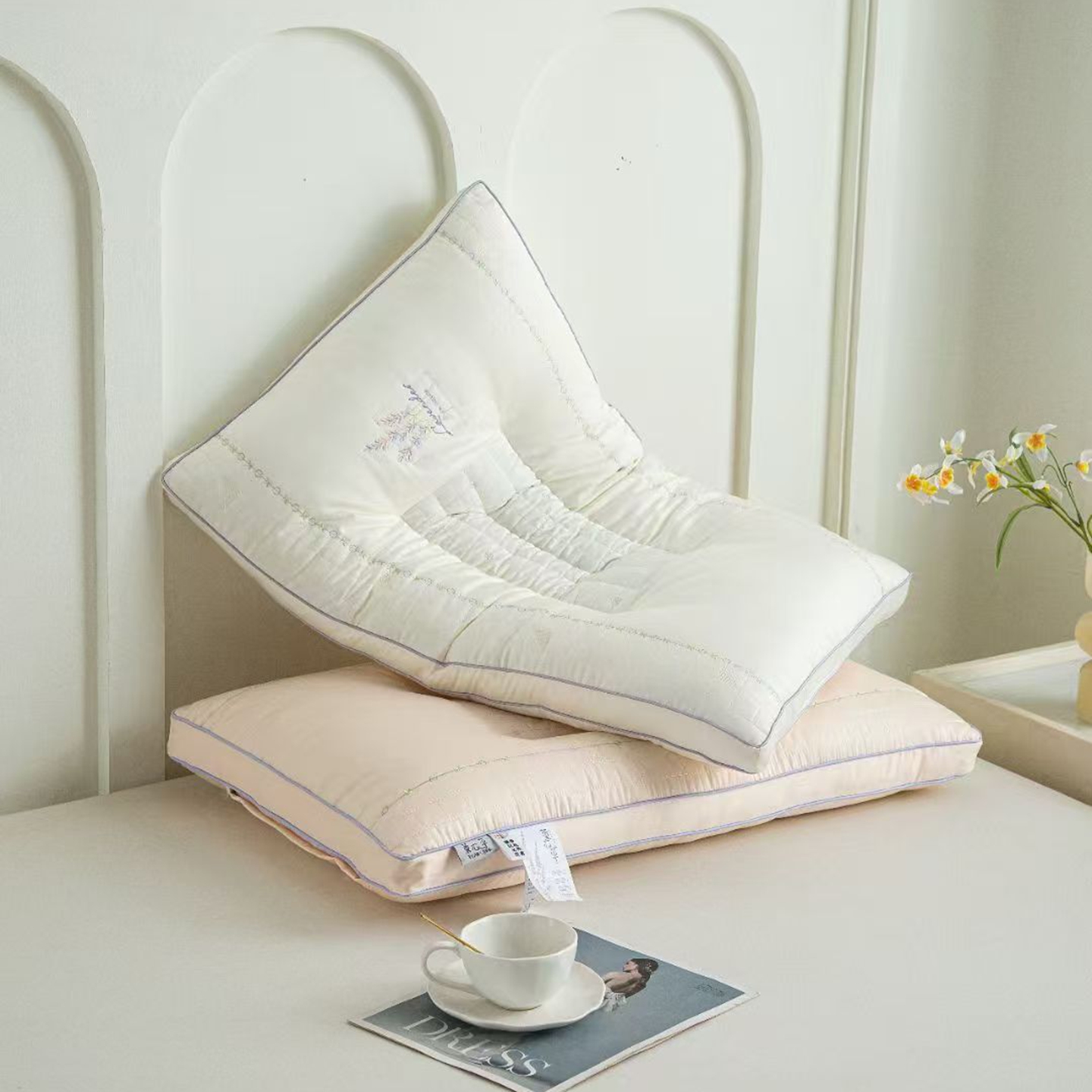(总)剑桥枕业 2026新款提花烫钻H低矮枕芯 柔软矮超薄枕头 学生扁平基础枕头,白色,米色,灰色,粉色