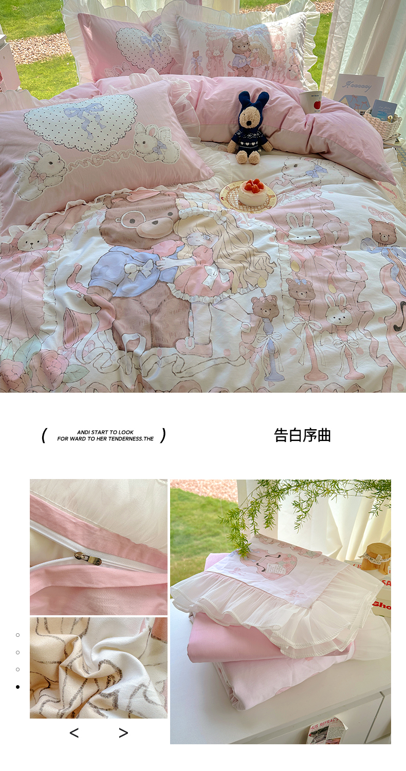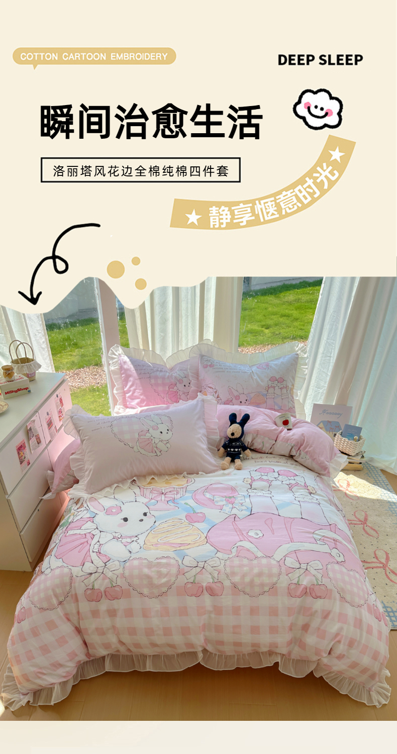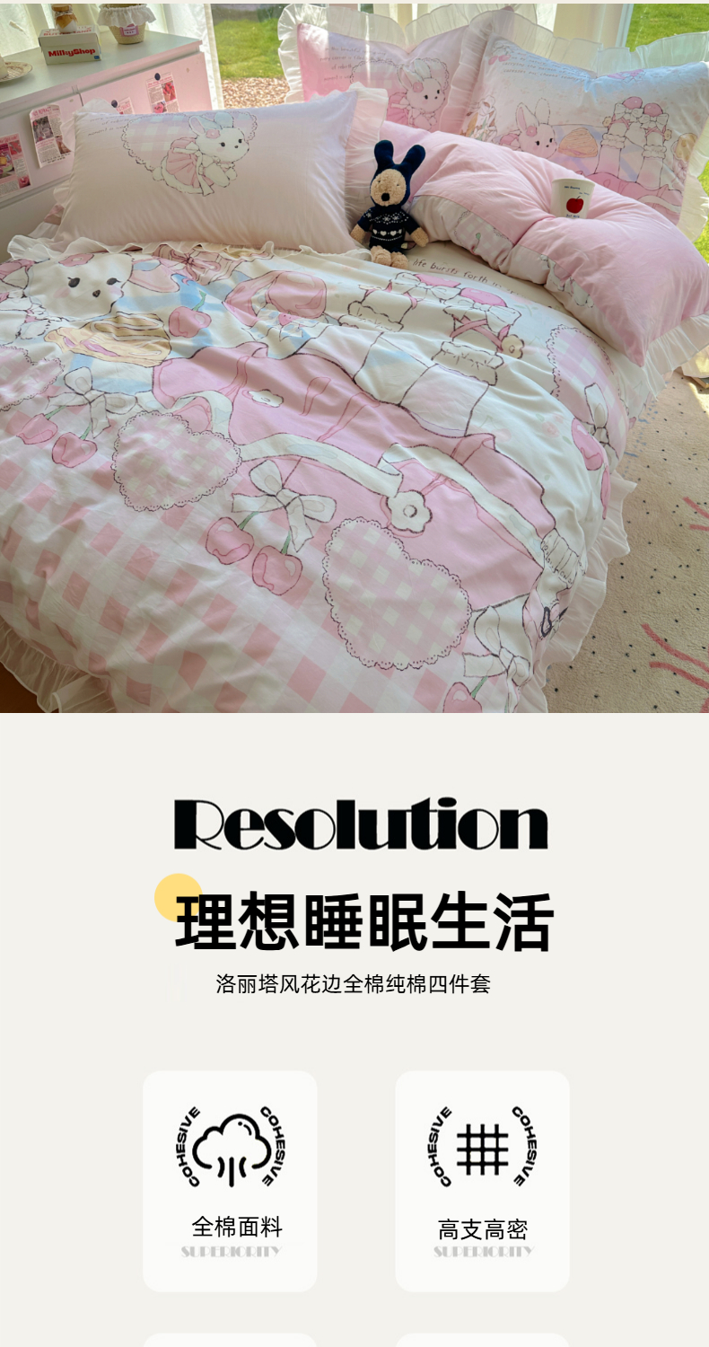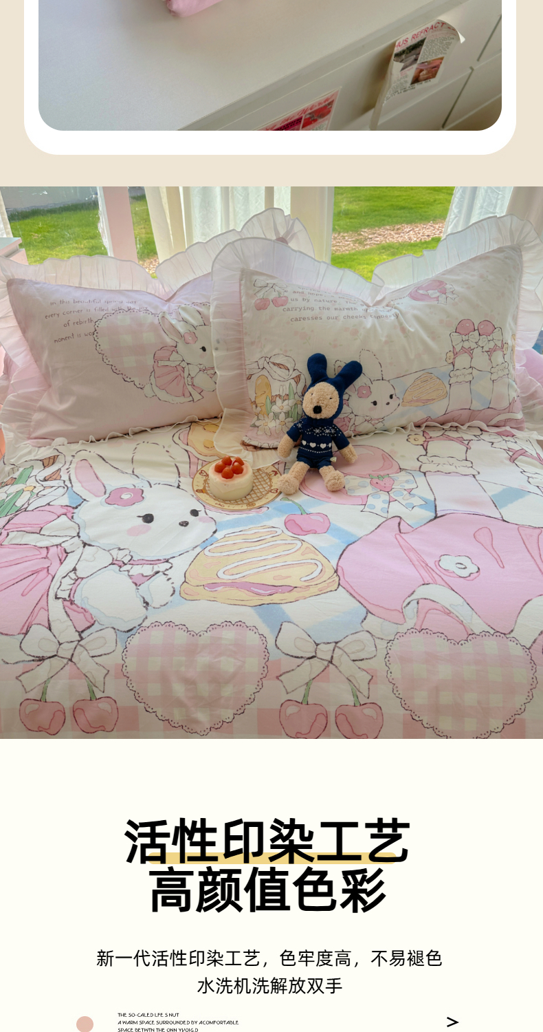 当前位置: 91家纺网 > 商品网购 > 床品套件 > 四件套 > 全棉普通四件套 > 希诺家居 2025新款纯棉洛丽塔风花边韩版萝莉风奶油风可爱卡通全棉四件套 春日出逃