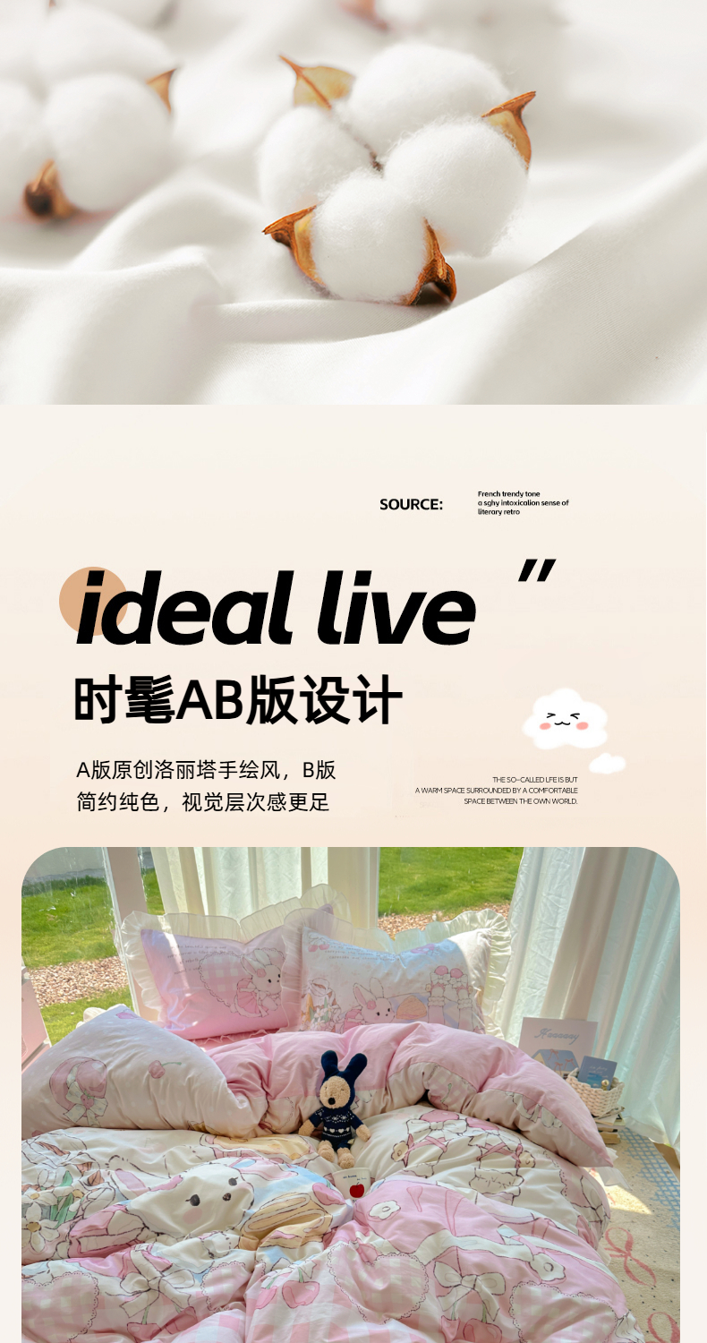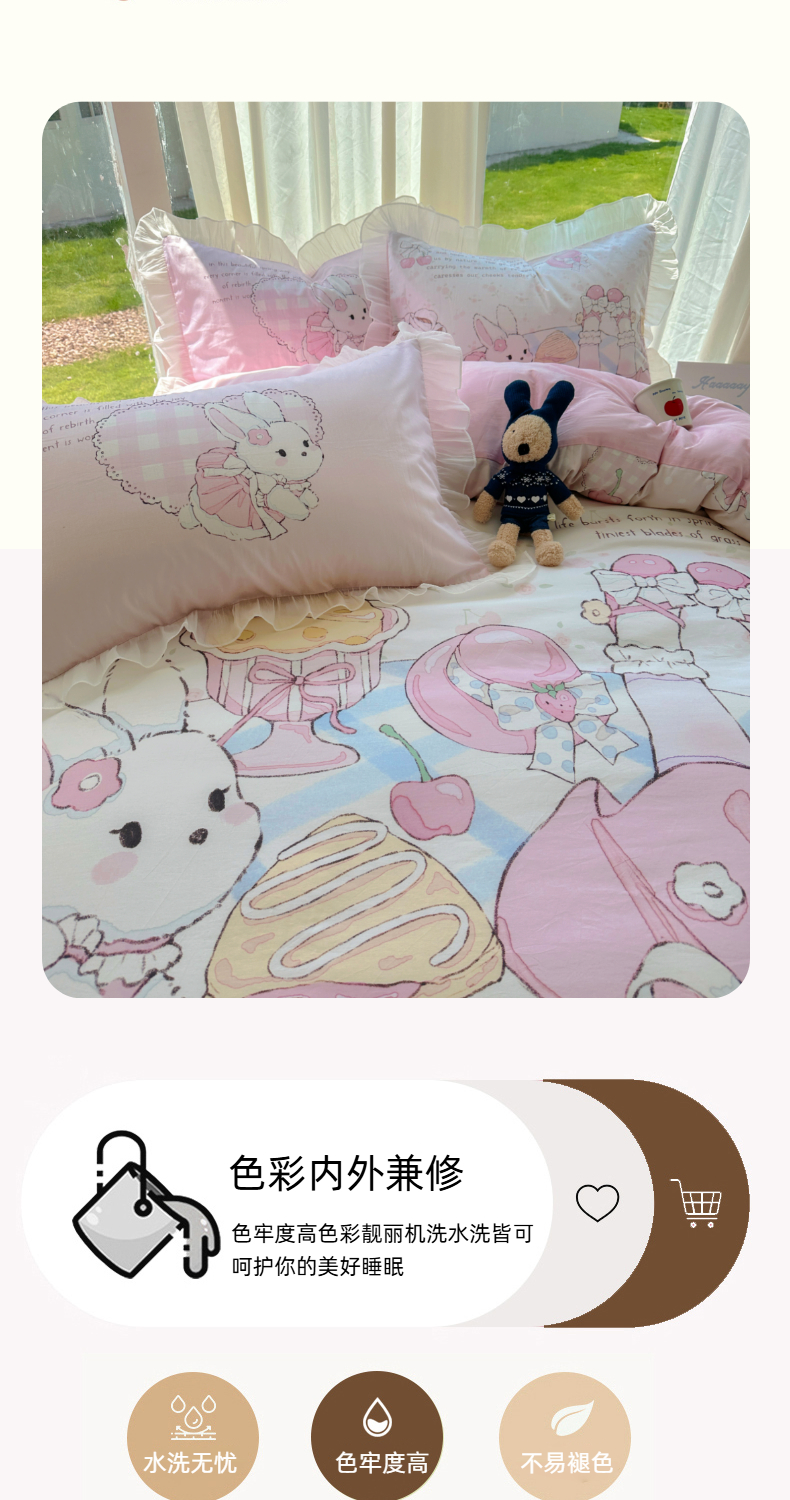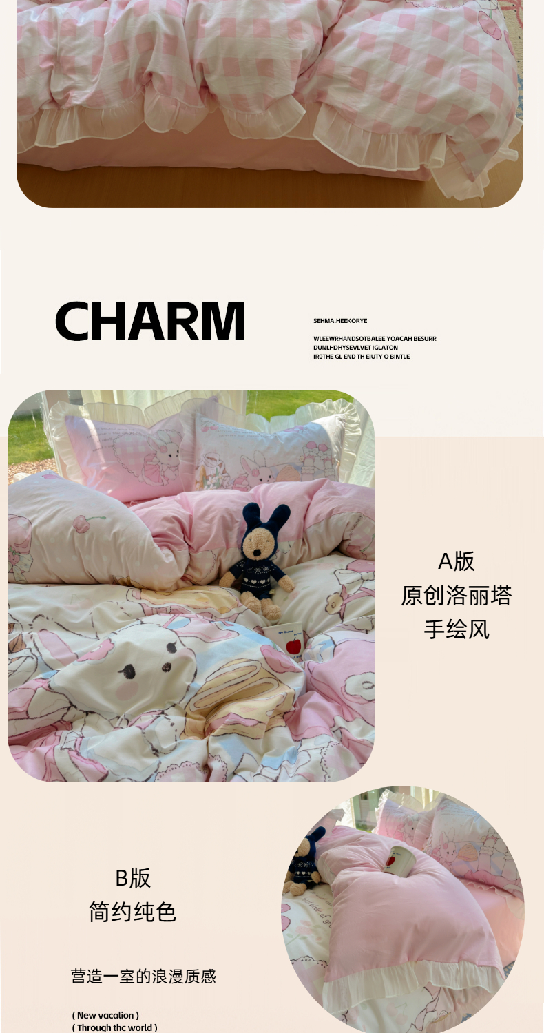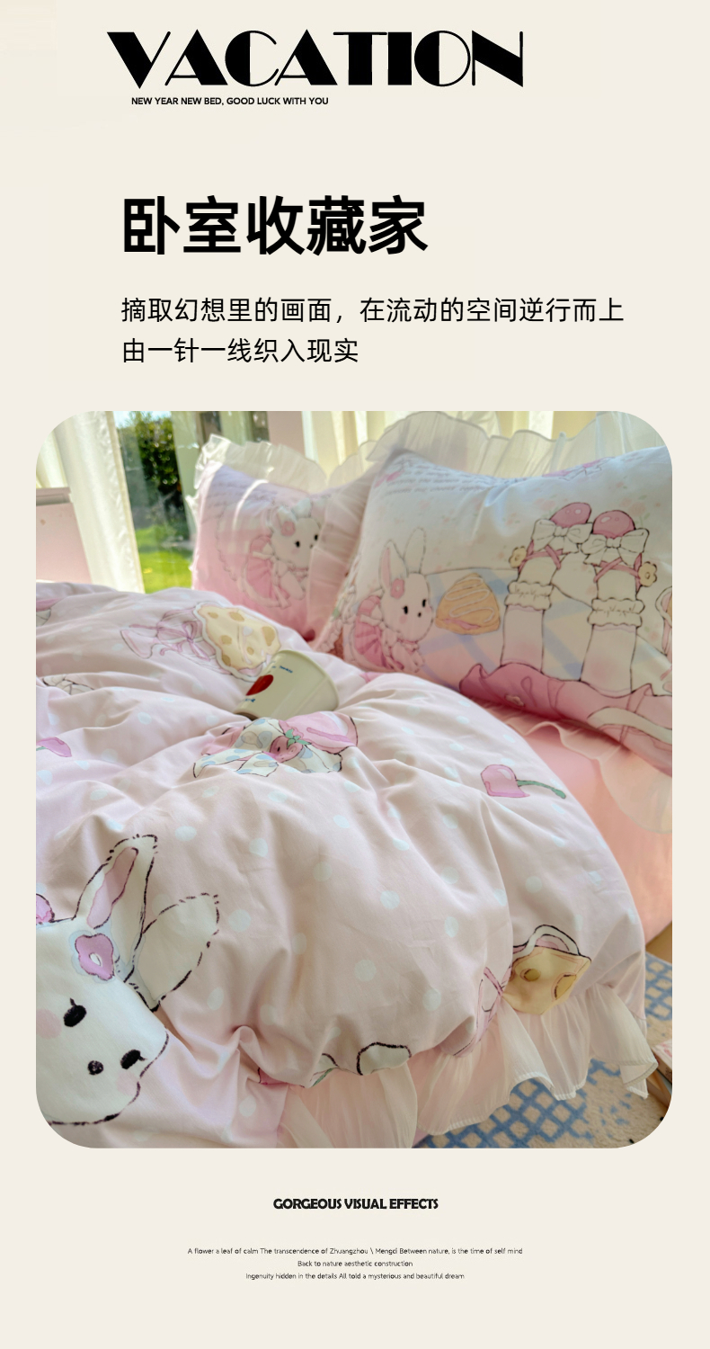 当前位置: 91家纺网 > 商品网购 > 床品套件 > 四件套 > 全棉普通四件套 > 希诺家居 2025新款纯棉洛丽塔风花边韩版萝莉风奶油风可爱卡通全棉四件套 春日出逃