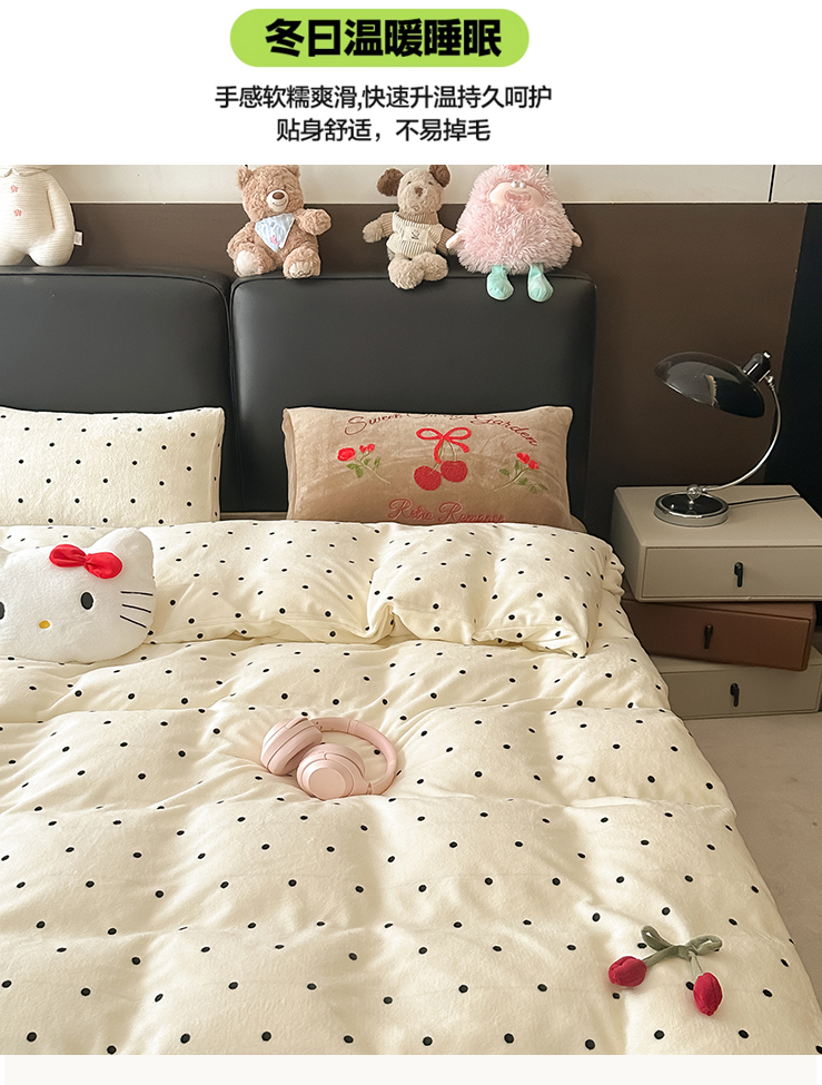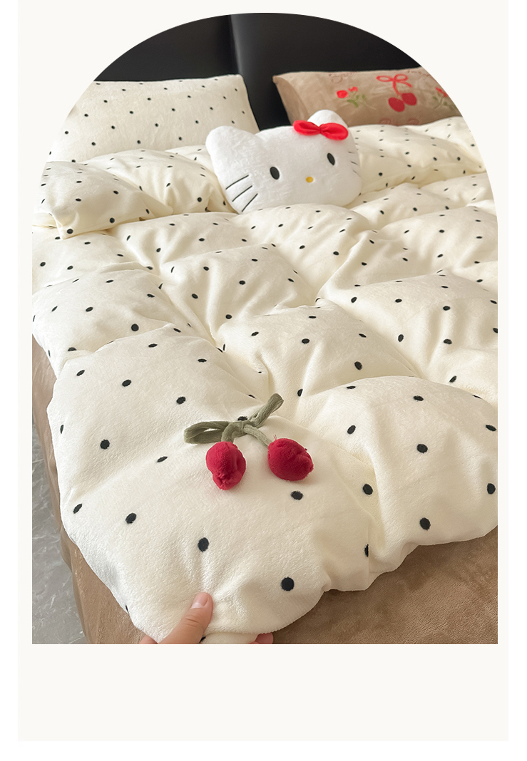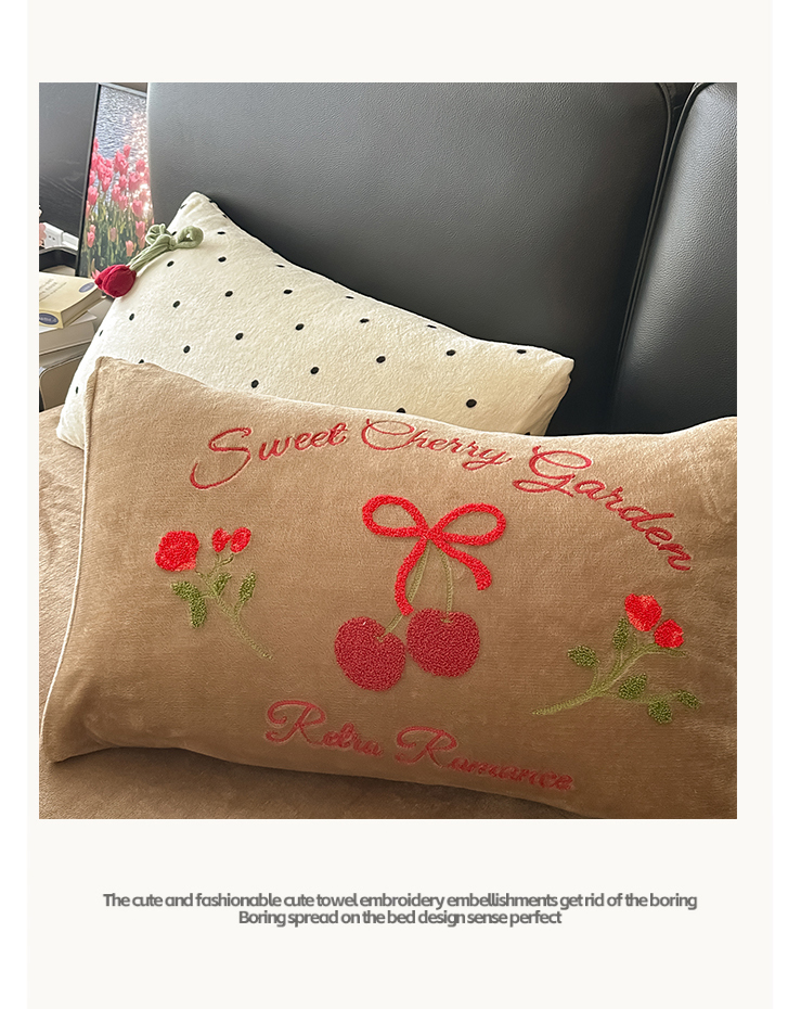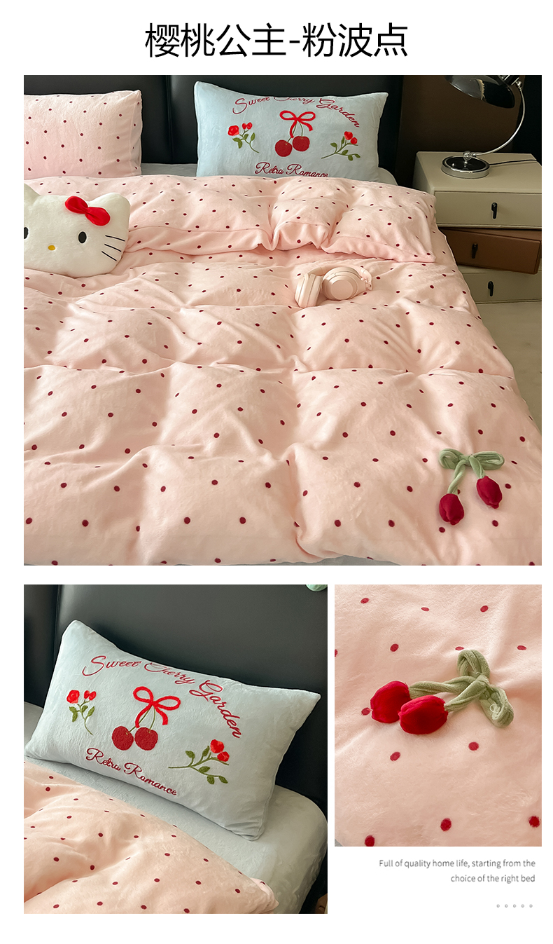 子钦家纺 2025秋冬新款小红书同款加厚牛奶绒樱桃蝴蝶结款毛巾绣床单床笠四件套-樱桃公主 樱桃公主-奶波点