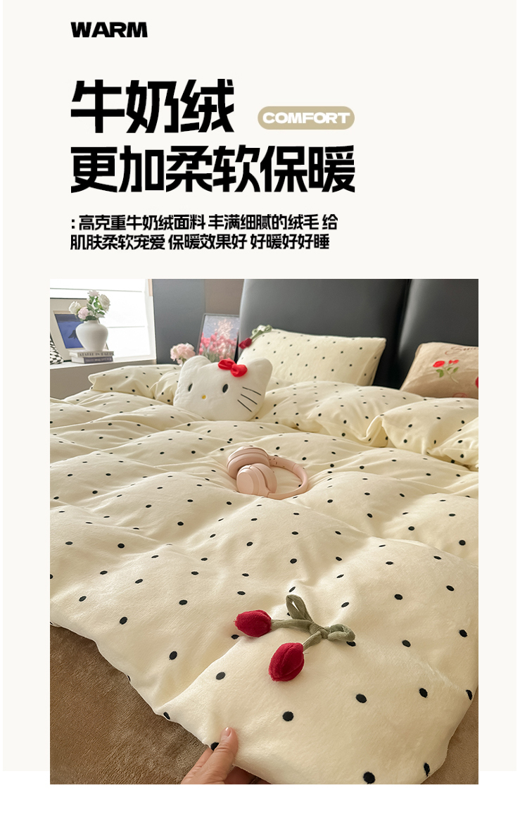 (总)子钦家纺 2023新款赫本风棉加绒牛奶绒四件套,爱心,斑纹,豹纹,蝴蝶结,可爱熊,奶牛,山茶花,神秘花园,素描花,田园风情