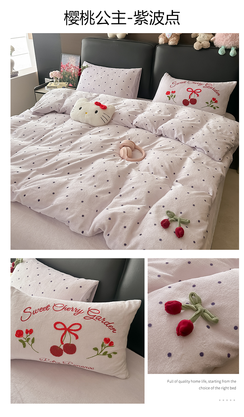 (总)子钦家纺 2025秋冬新款小红书同款加厚牛奶绒樱桃蝴蝶结款毛巾绣床单床笠四件套-樱桃公主,樱桃公主-粉波点,樱桃公主-奶波点,樱桃公主-紫波点