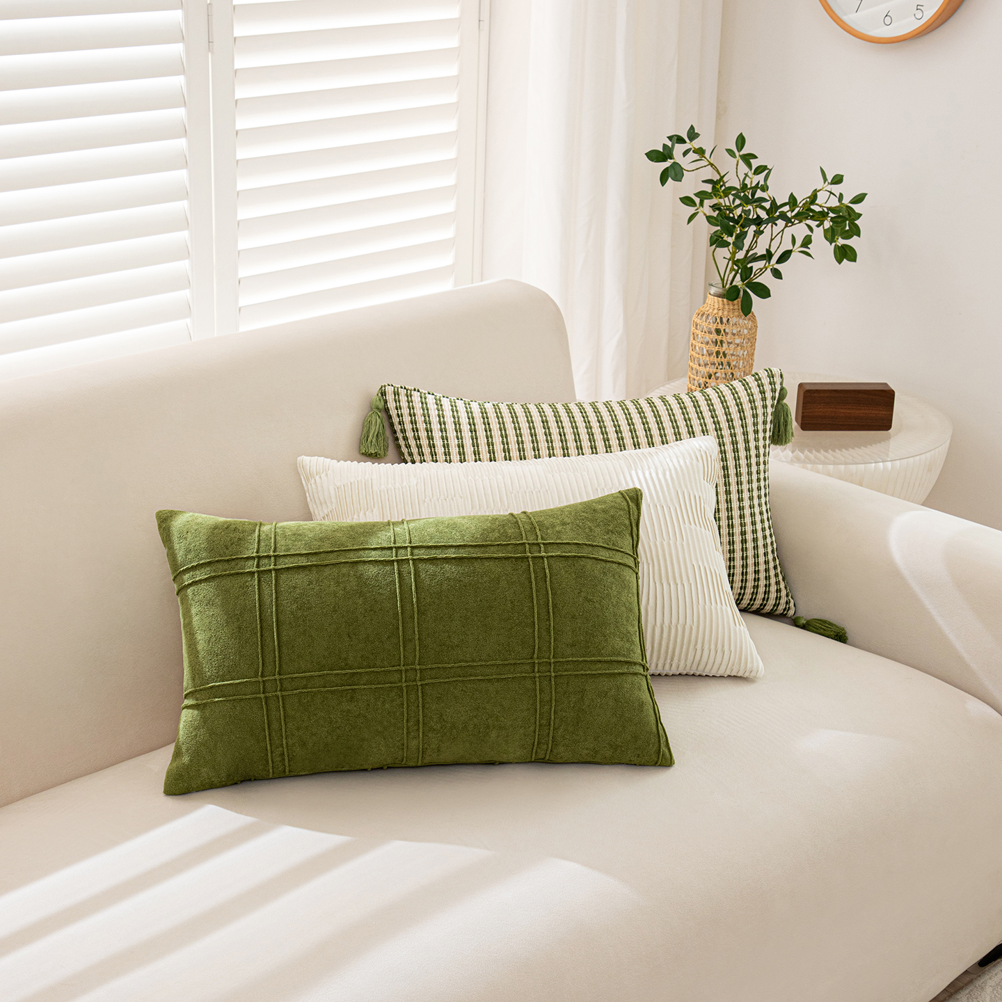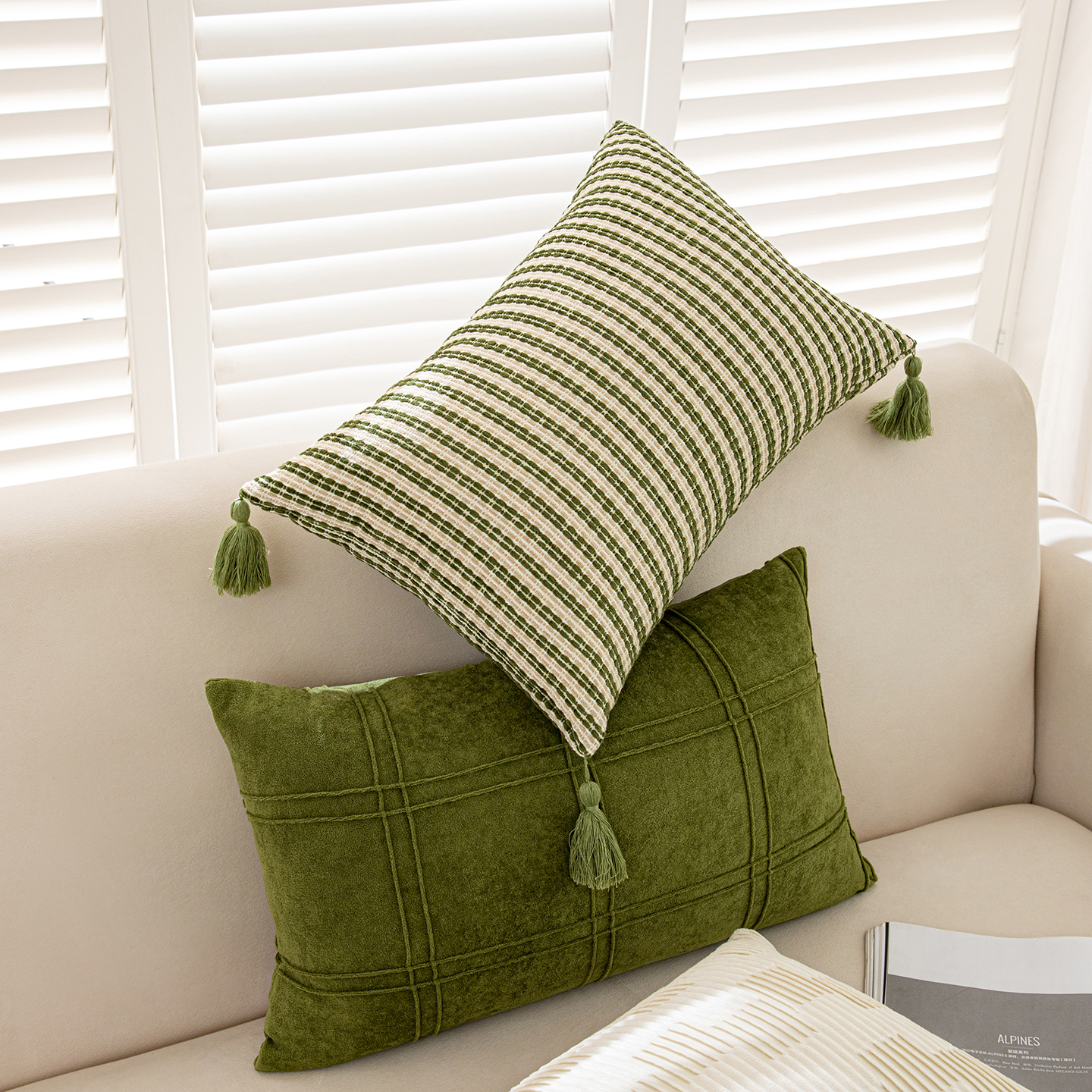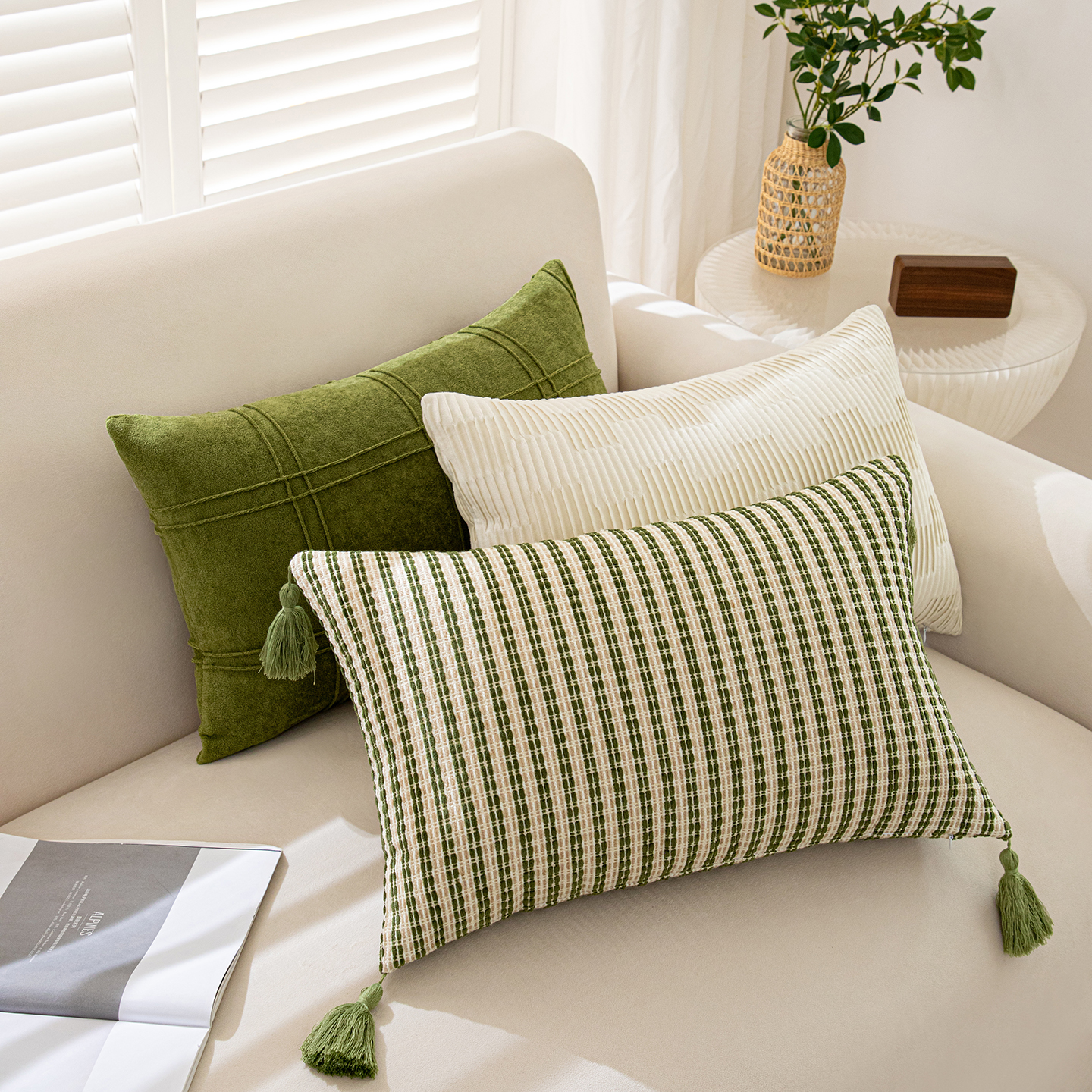 (总)沐沐家纺 2026新款中古风抱枕,墨绿条斜条纹流苏,立体褶皱米白,奶白泡泡,平行空间绿,组合